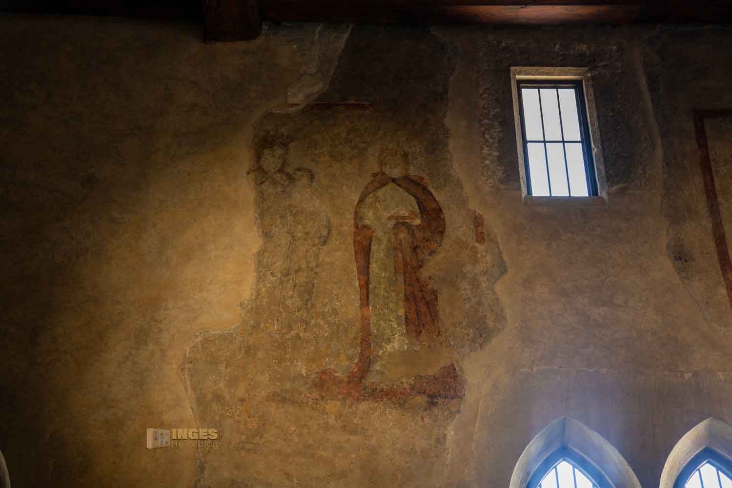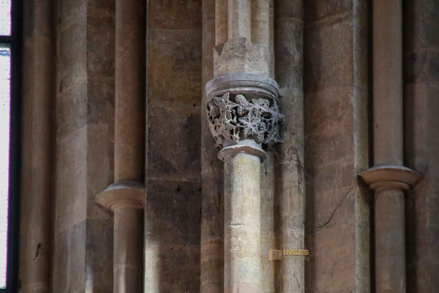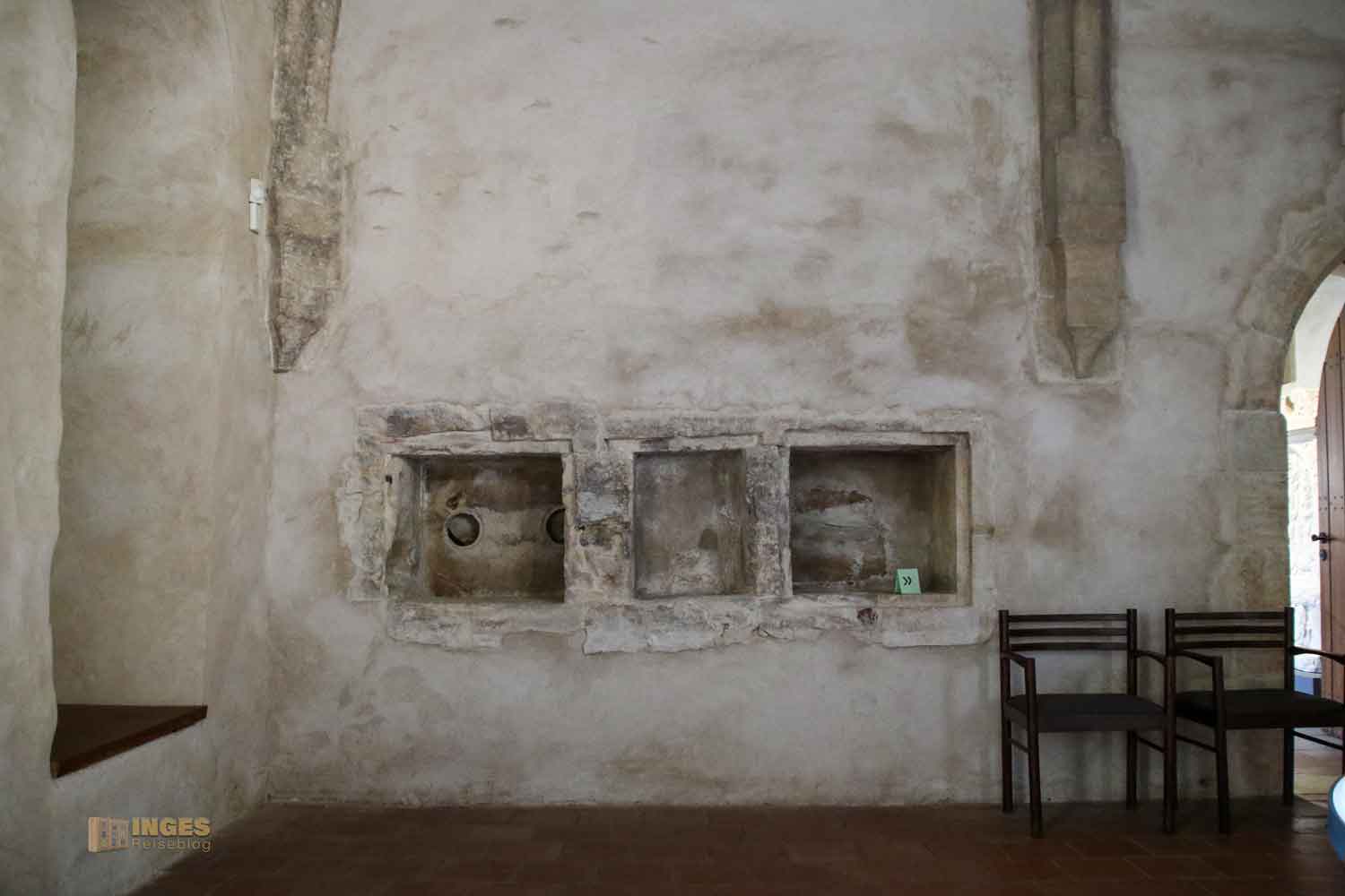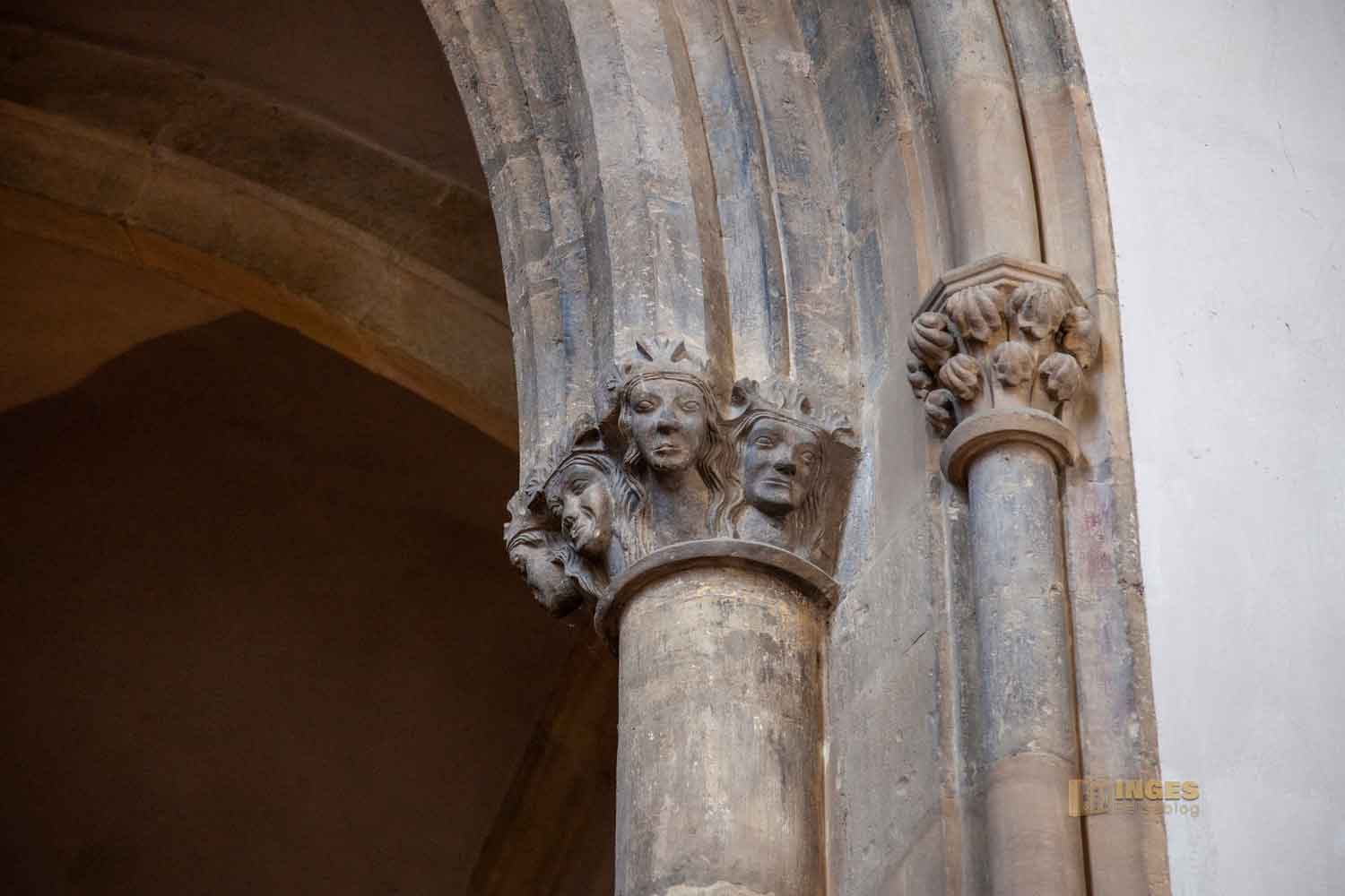 Einen Blick verdient auch der Kapitellschmuck, vor allem am Rundbogen der Kirche. Fünf gekrönte Köpfe zeigen sich, links weibliche, recht männliche Häupter. Es wird vermutet, dass sie auf das Herrschergeschlecht hindeuten.