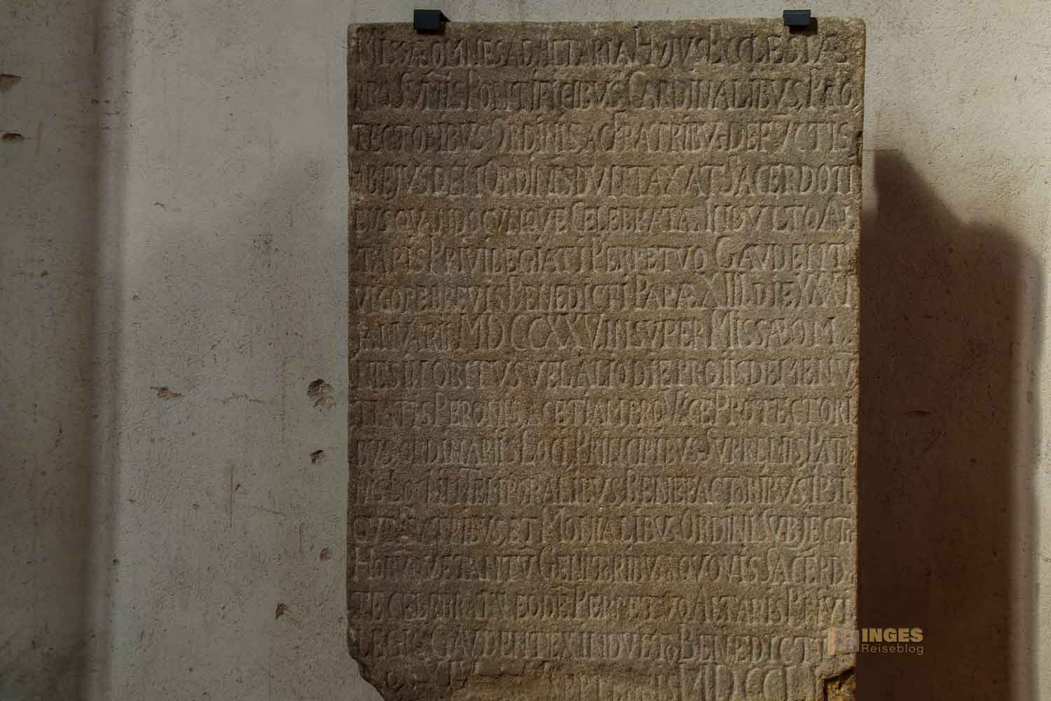 Mitten im Chorraum entdecke ich eine schlichte Grabplatte. Nach einem Stammbaum an den Wänden des Klosters und meinen Recherchen kommen jetzt meine nächsten Stauferspuren in Zusammenhang mit dem Kloster -