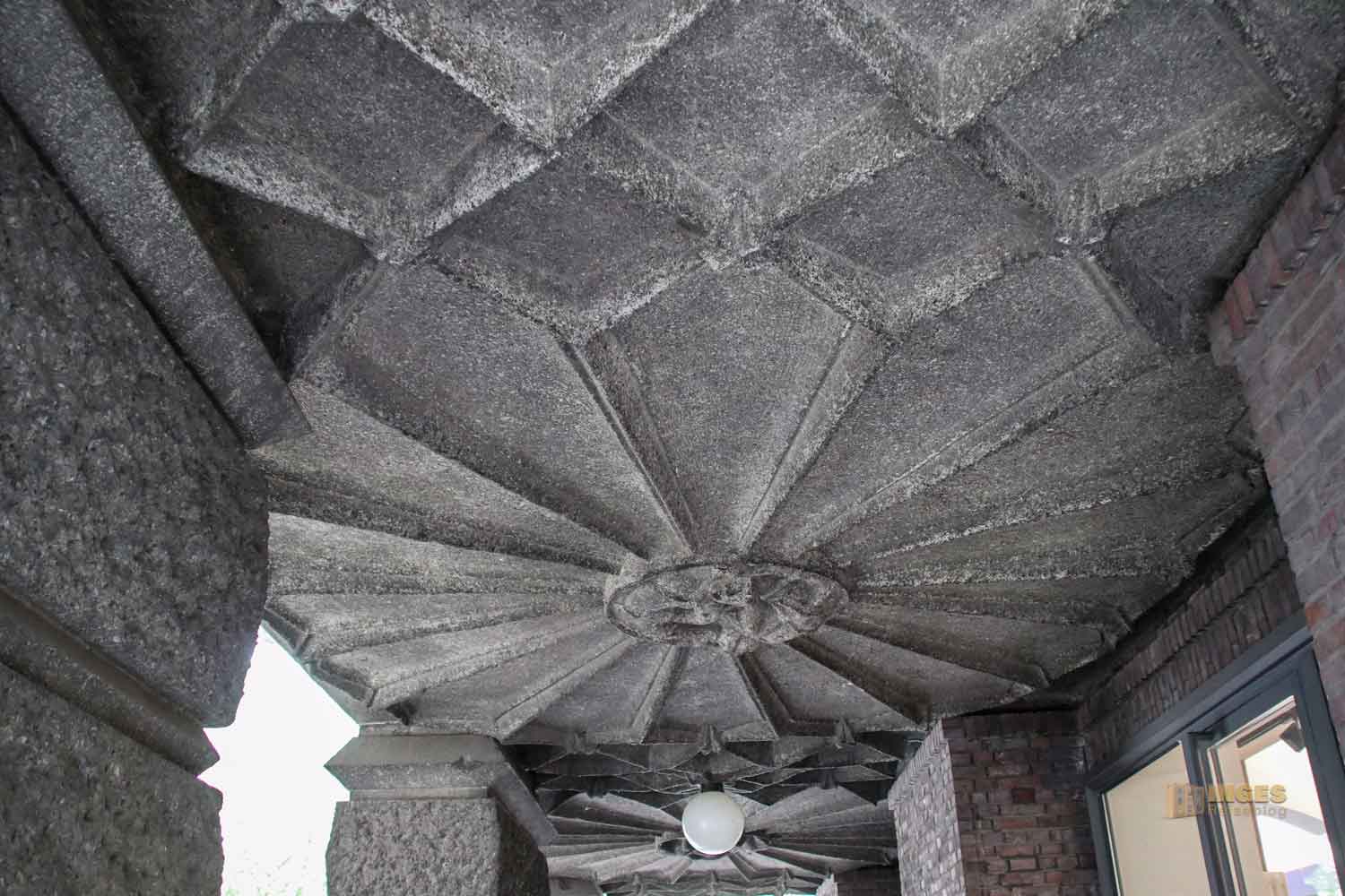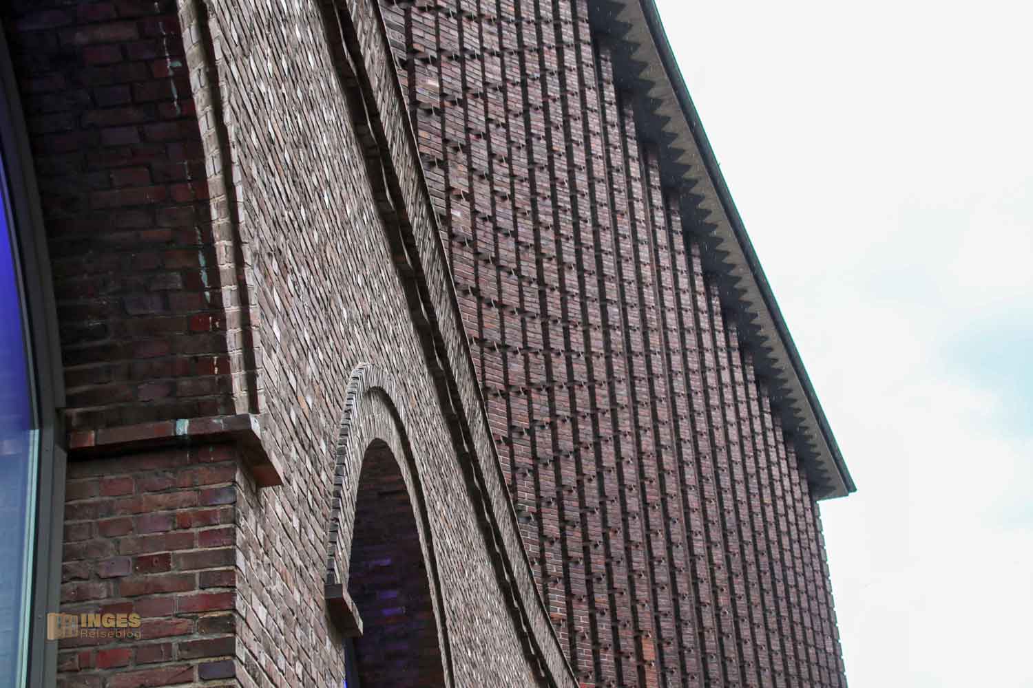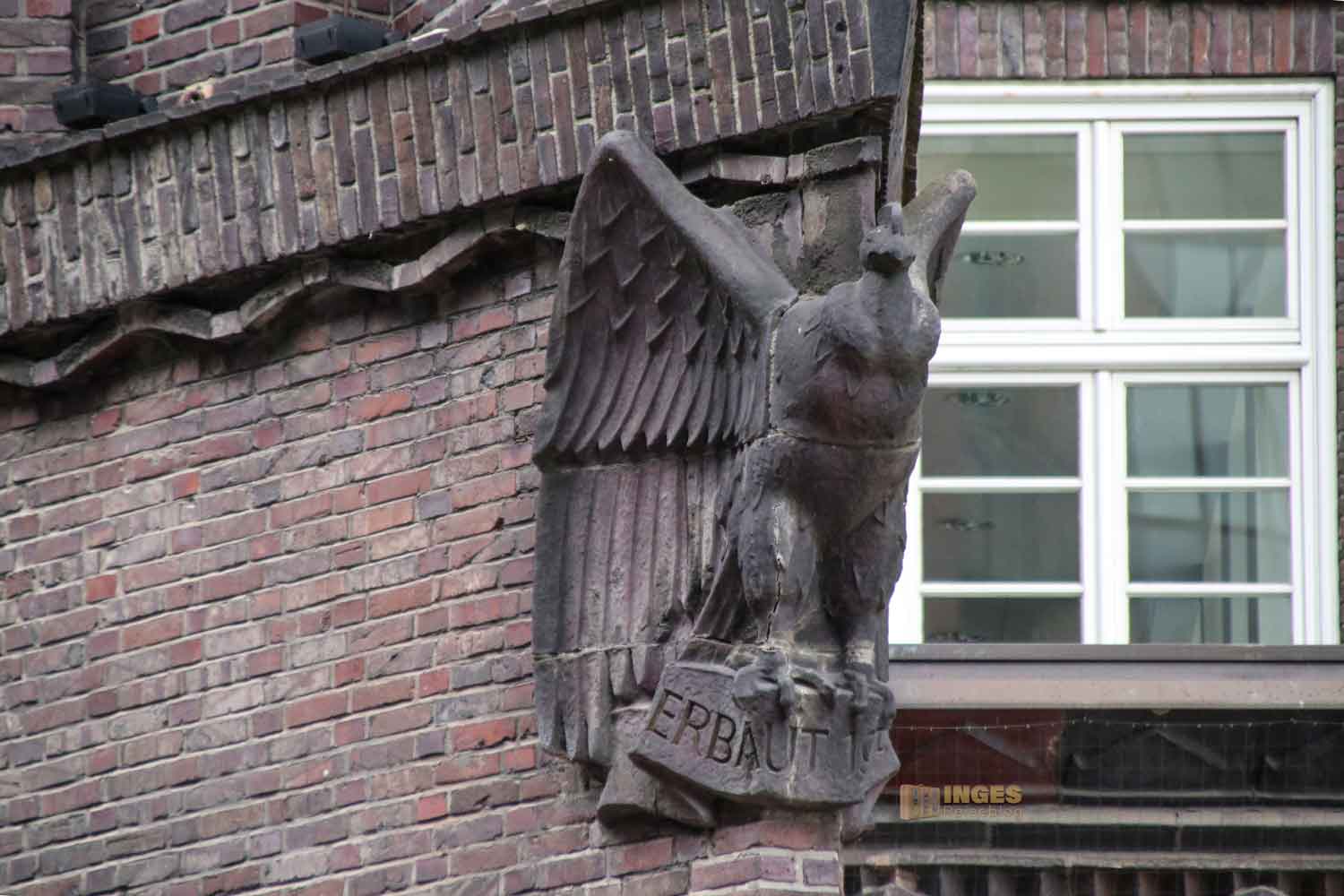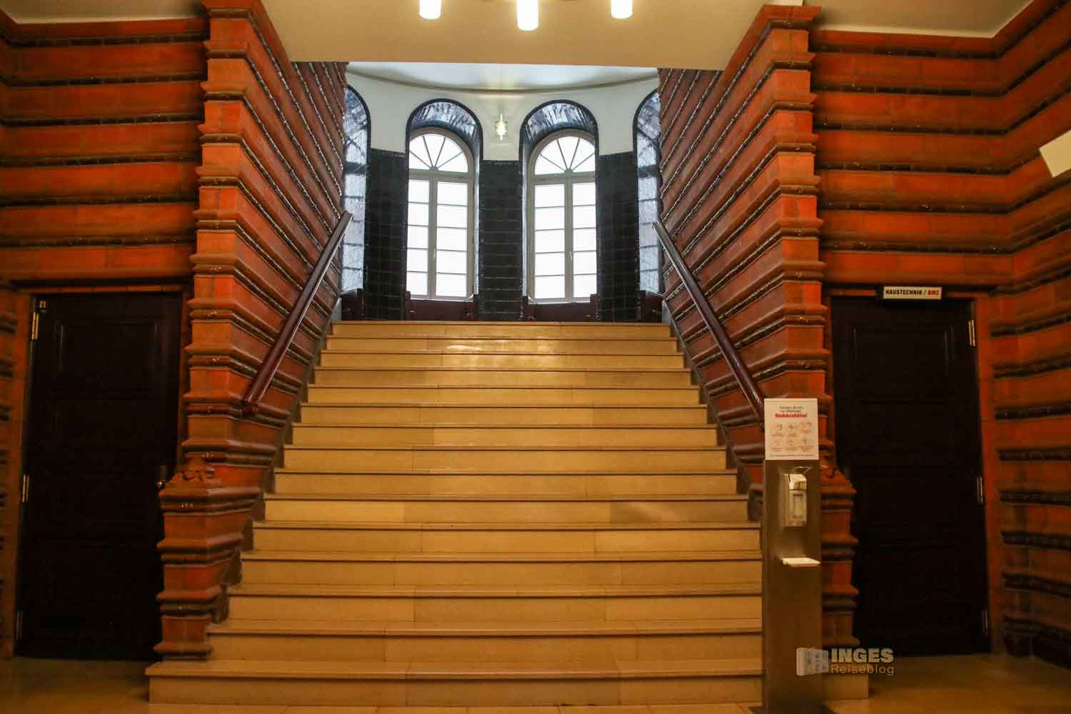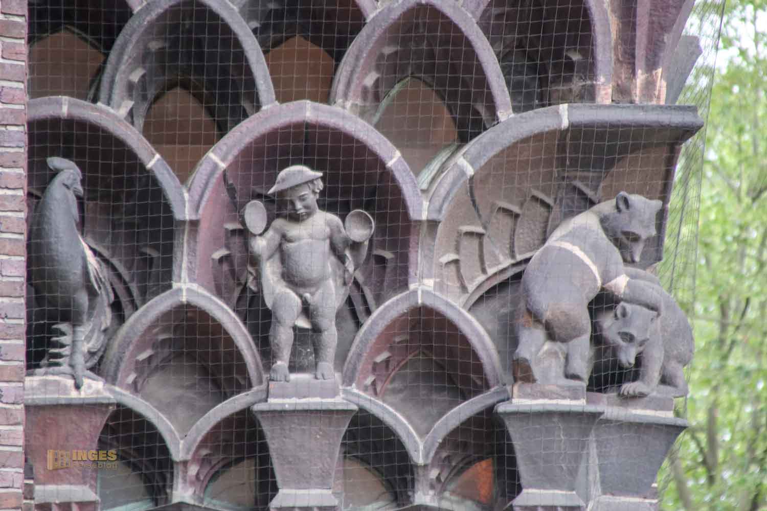 Wenn ihr besseres Wetter habt, dann könnt ihr drei Innenhöfe in diesem großen Komplex bewundern. Wir haben verzichtet, der Regen wurde mittlerweile stärker. Einen langen Blick bekam aber die Fassade des Klinkerbaus, den Ornamente mit Symbolen von Handel und Handwerk zieren.
