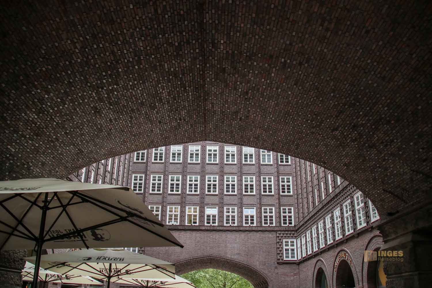 Während in den großen Kontorhäusern die Mitarbeiter von über 700 Unternehmen arbeiten, kann man es sich zwischen den Backsteinbauten gemütlich machen. Viele Restaurants und Cafés laden zu einem kurzen Verweil ein, Geschäfte bieten ihre Waren an. Das aber nicht nur in den Straßen, sondern auch in den Innenhöfen, so wie auch hier im Chilehaus.
