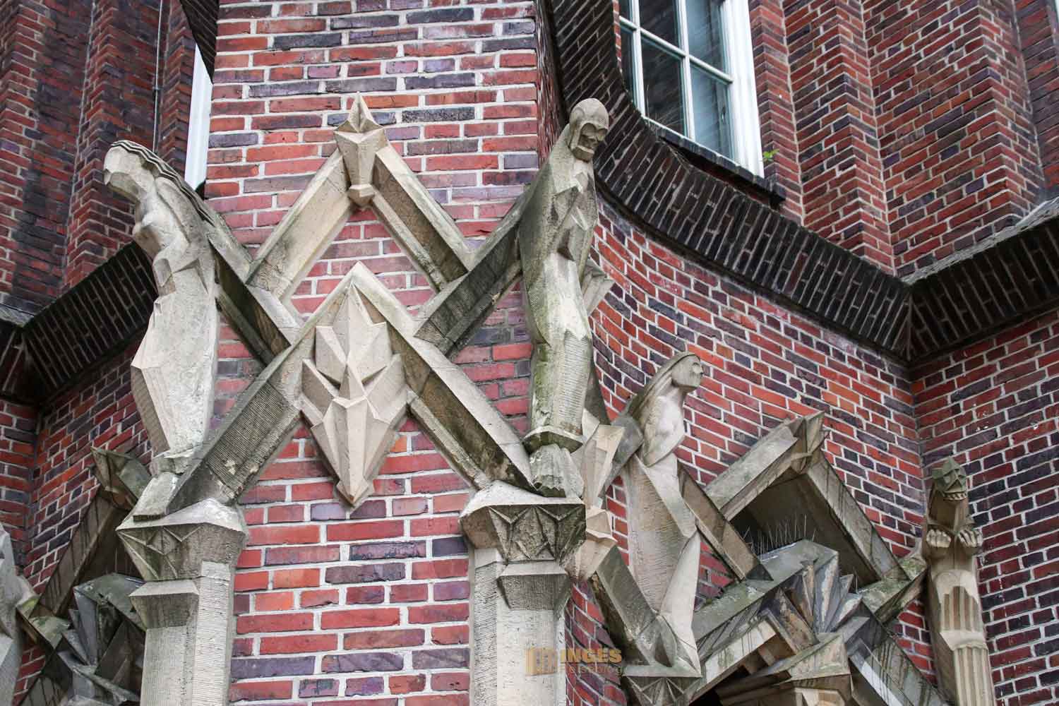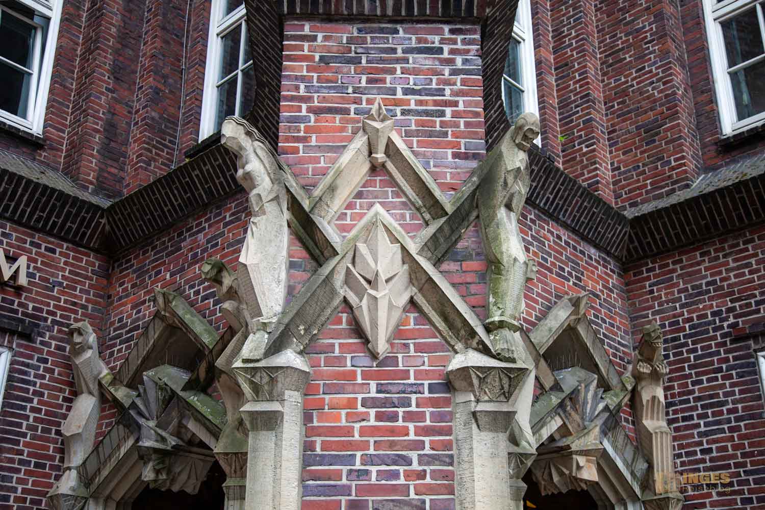 Links und rechts von ihm zieren Plastiken den Bug, typisch als Verzierung für die Kontorhäuser