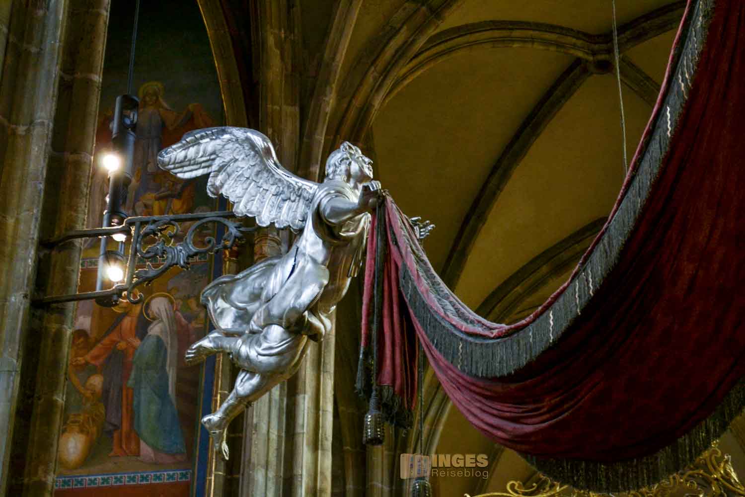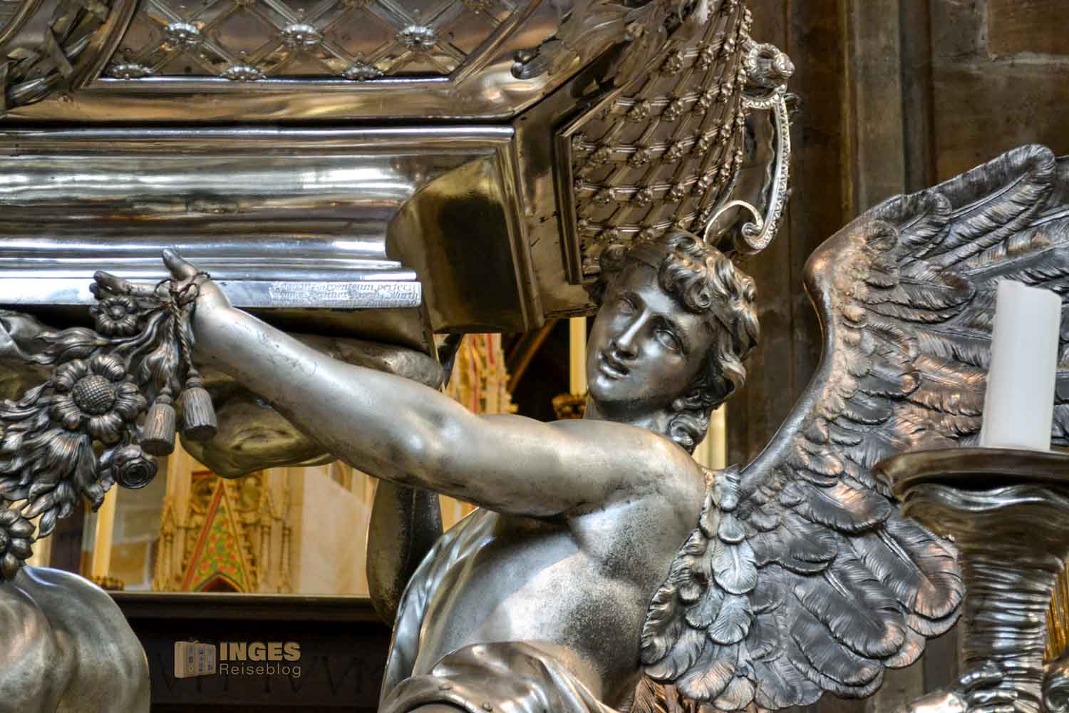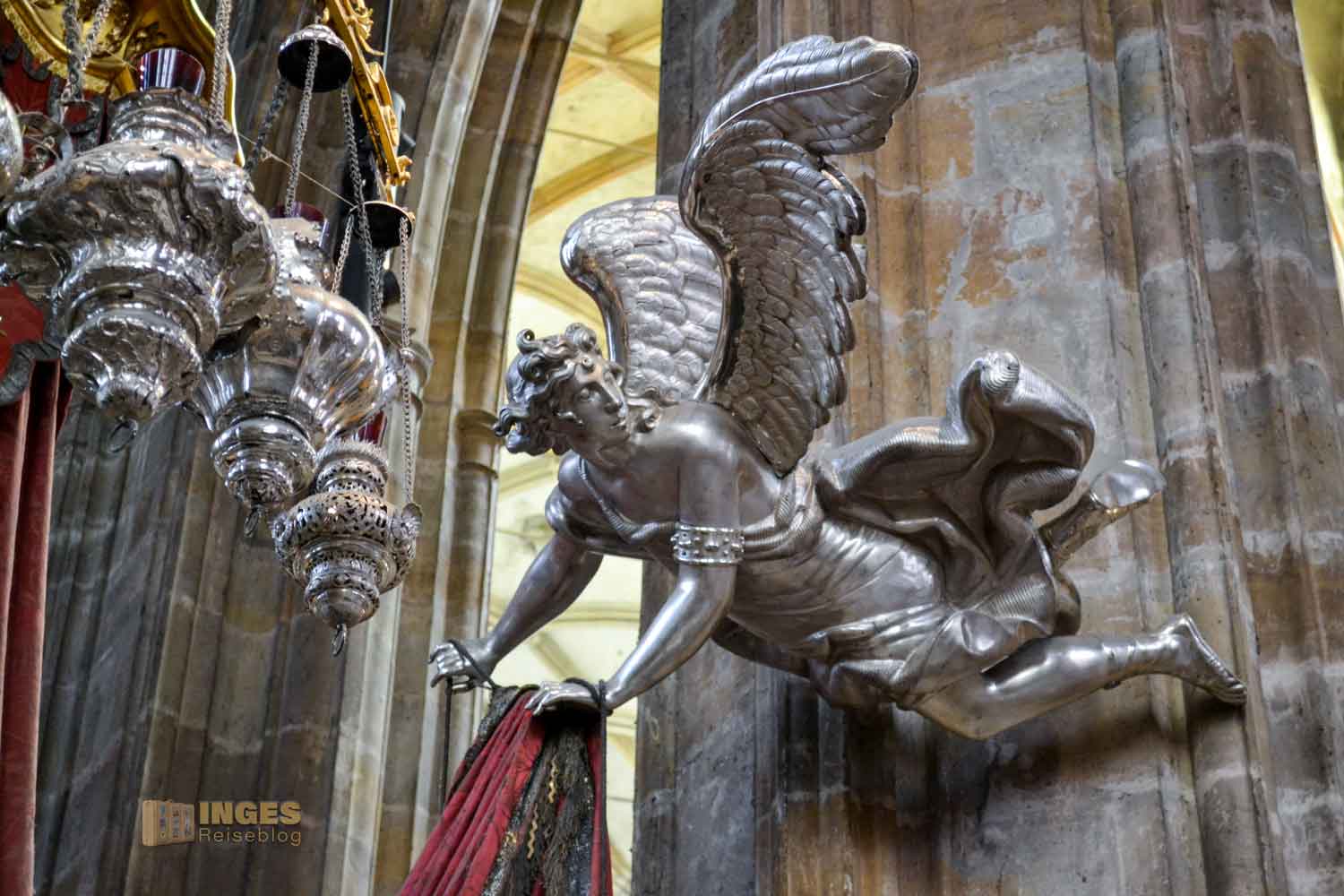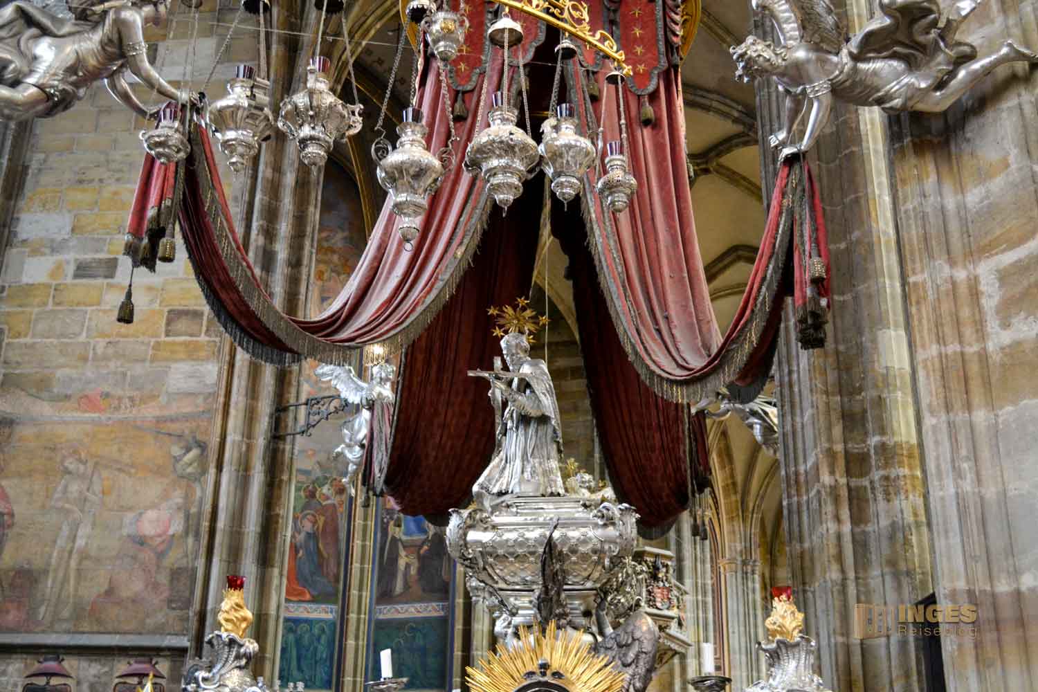 Tatsächlich wurde aber sein Leichnam, der am Ufer der Moldau angespült, später in den St. Veitsdom übergeführt, wo er dieses prachtvolle Grabmal bekam.