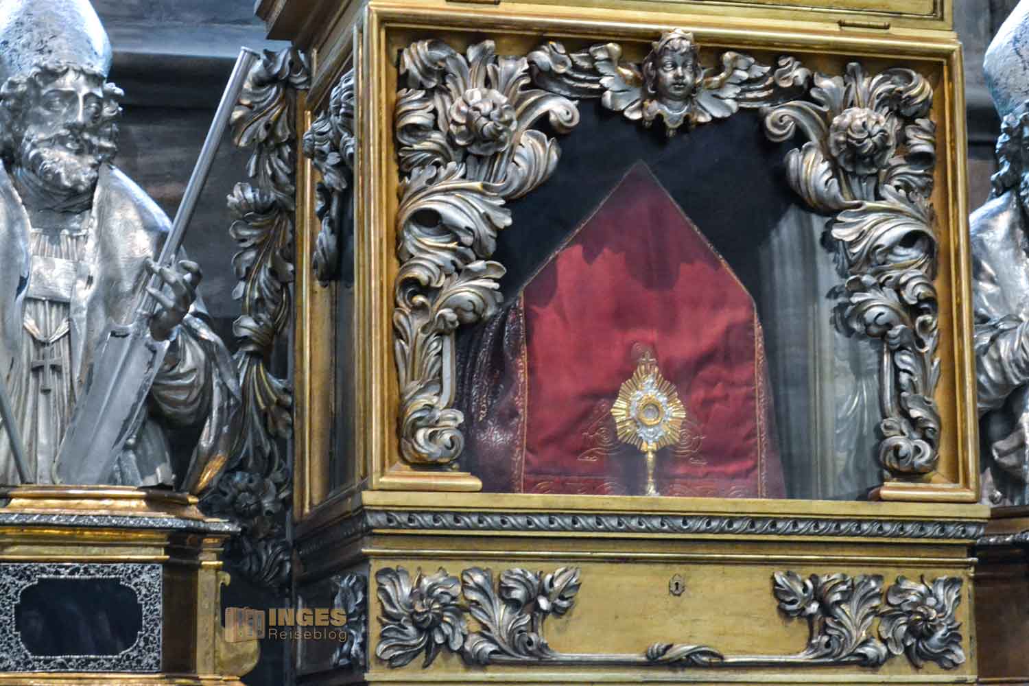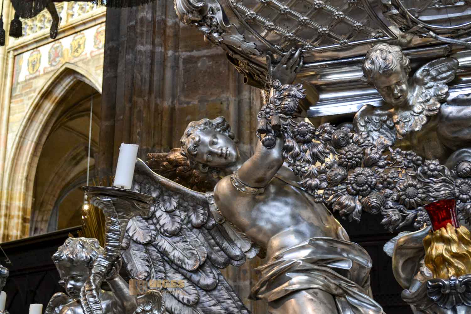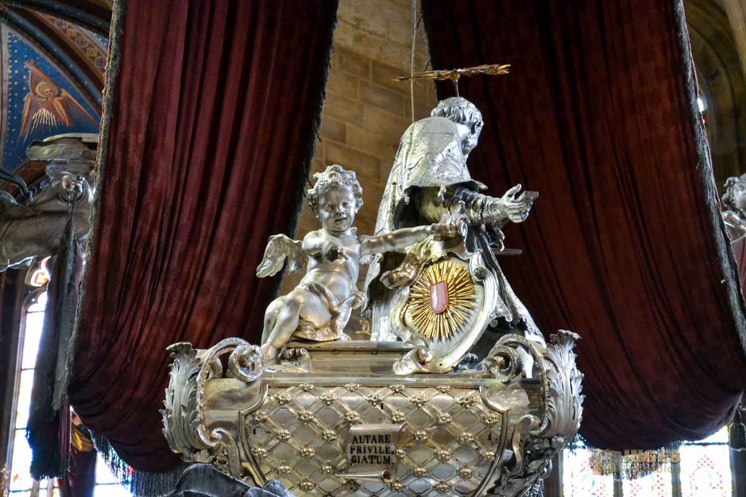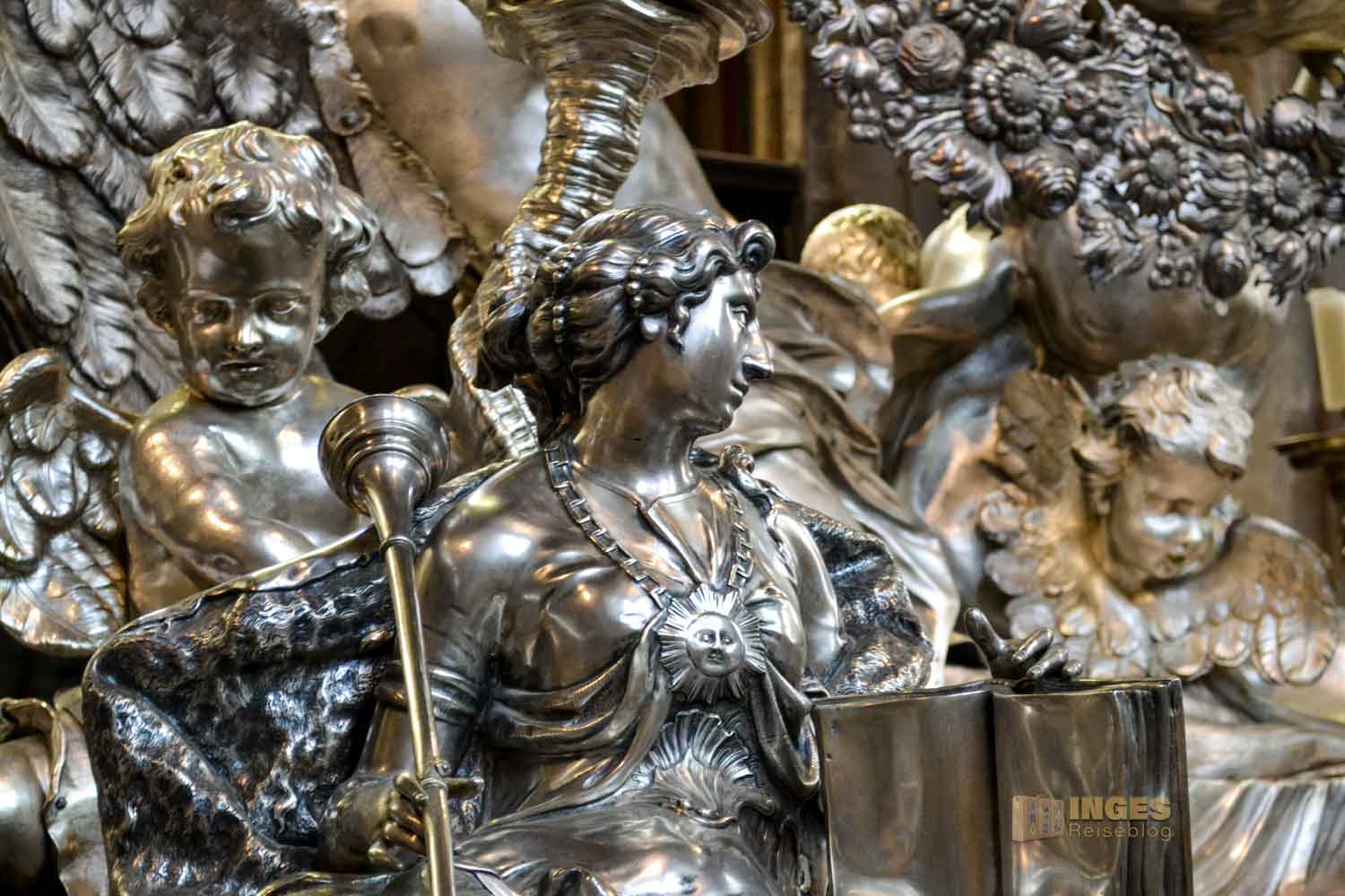 Gut über 1,6 Tonnen Silber wurden bei diesem Hochgrab verarbeitet. Der Hl. Johannes Nepomuk wird immer (bzw. meistens) mit dem Kranz von 5 Sternen dargestellt, was Verschwiegenheit bedeutet.