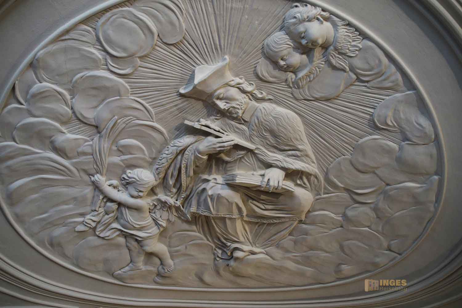 Bei unserem Langzeiturlaub in Prag im Oktober 2021 habe ich dann noch weitere Male in Prag angetroffen. Eine Kirche in der Prager Neustadt trägt seinen Namen. In der St. Peter und Paul Basilika auf dem Vyšehrad ist ihm ein Seitenaltar gewidmet. Und sogar in meinem Schwabenländle hab ich ihn mehrfach angetroffen, denn da hat ihn wohl ein Fürstpropst ebenso wie ich in sein Herz geschlossen. In der Fürstenloge in der Schlosskapelle im Schloss ob Ellwangen hat er ihn ganz groß an der Decke verewigt. Gleich nebenan steht er vor der Wallfahrtskirche auf dem Schönenberg.