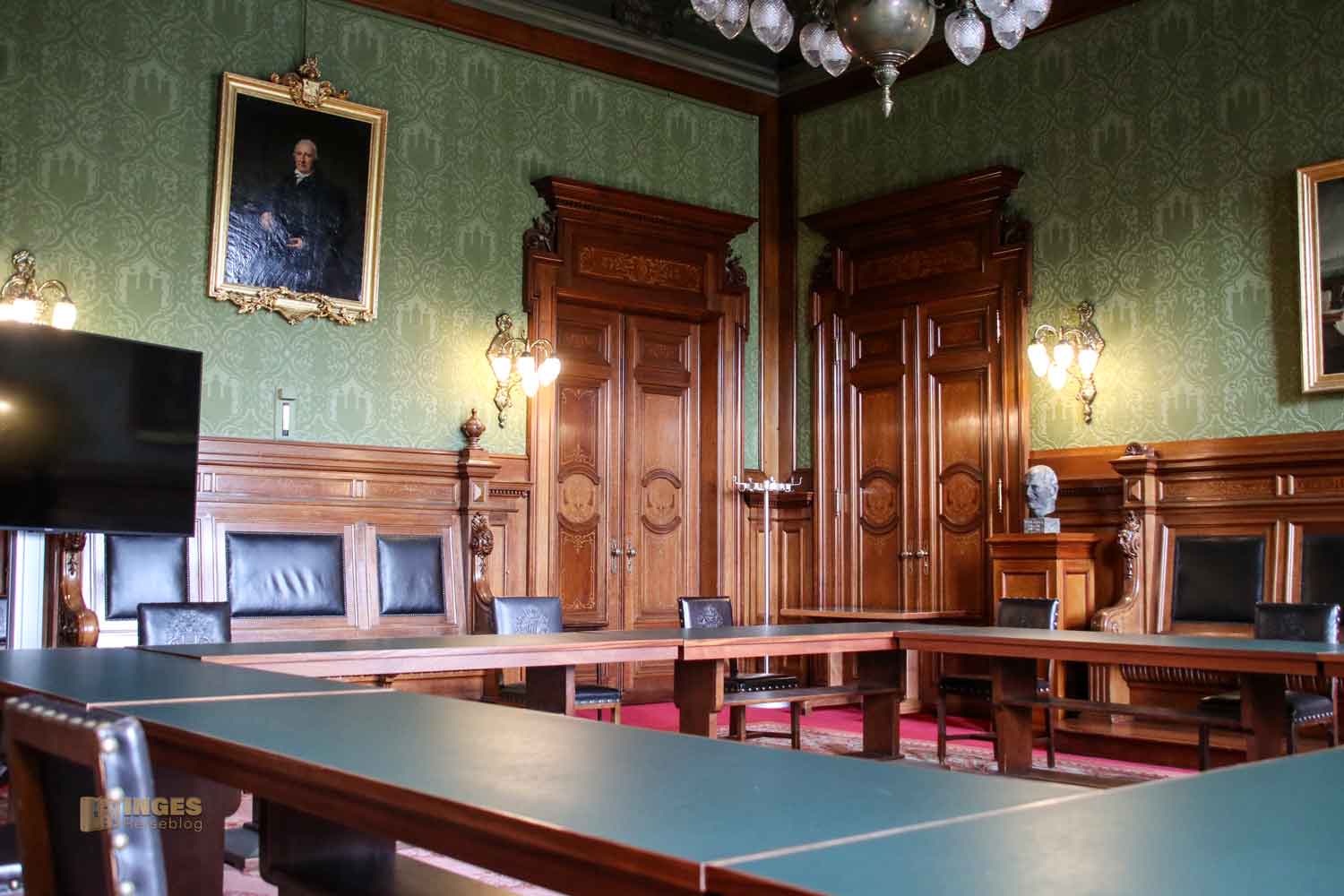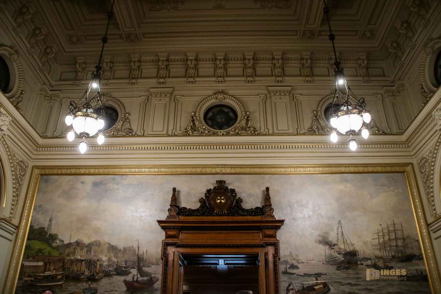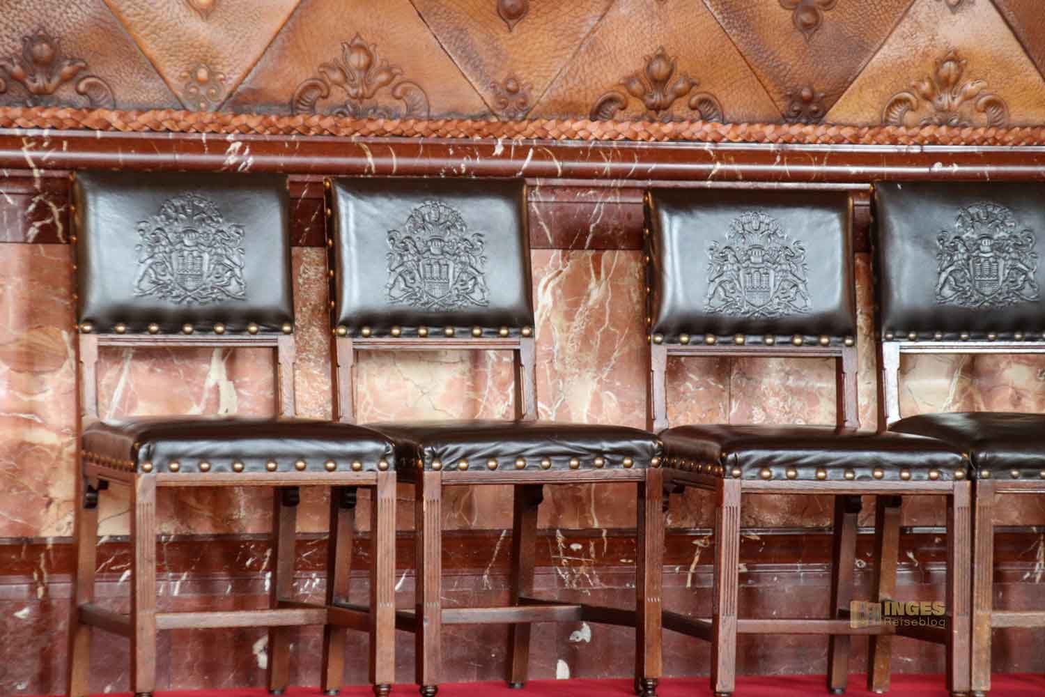 Kopf in den Nacken und der Blick nach oben zu den Wänden, und ihr findet in zehn Medaillons Portraits der früheren Bürgerschaftspräsidenten. An den Wänden darf das Stadtwappen natürlich nicht fehlen, ebenso wie die Ansicht auf den Hamburger Binnenhafen. Ich kann euch gar nicht sagen, wie oft ich in Hamburg das Stadtwappen überall gesehen habe. Das kann man gar nicht mehr zählen.