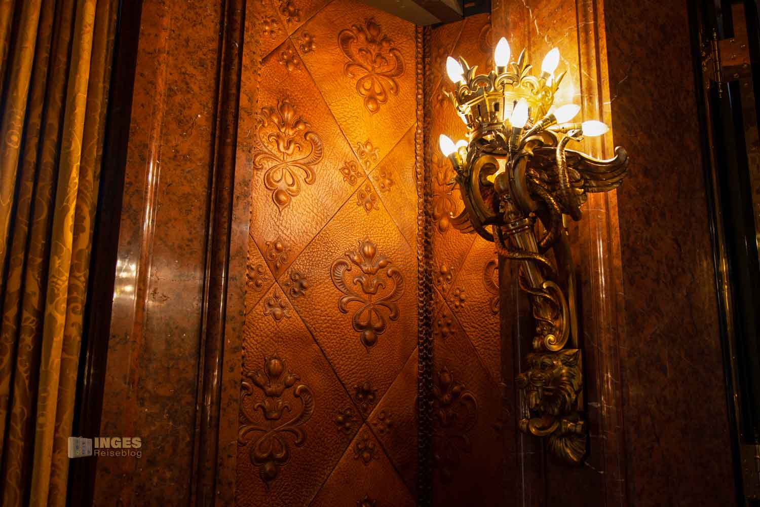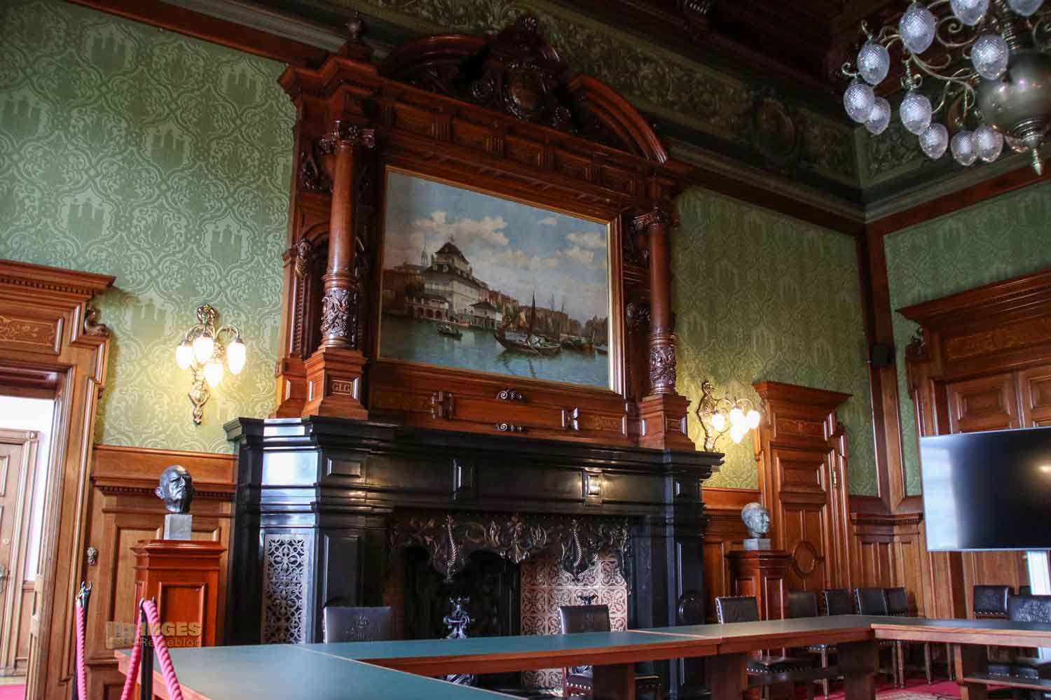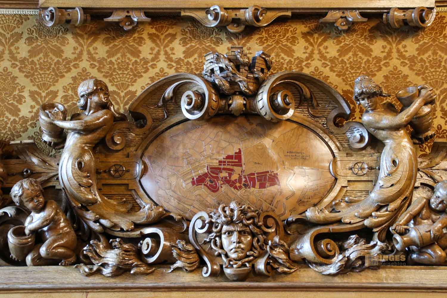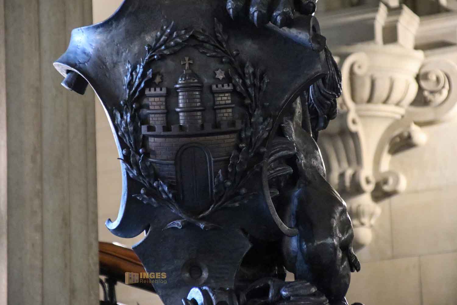 Kopf in den Nacken und der Blick nach oben zu den Wänden, und ihr findet in zehn Medaillons Portraits der früheren Bürgerschaftspräsidenten. An den Wänden darf das Stadtwappen natürlich nicht fehlen, ebenso wie die Ansicht auf den Hamburger Binnenhafen. Ich kann euch gar nicht sagen, wie oft ich in Hamburg das Stadtwappen überall gesehen habe. Das kann man gar nicht mehr zählen.