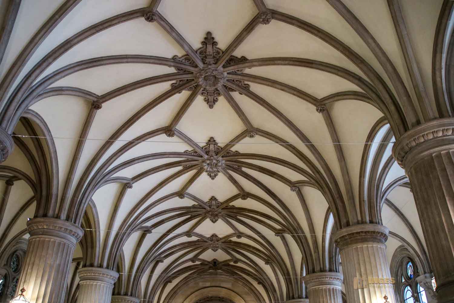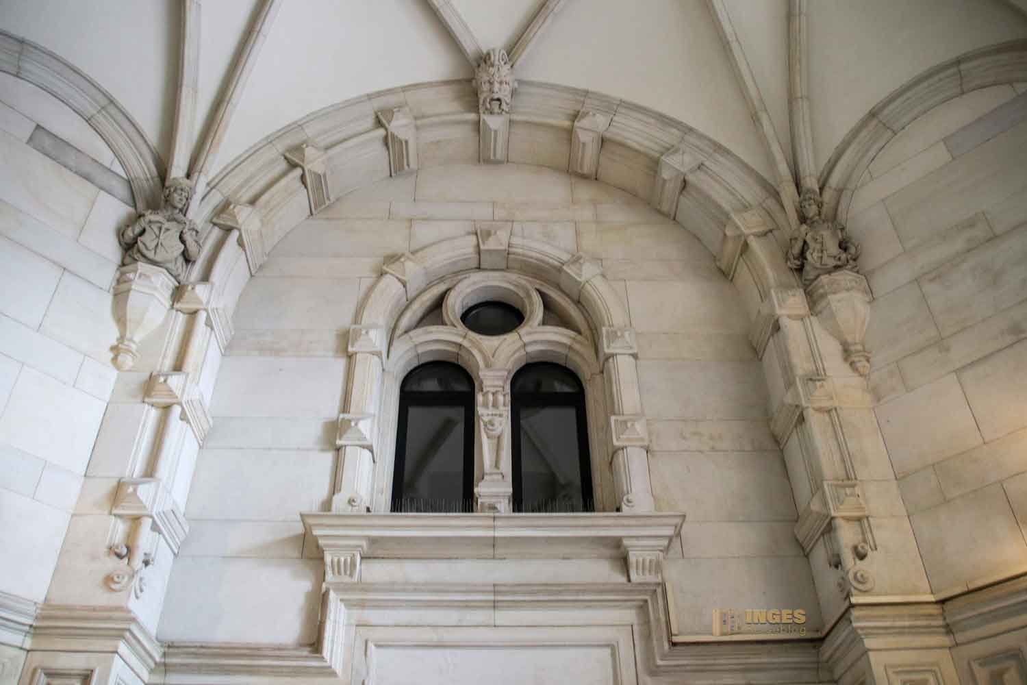 Helle Sandsteinquader und eine hohe Kuppeldecke machen diese Turmhalle aus. Am Ende des Rippengewölbes finden sich acht Handwerker wieder, die am Bau des Rathauses beteiligt waren. Mit ihren Zunftwappen dürfen sie auch wahrlich stolz auf ihre Leistungen sein.