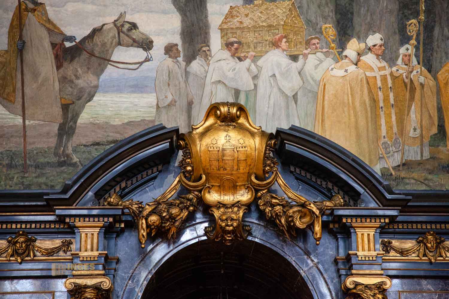 Eigentlich, so war es von Vogel gemalt, kniete ein Heide zur Taufe vor dem Bischof. Nein, nein! Aber doch nicht in Hamburg! Hamburger sind soooo stolz, dass sie vor niemandem knien - kurzerhand musste die Figur übermalt werden.