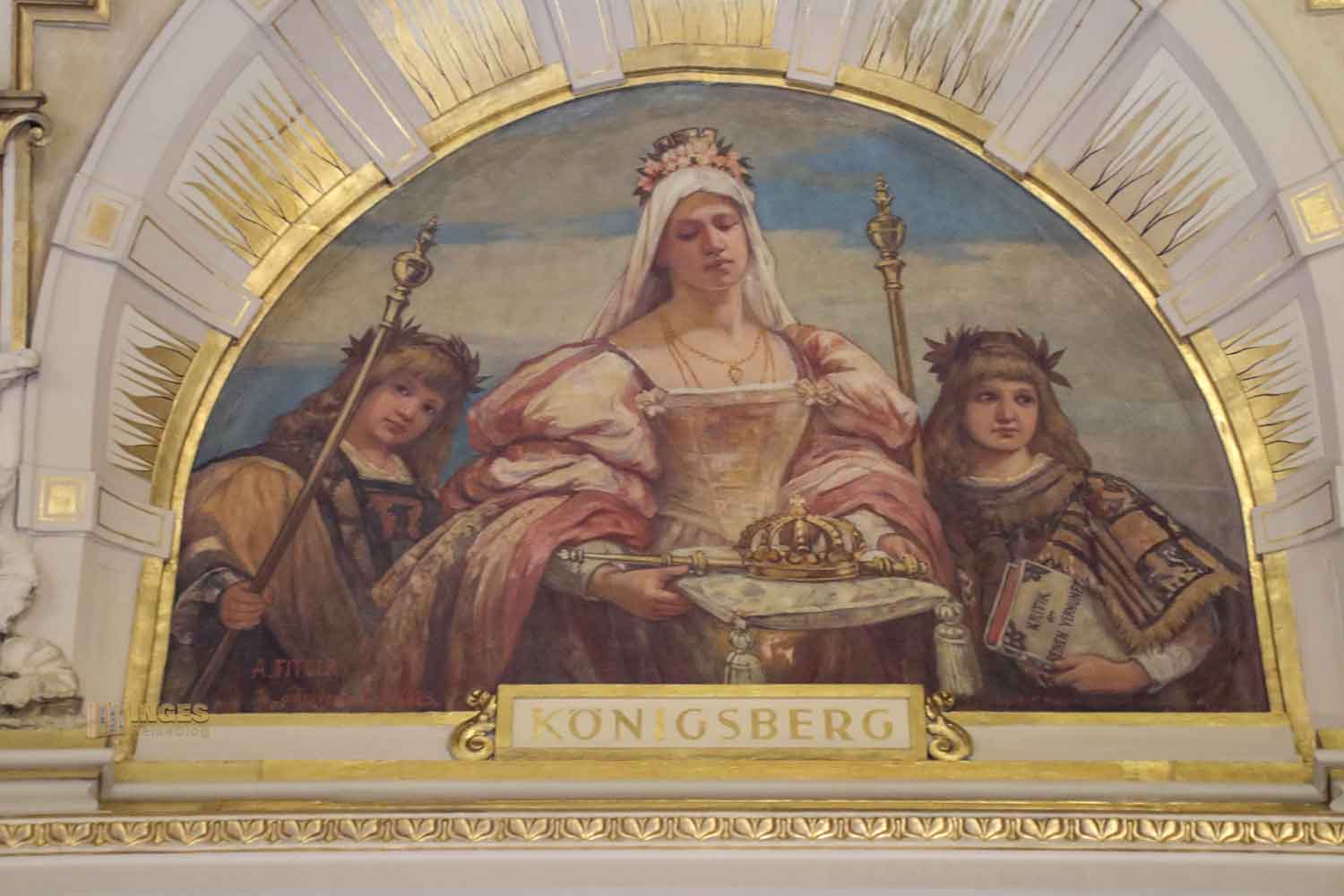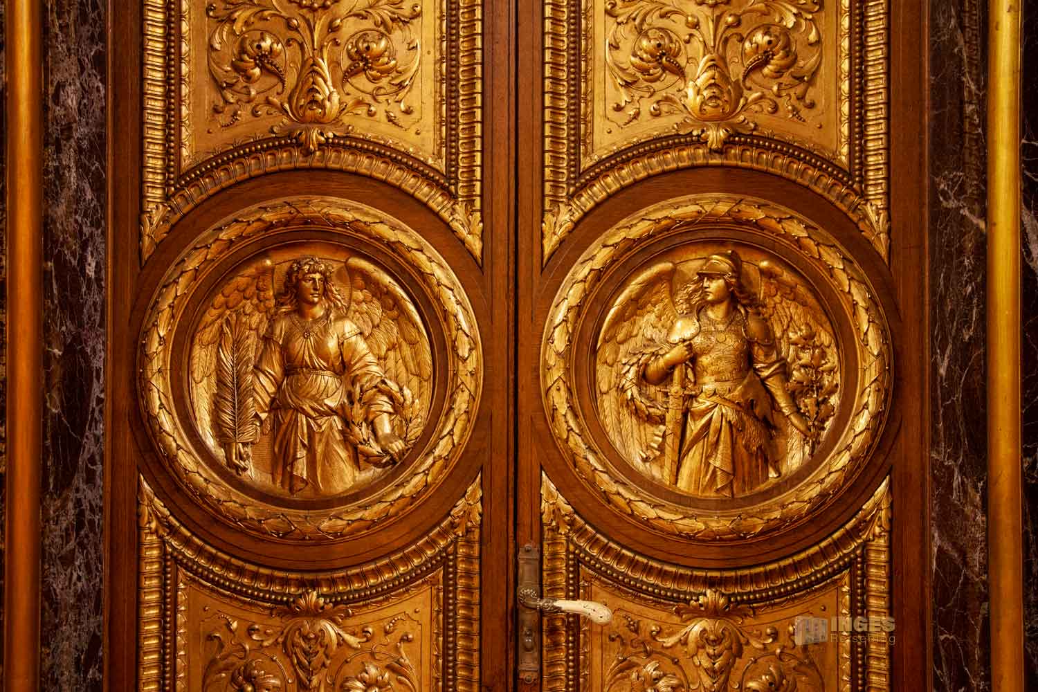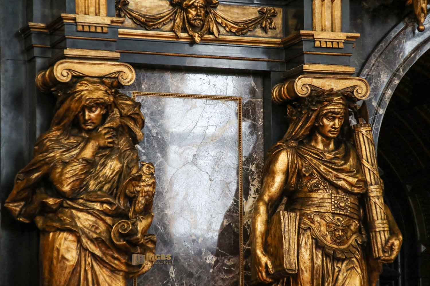 die den Eingang in den Saal geben. Vermutlich nicht ohne Grund muss man an den vom Bildhauer Joseph von Kramer geschaffenen Figuren. Als Wandgemälde bin ich ihnen bereits im Turmsaal begegnet. Sie verkörpern die Weisheit, die Gerechtigkeit, die Stärke und den Fleiß.