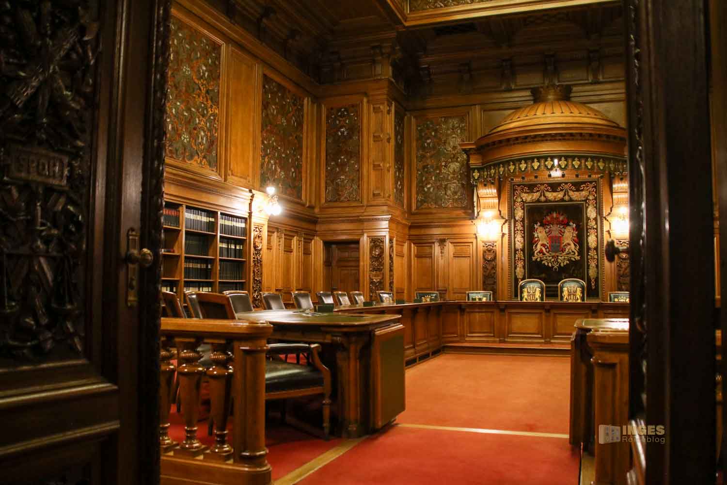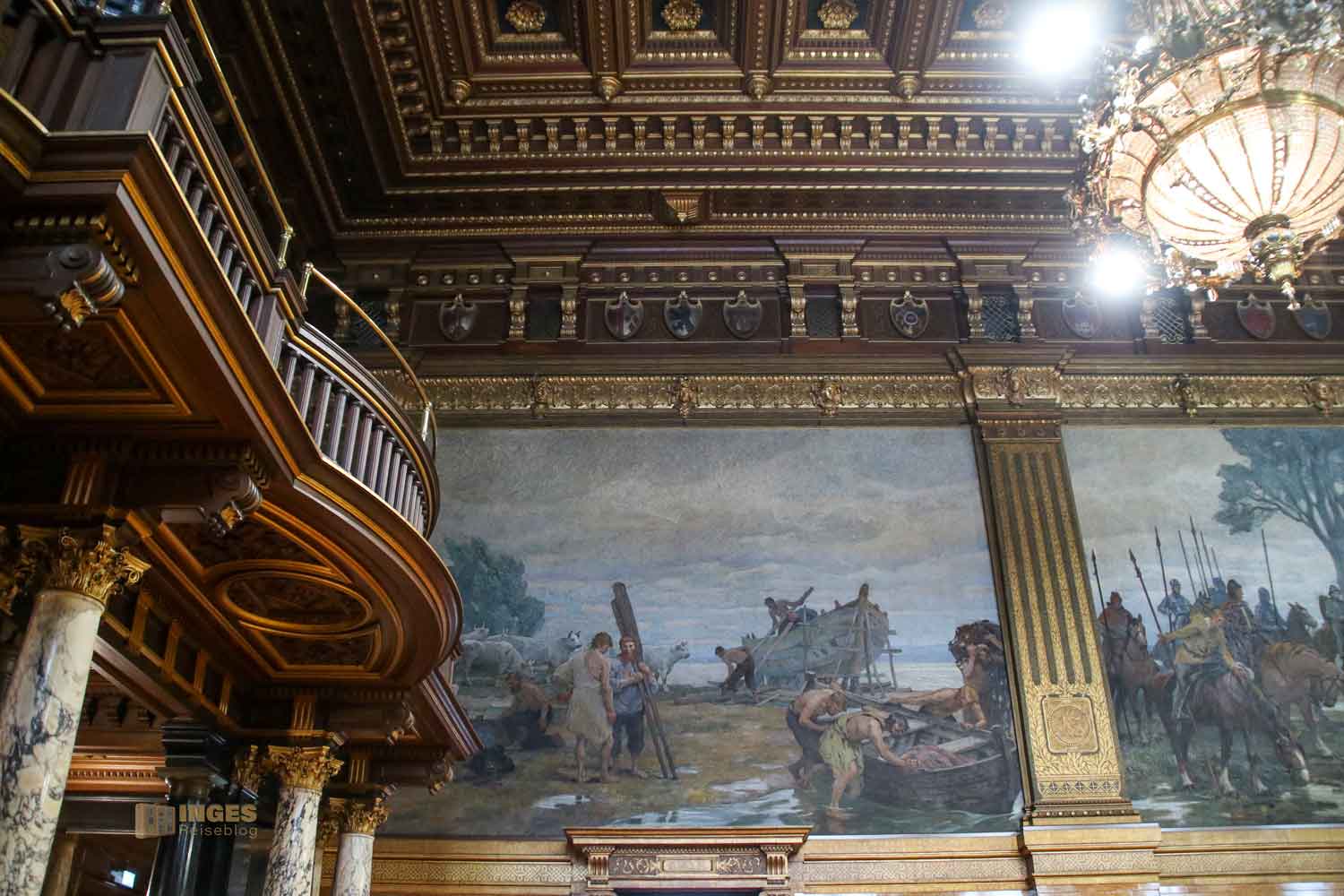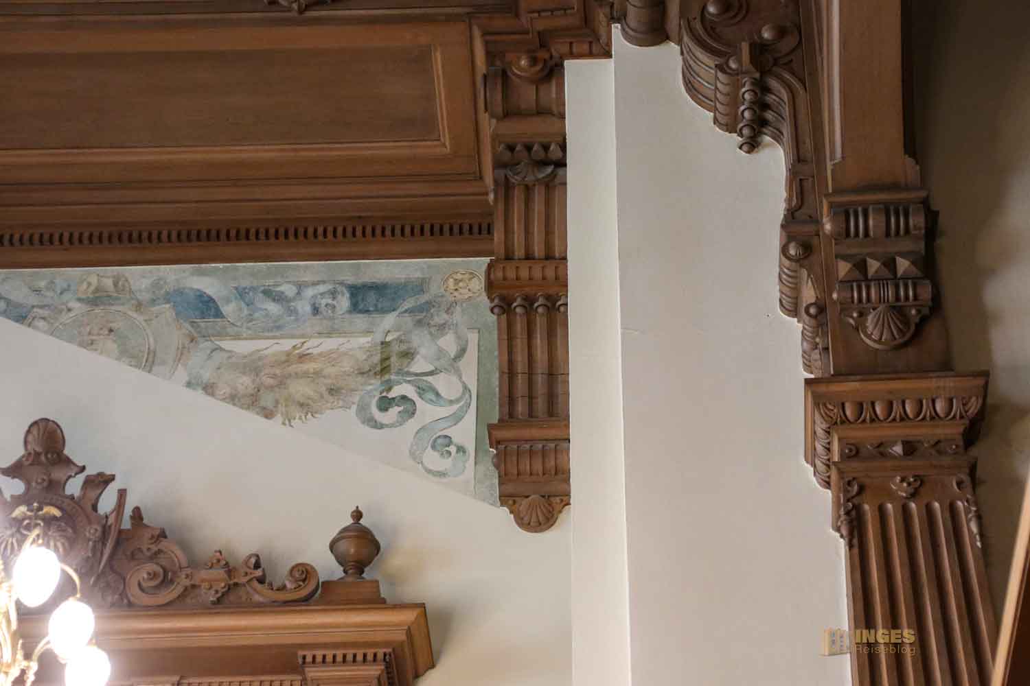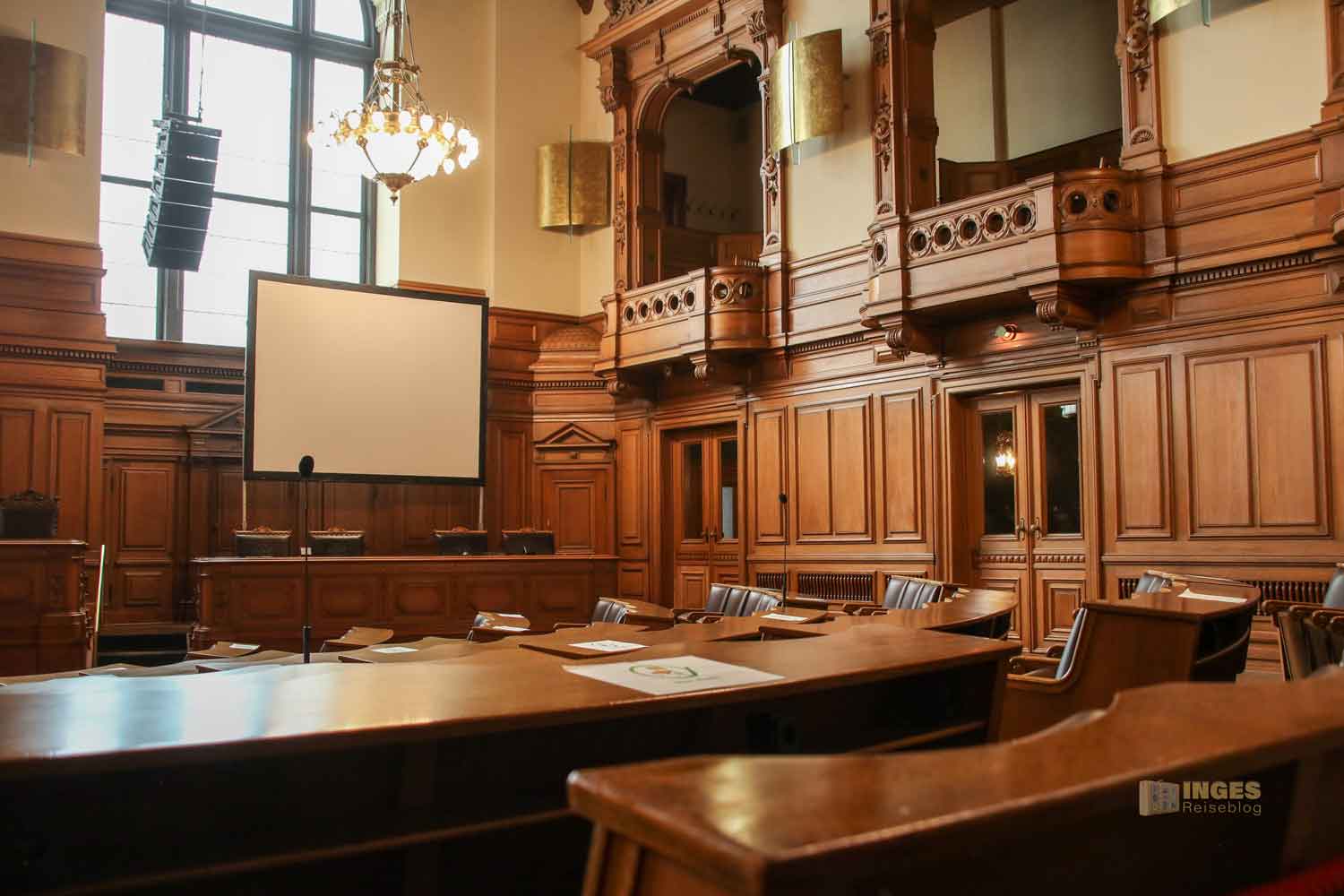 Ich gebe zu, es war mein erster Besuch in einem Plenarsaal und war da aufgrund der Ausstattung schon etwas überrascht - Ledersessel mit Schnitzereien, alles in Holz, selbst die Decke und die Logen mit den Rundbögen. Und das war wohl zu früheren Zeiten noch üppiger, denn damals waren die Wände noch mit üppigen Malereien versehen. An der Seite sieht man noch ein Stückchen davon. Ganz ehrlich, mich würde das in dem Raum dann erschlagen - alle Wände mit Malereien. So finde ich ihn persönlich schöner - und wärmer, als die anderen Sitzungssäle die man so aus dem Fernsehen kennt.