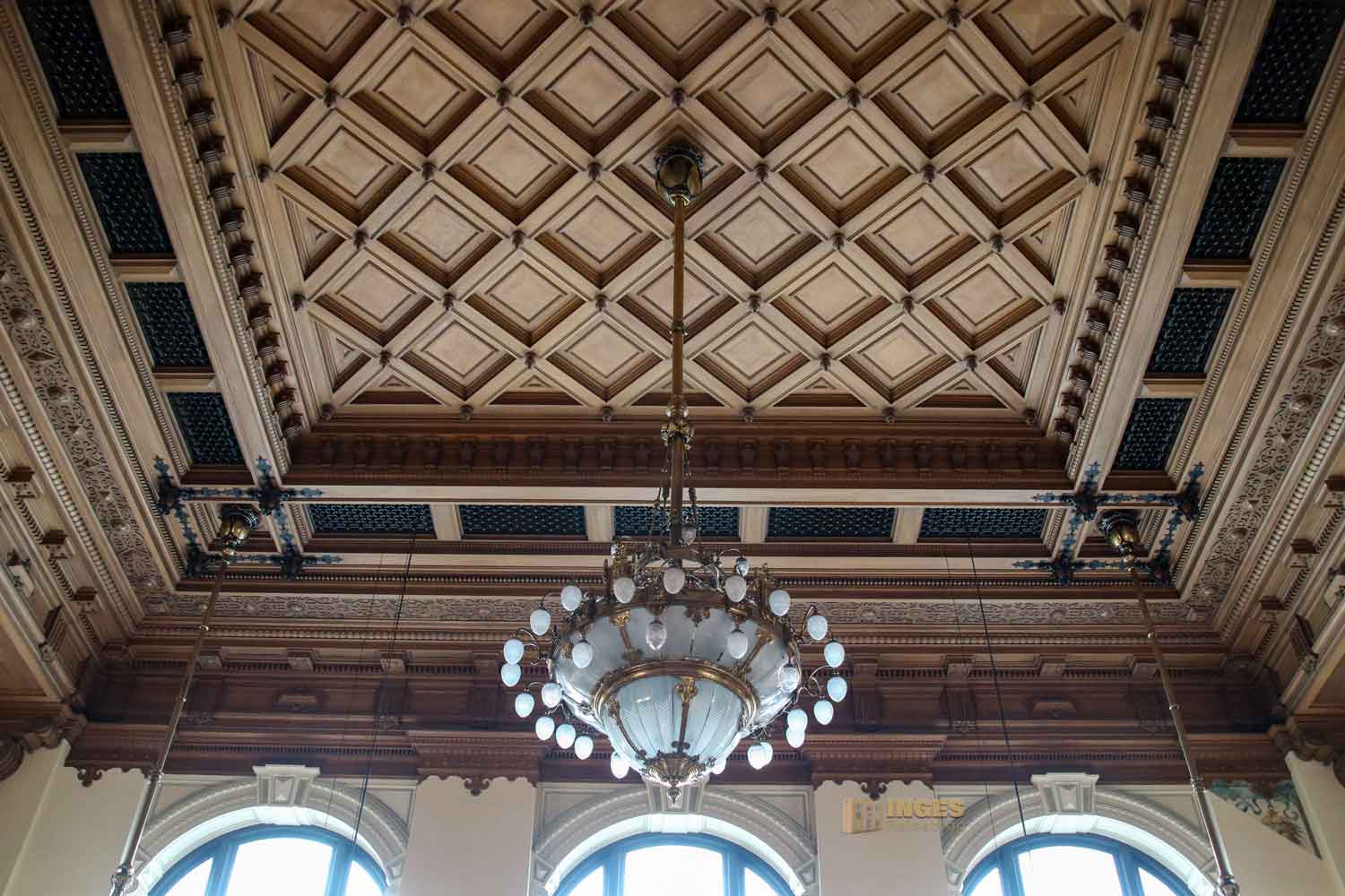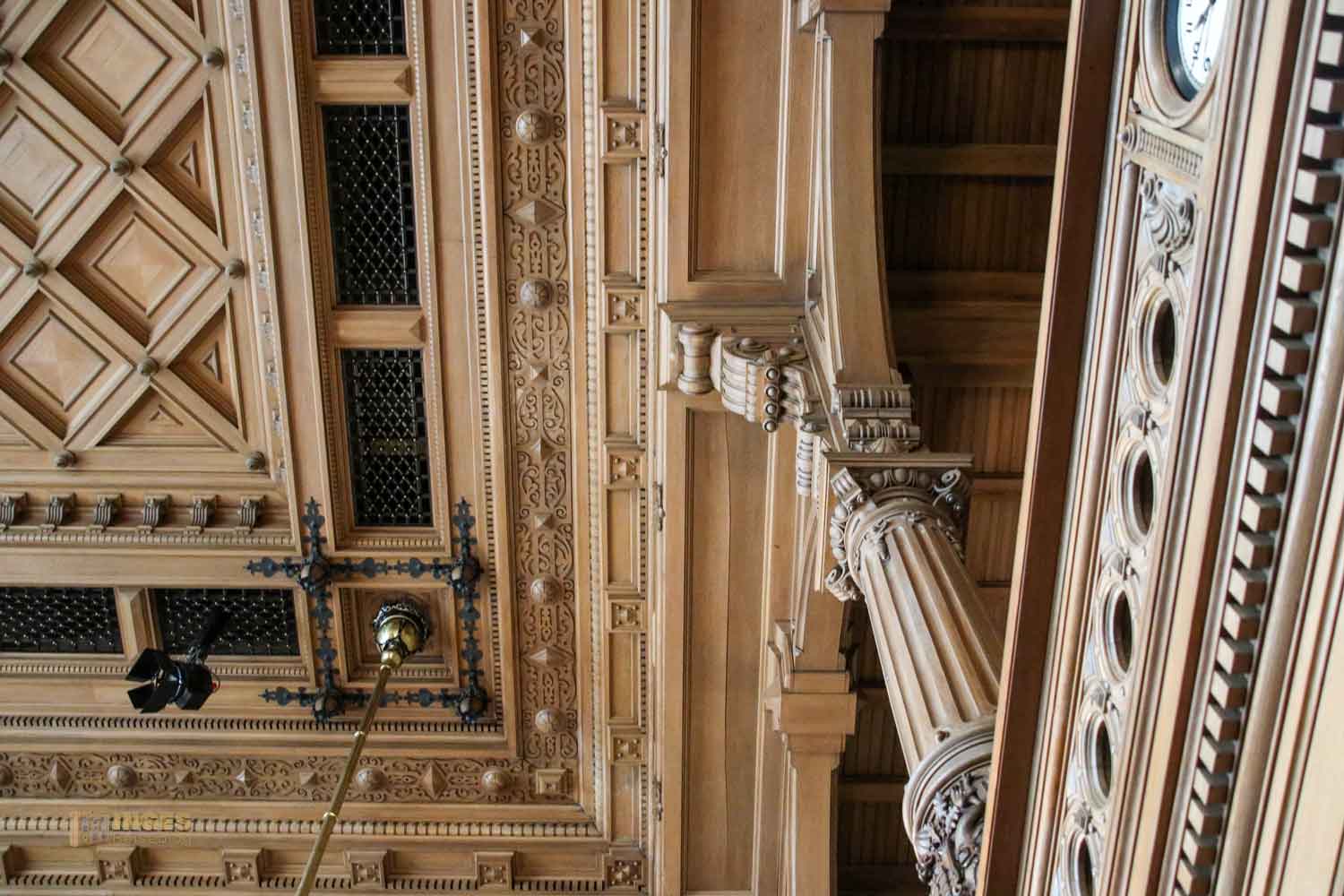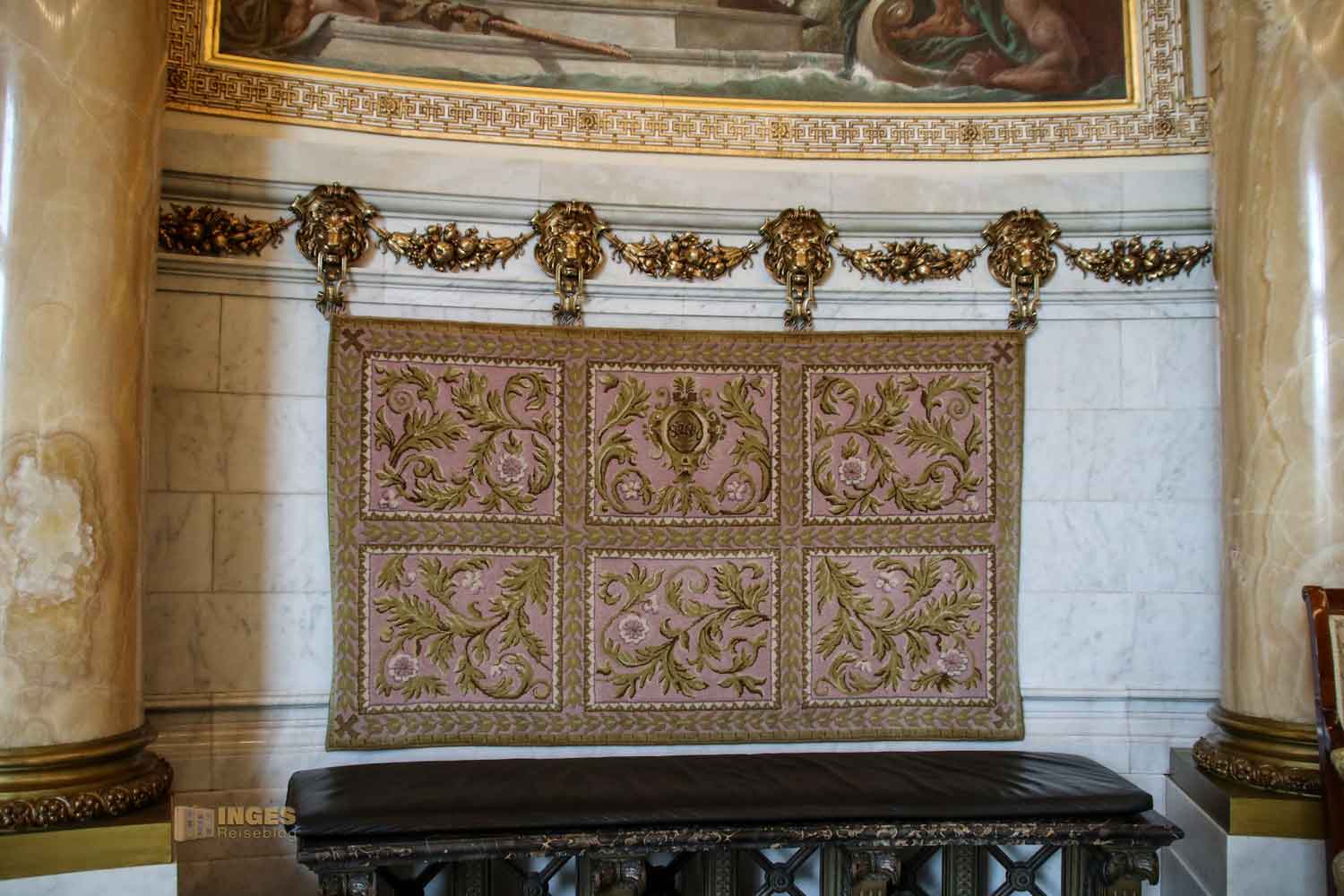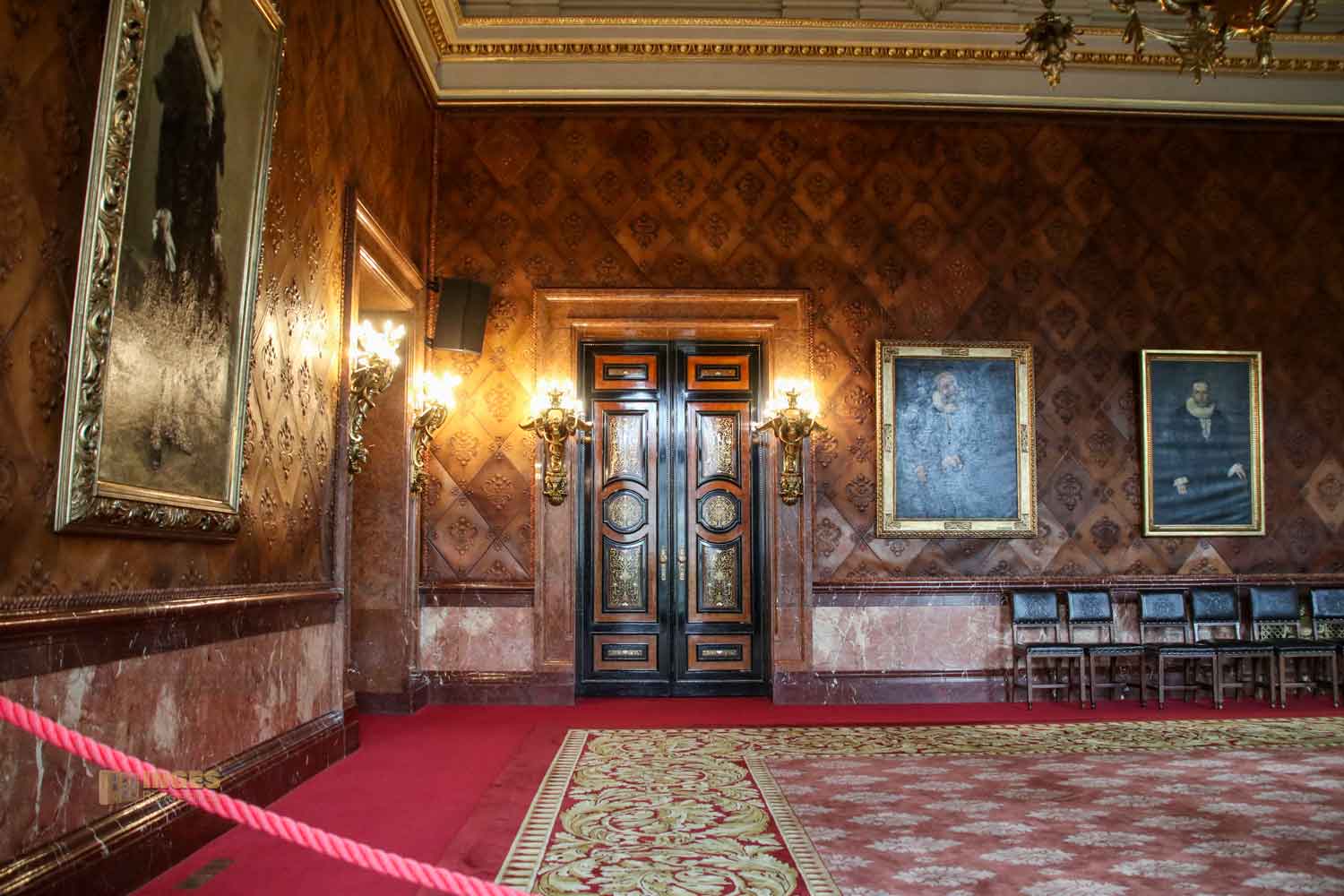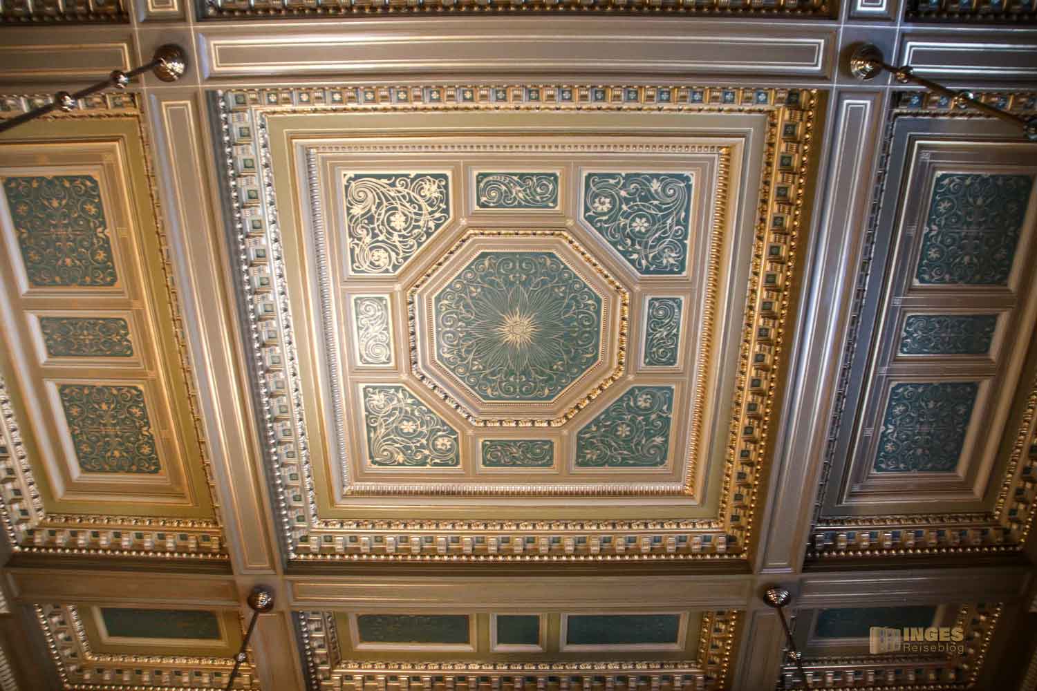 Ich gebe zu, es war mein erster Besuch in einem Plenarsaal und war da aufgrund der Ausstattung schon etwas überrascht - Ledersessel mit Schnitzereien, alles in Holz, selbst die Decke und die Logen mit den Rundbögen. Und das war wohl zu früheren Zeiten noch üppiger, denn damals waren die Wände noch mit üppigen Malereien versehen. An der Seite sieht man noch ein Stückchen davon. Ganz ehrlich, mich würde das in dem Raum dann erschlagen - alle Wände mit Malereien. So finde ich ihn persönlich schöner - und wärmer, als die anderen Sitzungssäle die man so aus dem Fernsehen kennt.
