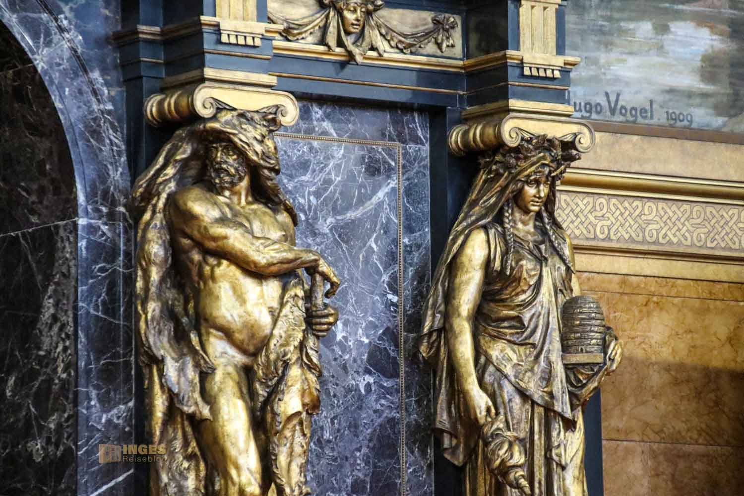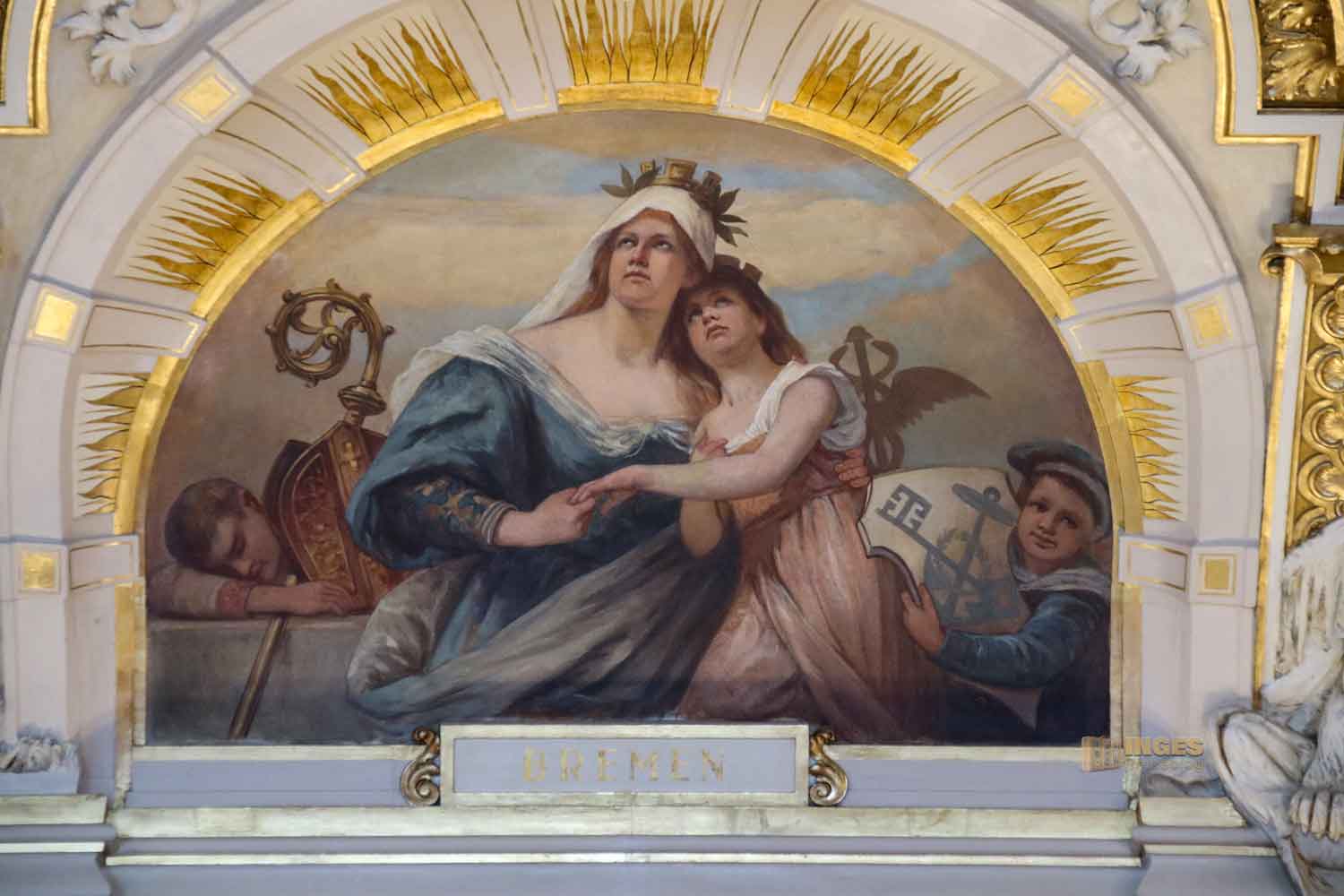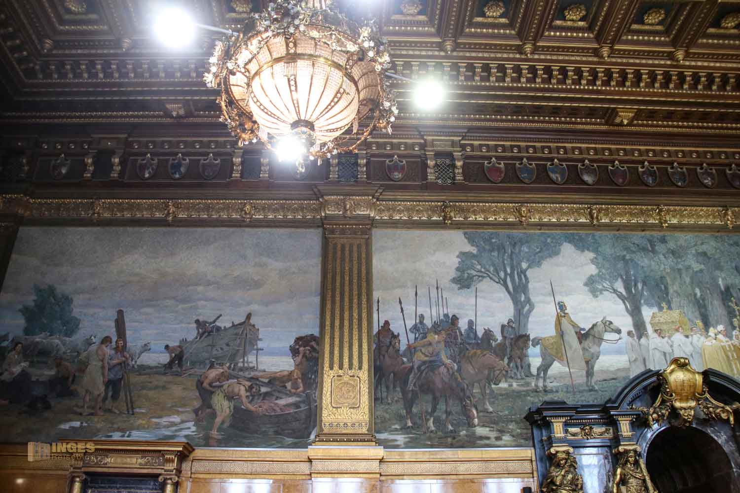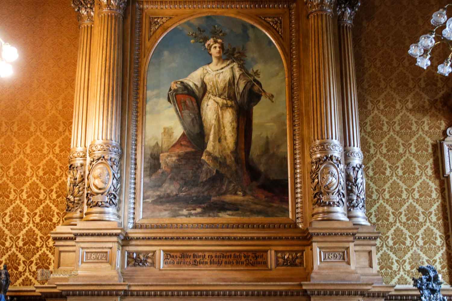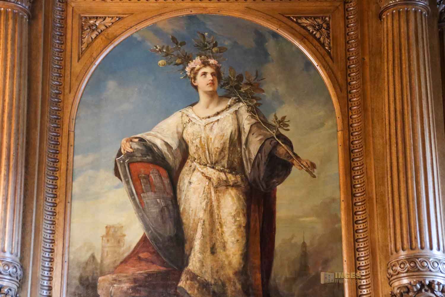 Beachtenswert auch das große Gemälde darüber. Ich kann jetzt verstehen, warum der Architekt vor lauter Gram seinen Bau nicht mehr betreten hat und wohl auch während der Bauzeit immer wieder gerne das Handtuch geworfen hätte. Da wollen die einen nicht so, wie es die anderen wollen - oder sie taugen ganz einfach nichts. So war es auch mit den Malern, die die großen Wandgemälde im Festsaal gestalten sollten. Schlussendlich musste Hugo Vogel für alle die Kohlen aus dem Feuer holen und fertigte die vier riesengroße Gemälde. Den modernen Hamburger Hafen habt ihr ja schon gesehen, die anderen zeigen die Entwicklung von der Urlandschaft, über die Vorgeschichte und die Christanisierung, das ihr über den Tugenden seht.