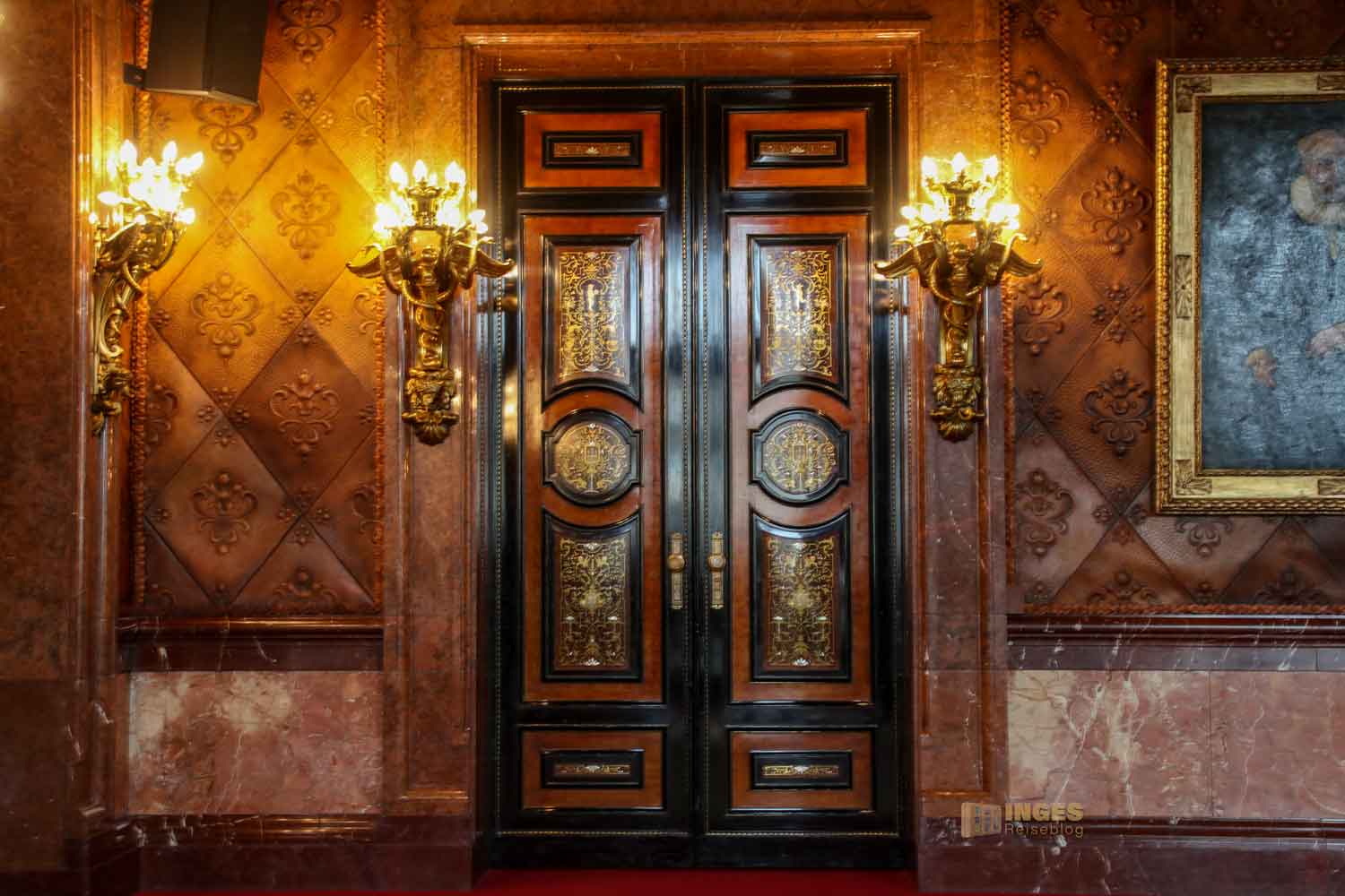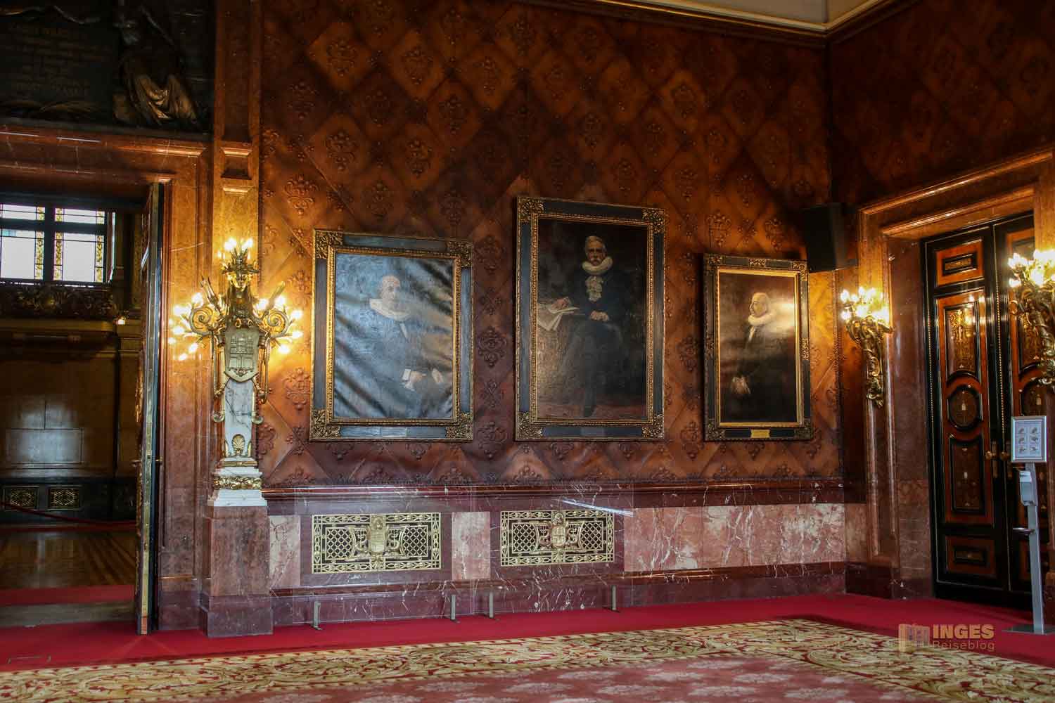 In diesem Raum muss man erst einmal ein bisschen sortieren, damit man den Überblick über alles behält. Bleiben wir erstmal auf dem Boden und lassen den Gesamteindruck des zweitgrößten Saales im Hamburger Rathaus wirken. Bis zur Hälfte hat der/die Baumeister einen rötlichen Marmor ausgewählt und wie in anderen Räumen auch, eine Ledertapete. Frühere Hamburger Bürgermeister haben im Blick wer sich da durch den Raum bewegt.
