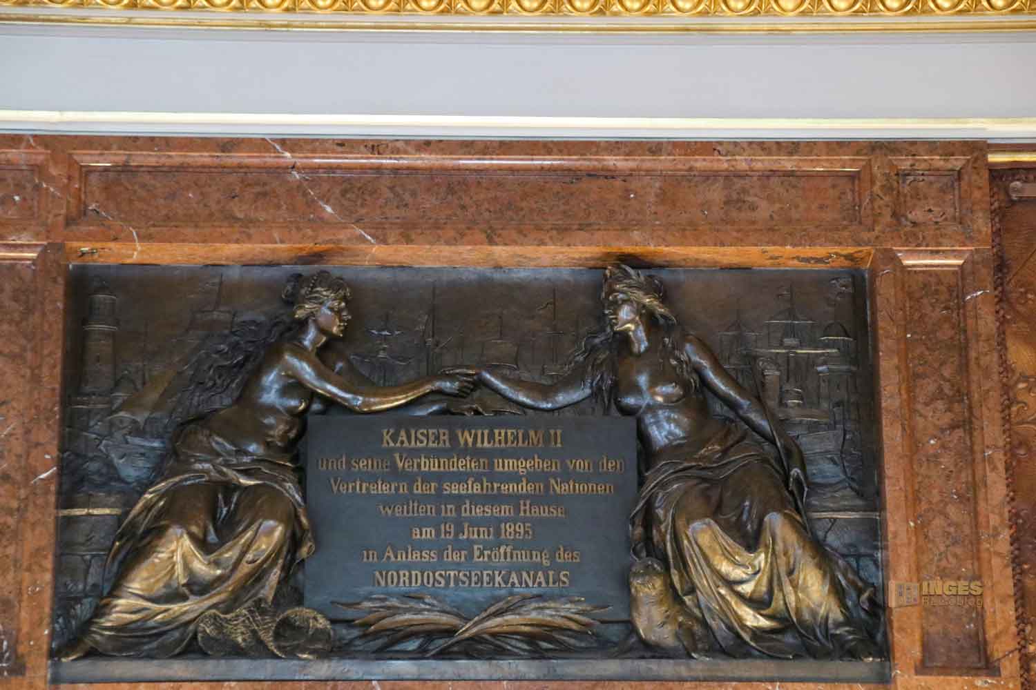 Wenn ihr jetzt denkt, der Raum ist ja nur ein Museumsstückchen, der täuscht sich. Er kann bis zu 200 Personen fassen - entweder finden Ausschutzsitzungen hier statt, oder werden Gäste oder Bürger empfangen. Es ist also kein toter, verstaubter Raum, auch wenn der Staub damals vermutlich blitzschnell aus diesem Raum gewischt werden musste. Denn der damalige Kaiser Wilhelm II. hatte es sich am 19. Juni 1895 partout in den Kopf gesetzt, just in diesem Raum (deshalb auch Kaisersaal) die Einweihung des Nord-Ostsee-Kanals mit vielen Gästen zu feiern. Doof nur, dass das Rathaus insgesamt noch eine Baustelle war, einschließlich dieses Saals. Aber wenn Kaisers was wollen, muss das Volk spuren.