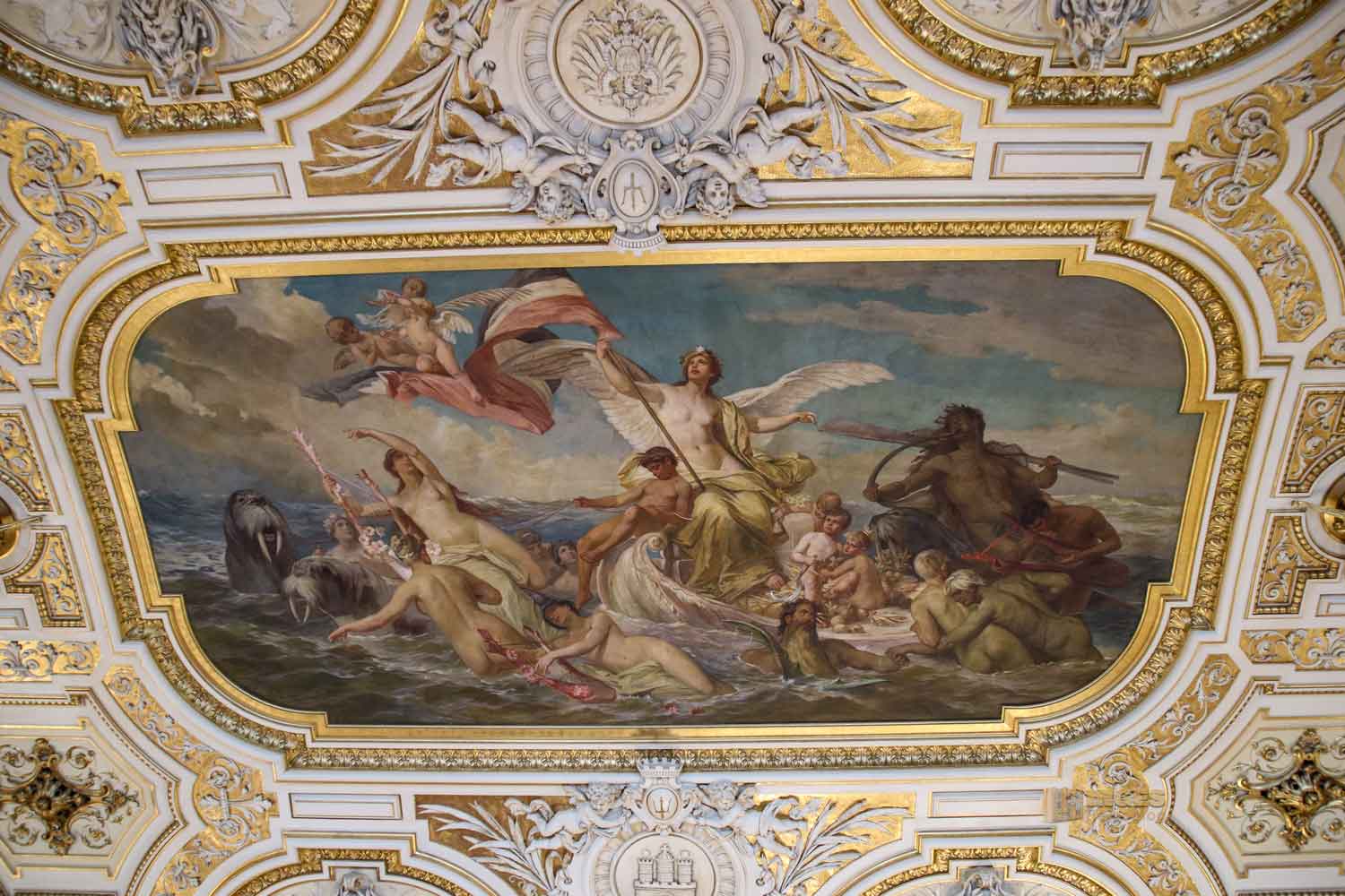Jetzt gehts an die Decke - nein, nicht vor Wut, sondern mit Begeisterung. Bei der Bilderfolge an der Decke ist die Seefahrt, und das Tor zur Welt, Thema. Bei dem Hauptgemälde in der Deckenmitte könnte man fast meinen, uiii, soviel Freizügigkeit in dieser Zeit? Tja, was zeigt es denn nun genau? Der Maler hat wohl seinen Auftrag sehr frei umgesetzt - sein Auftrag war der deutsche Überseehandel.
