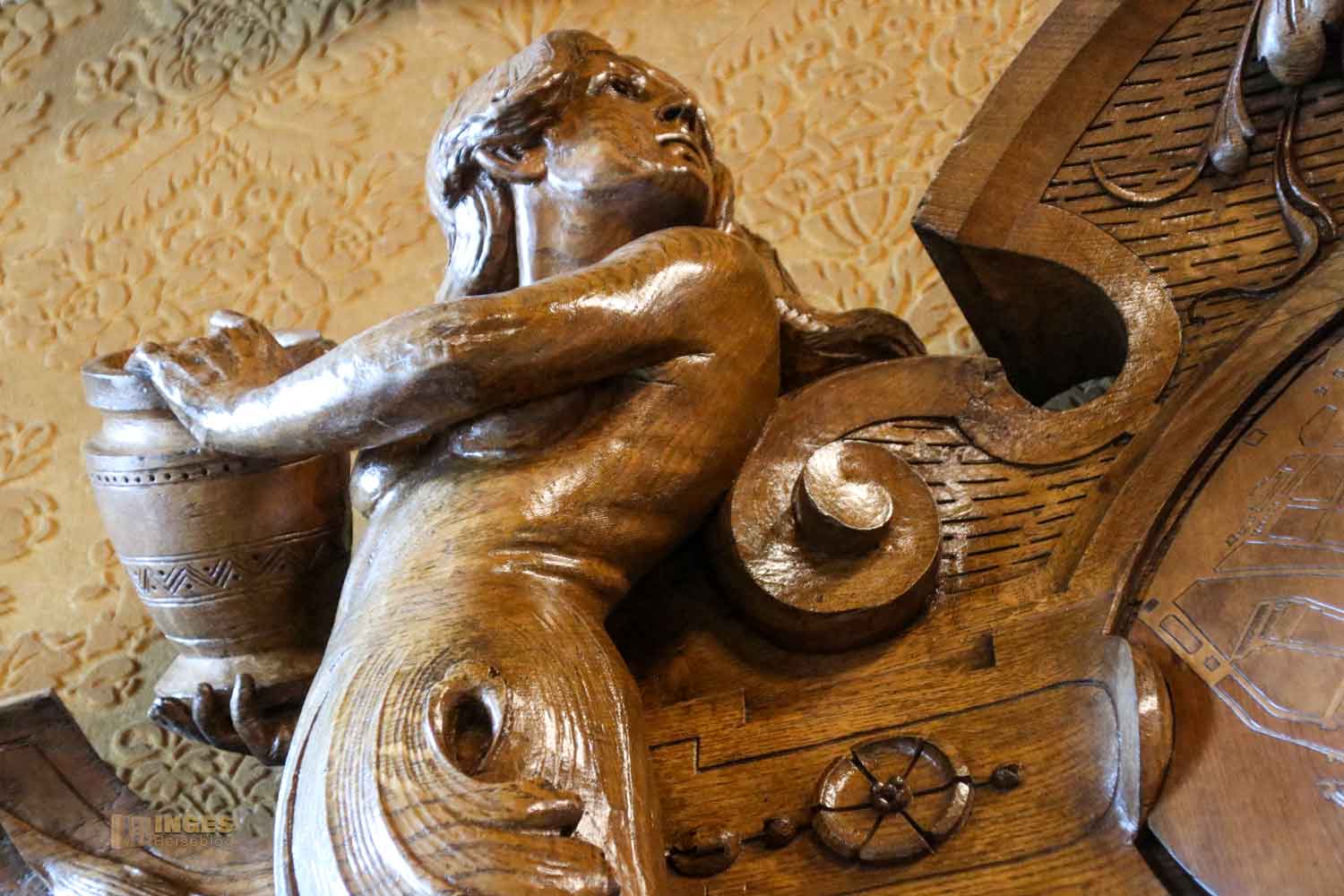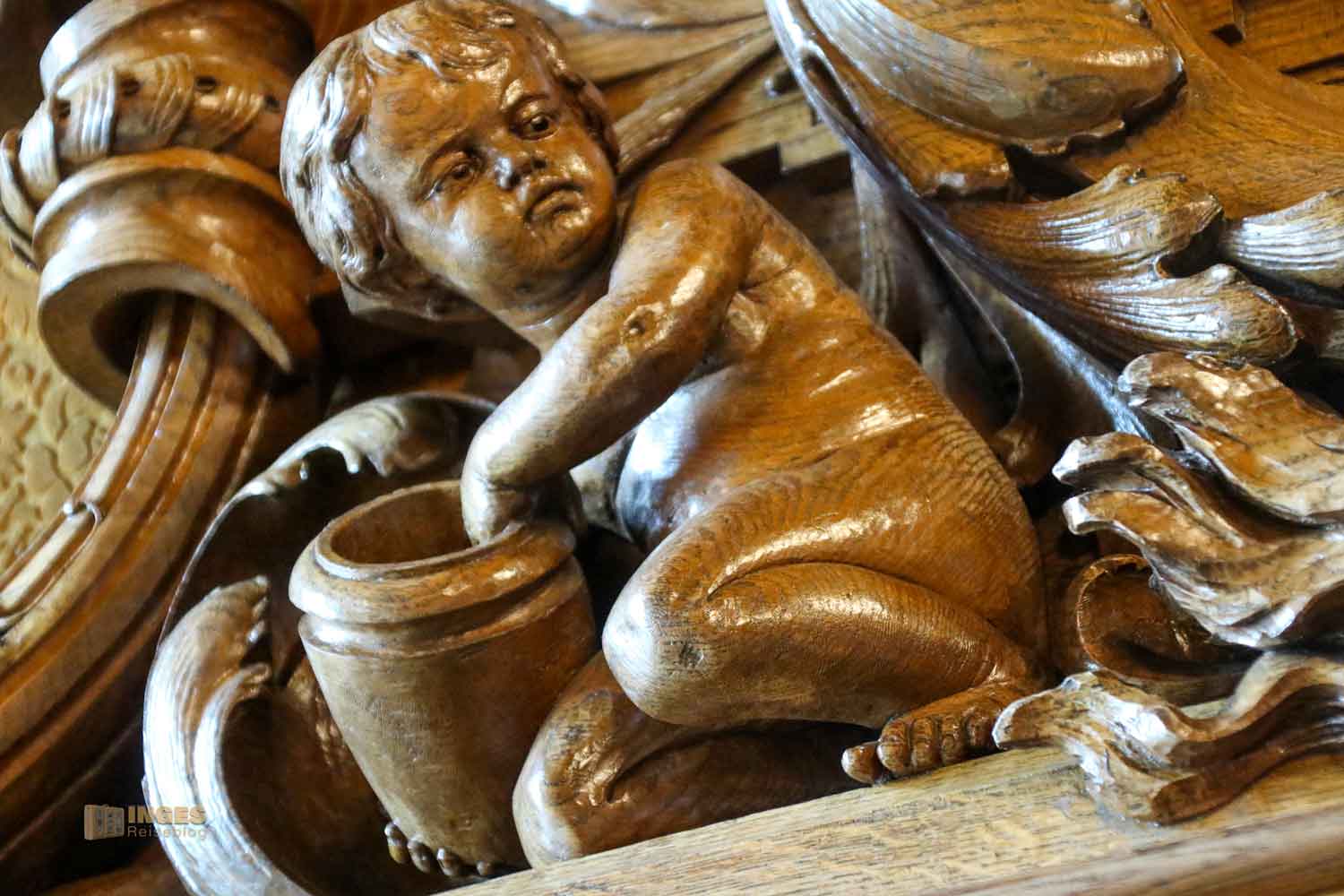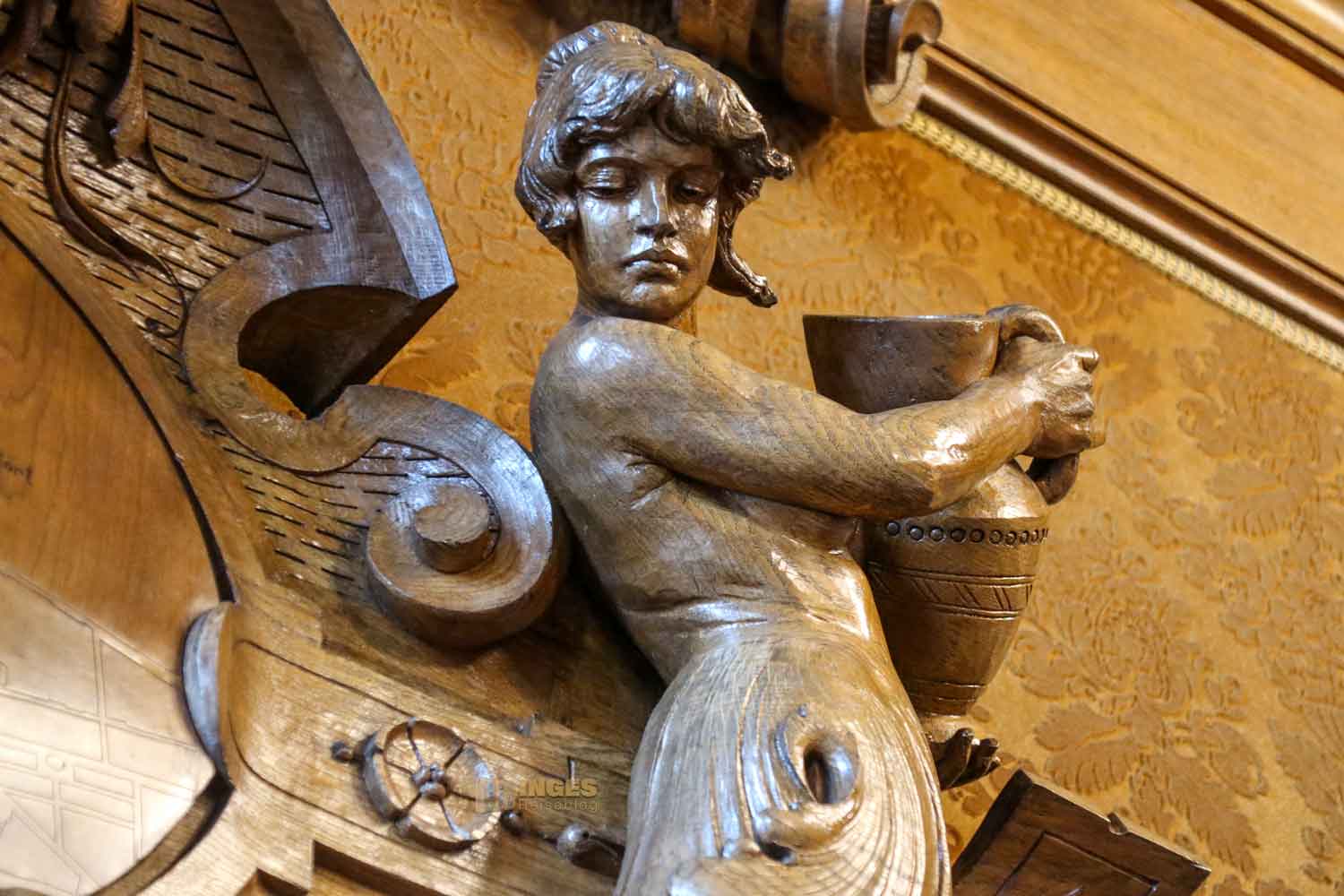 Es gibt viele 'Kleinigkeiten' in diesem Raum zu entdecken: schaut euch die geschnitzten Köpfe an den Bänken an (ich sehe solche Köpfe oft an alten Kirchenbänken). Man könnte sagen, da menschelt es auf den Bänken, wie es halt im Leben so vorkommt: Ironie, Neid, Schadenfreude und Missgunst - sind nicht schön, und definitiv haben sie im Plenarsaal nichts verloren. Deshalb bleiben sie einfach auf den Bänken hier sitzen.