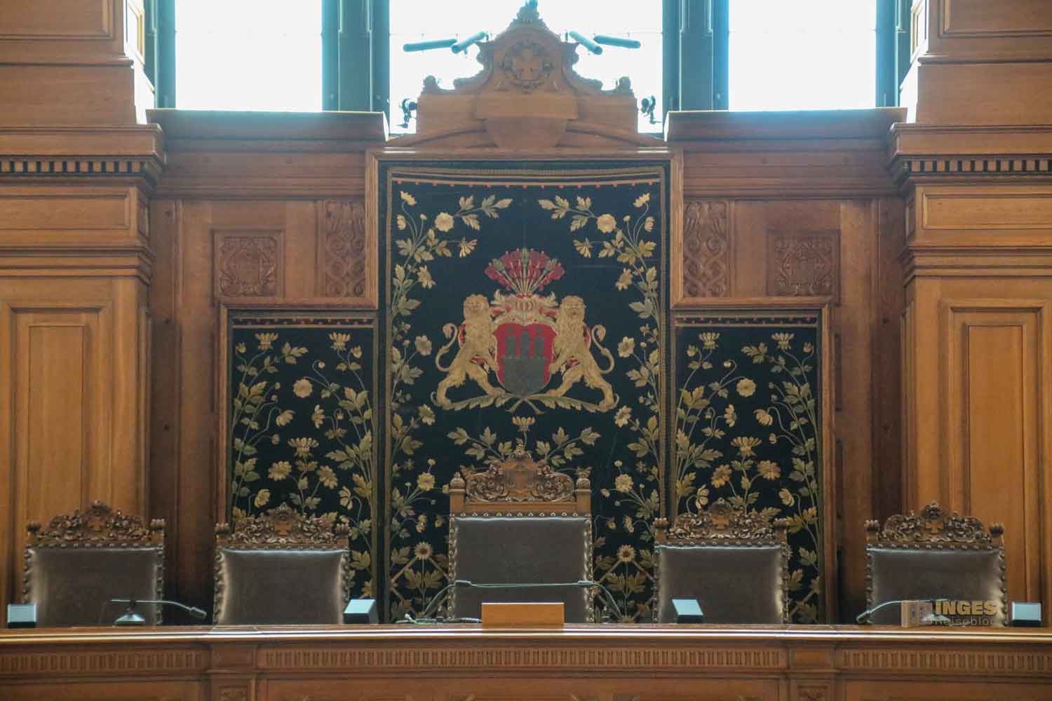 Sofort ins Auge fallen die Bürgermeisterplätze, quasi Ehrenplätze und natürlich wieder mit dem Wappen der Stadt. Darüber ein Baldachin und hinter den Sessel ein 2,60 hoher bestickter Wandbehang mit dem Hamburger Wappen. Geht in Gedanken, oder in meinem Bericht, mal ganz kurz zurück in den Plenarsaal. Hier hängt auch ein ähnlich gestickter Wappenteppich, aber natürlich nicht so prunk- und kunstvoll wie hier in der Ratsstube.