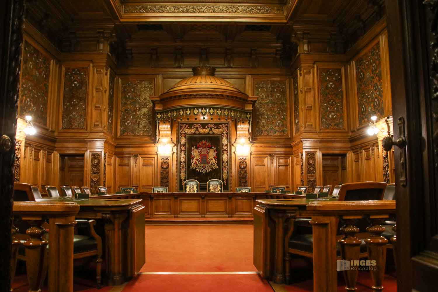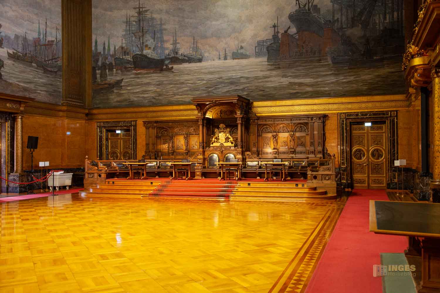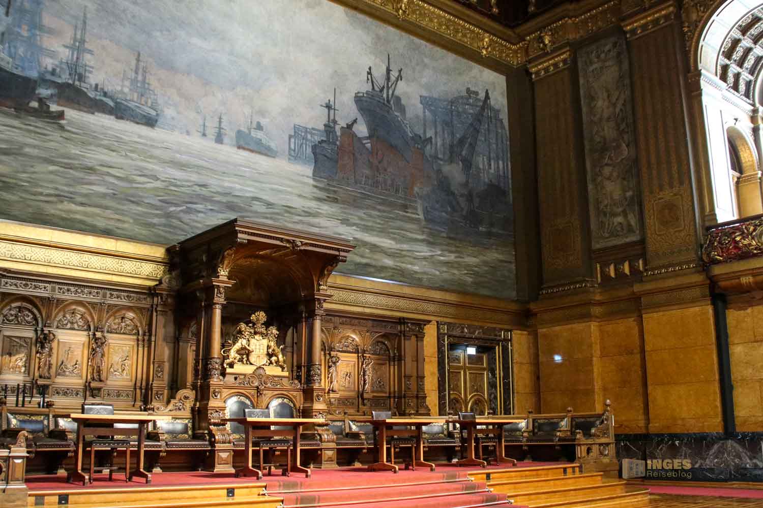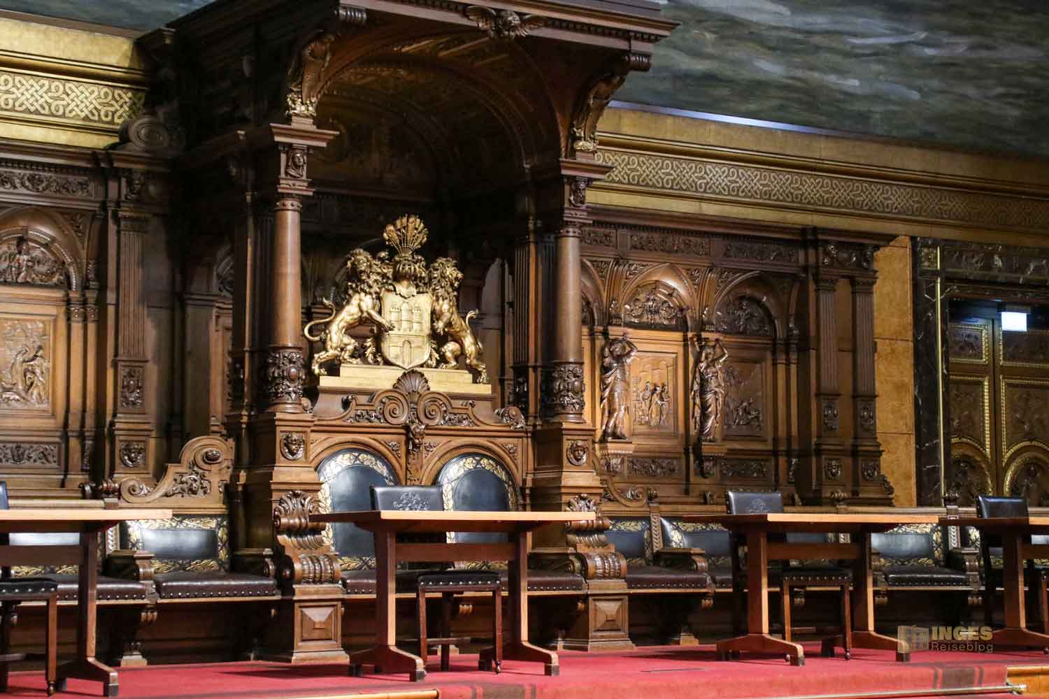 Fast könnte man meinen, hier regiert König und Königin. Prunkvoll geschnitzte Eichenstühle auf einem erhöhten Podest, natürlich mit dem Hamburger Wappen - hier ließen sich Bürgermeister und Senat bei feierlichen Staatsakten nieder. Dahinter ein großes Gemälde des neuen Hamburger Hafens.