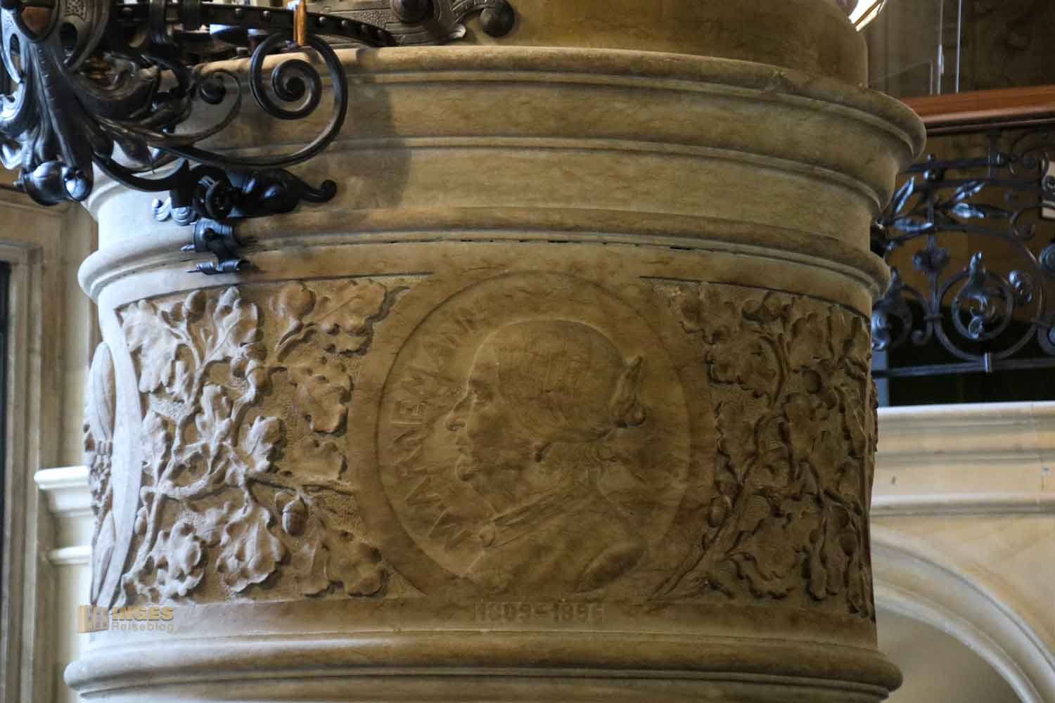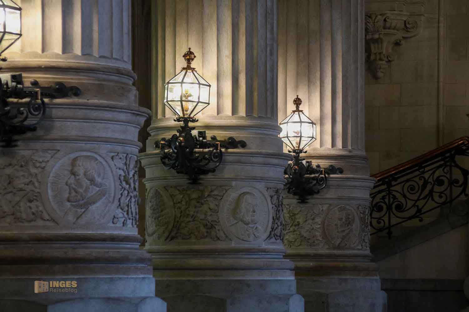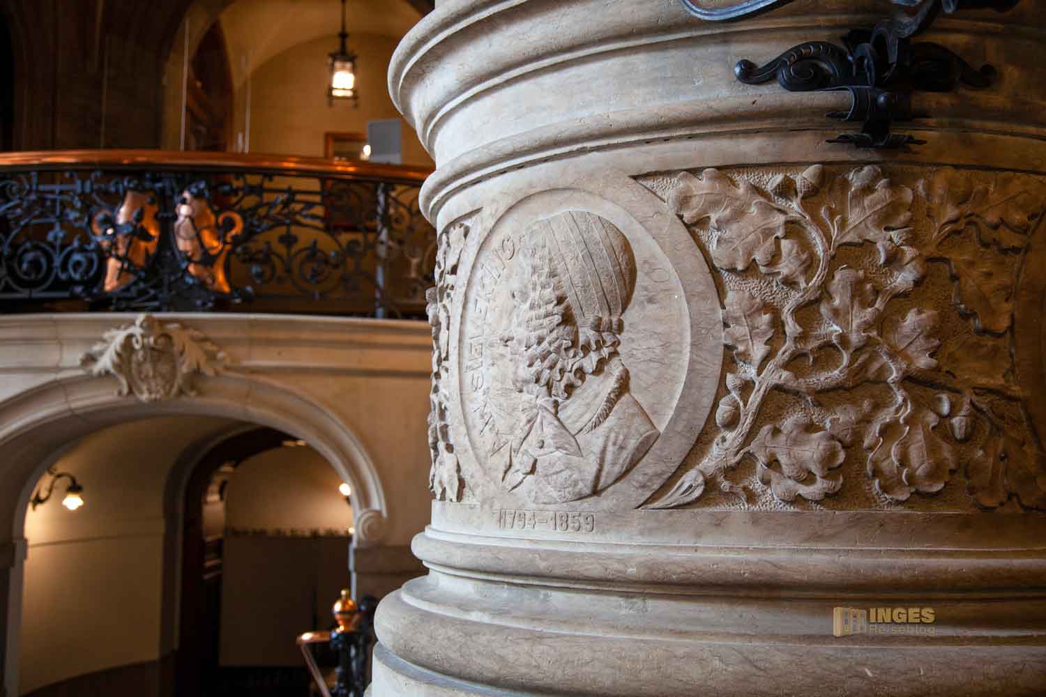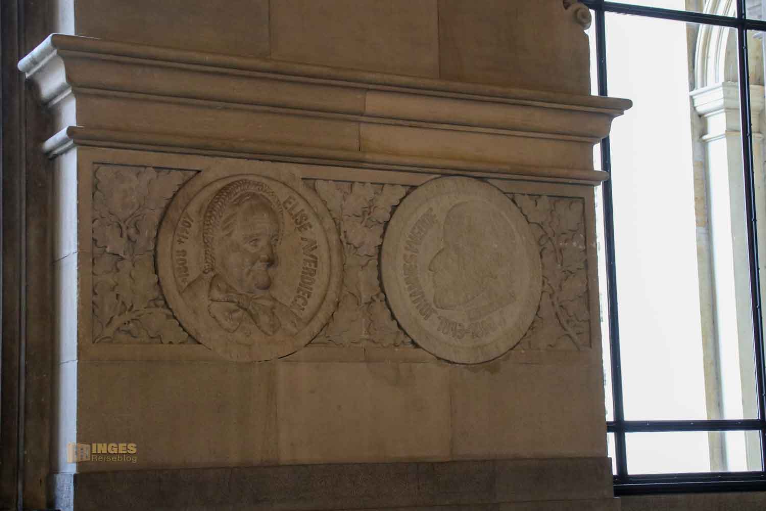 Anderswo hängt man vielleicht Bilder von Persönlichkeiten der Stadt an die Wände, nicht so hier im Rathaus. Hier bekamen Persönlichkeiten aus der Bürgerschaft medaillonförmige Reliefs in den Säulen. Männer sind hier ganz klar in der Überzahl, aber wenn ihr sucht, entdeckt ihr unter den Theologen, Historiker, Kaufleuten, Dichter und Maler auch ein paar Frauen. Insgesamt könnt ihr 64 Reliefs entdecken.