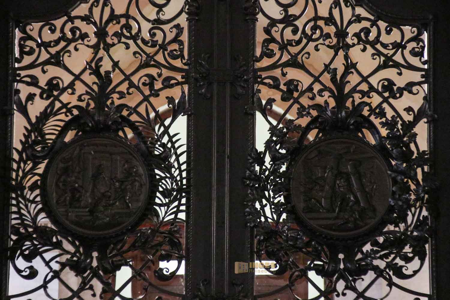 in die man durch ein herrliches schmiedeiserne Tor kommt. Vorher noch ein kurzer Blick zurück auf den Rathausplatz, was auch gut war, denn durch dieses Eingangstor kamen wir nicht zurück.