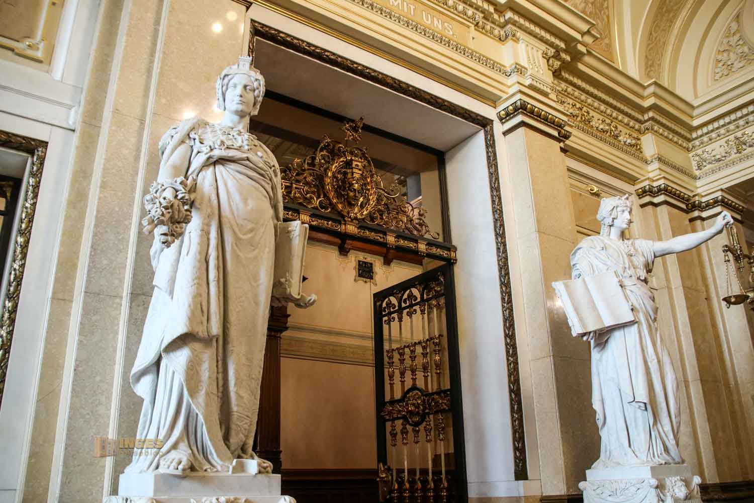 Bei der Begrüßung schauen zwei Damen ganz genau zu - die "Gnade" und die "Gerechtigkeit" als Erinnerung an die Gerichtsbarkeit des Senats, die 1860 endete. Hier kommt auch keiner weiter, der nicht darf. Dieser Bereich kann gut gesichert abgeriegelt werden. Aber wir sind ja in ganz friedlicher Mission hier 🙂