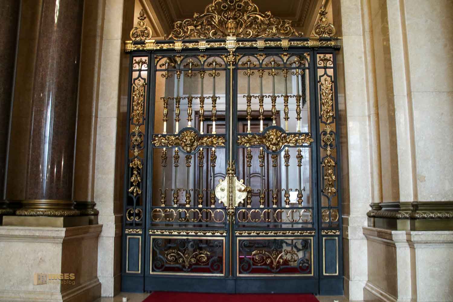 darf nur ... tadaaaaa ... der Hamburger Senat, es wird aber nur zu besonderen Anlässen geöffnet. Zwei Löwen bewachen den Zugang zu dem nur eine Treppe führt - die Landesregierung hat auf dieser Seite ihren Platz. Das schmiedeiserne Tor - natürlich mit dem Wappen der Hansestadt - ist reich verziert und auch noch mit einem aussagefähigen Sandsteinbogen eingefasst. Schaut mal genau, was ihr dort alles findet ....
