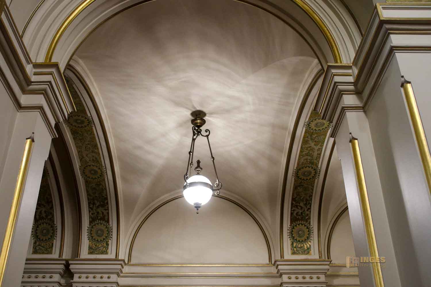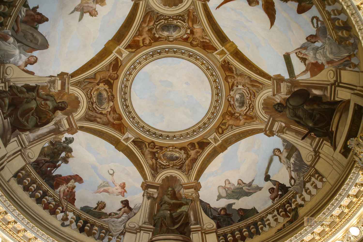 Mit Blick nach oben könnte man meinen, man schaut in den Himmel. Gekonnt gemalt diese Illusion, die die Balustraden rundum noch verstärkt. In den Nischen dazwischen verkörpern scheinbare Bronzeplastiken die Tugenden die in dieser Bauzeit großen Stellenwert hatten: die Sittlichkeit, Menschenliebe, Vaterlandsliebe und die Wissenschaft. Die Plastiken sind aber nur gemalt.
