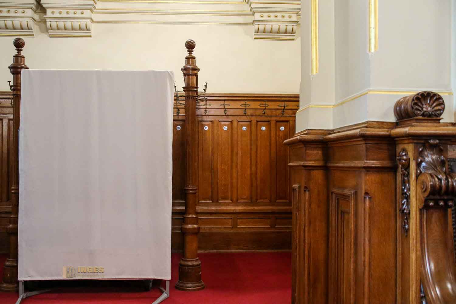 wo sich die Abgeordneten vor Beginn der Sitzungen treffen. Ein Schmunzeln hat mir die Ecke mit den Kleiderhaken entlockt - wie in der Schule (oder Kindergarten) bekommt jeder Abgeordnete seinen Kleiderhaken 🙂 Fast könnte man denken, der Baumeister, der dort auch seine Ehrung bekommen hat, behält den Überblick wer sich da so tummelt.