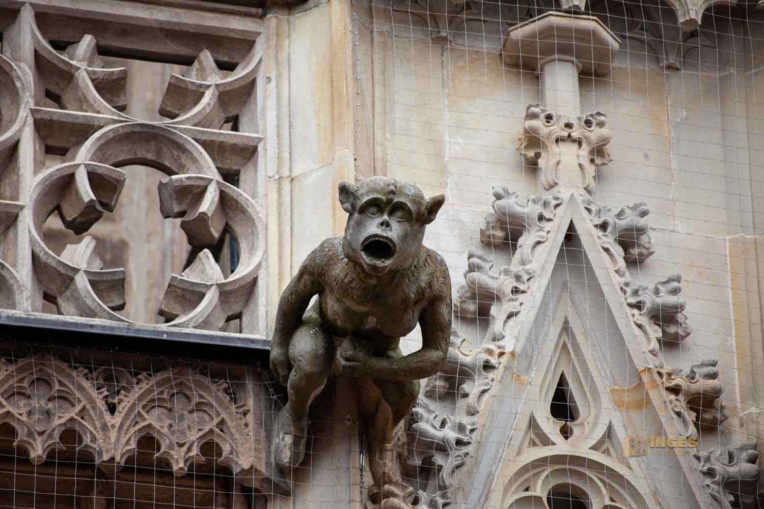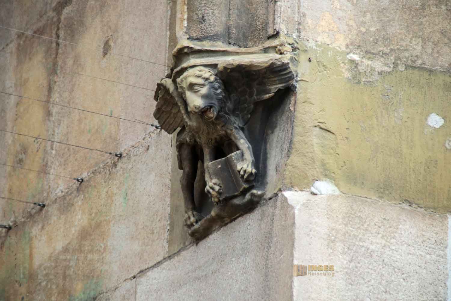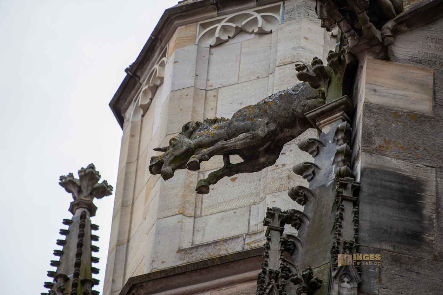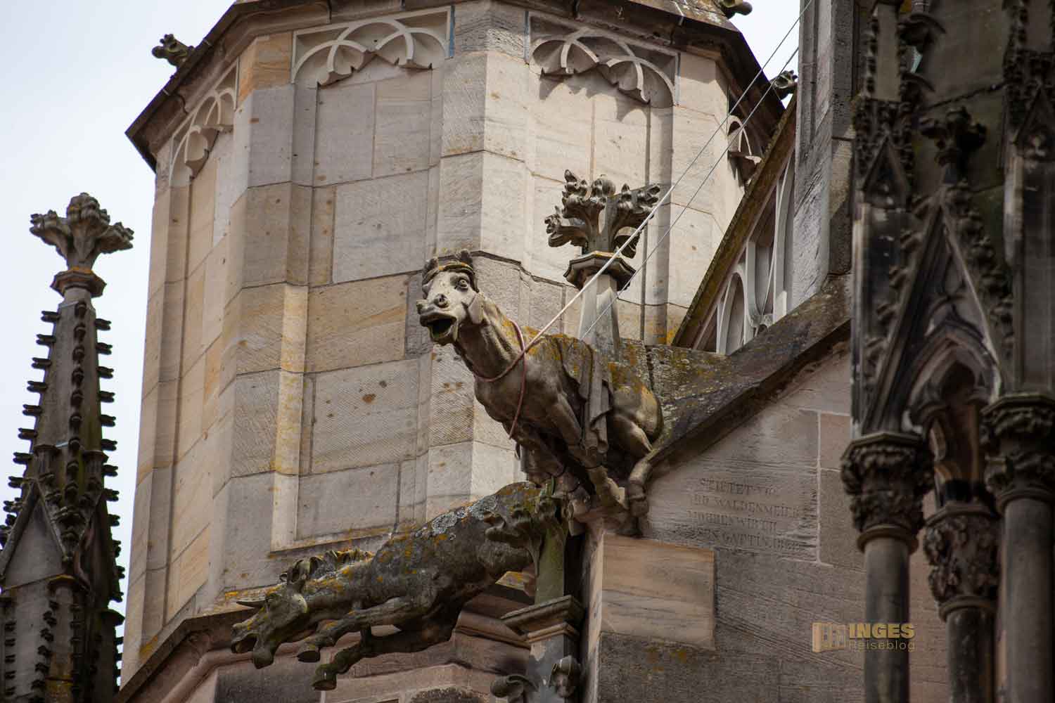 Direkt vor der Kirche, auf dem Münsterplatz, kommt man sich vor dem Münster schon ziemlich klein vor. Ich kann es ja nicht lassen, mein Kopf muss in den Nacken und wenn ihr mir nachtut, dann werdet ihr rings um das Münster in luftiger Höhe Figuren und Wasserspeier entdecken. Um genauer zu sein, 80 Stück sollen es sein, ihr könnt nachzählen. Sie haben mehrere Funktionen, die Wasserspeier ist klar, steht bei Regen tunlichst nicht drunter 😉 - die Figuren hatten zu dieser Zeit aber auch den Zweck das Böse fernzuhalten. Bei der Stiftskirche in Faurndau hat man dies auch reichlich mit Figuren versucht. Ich hab sie euch mal ein bisschen näher geholt ....