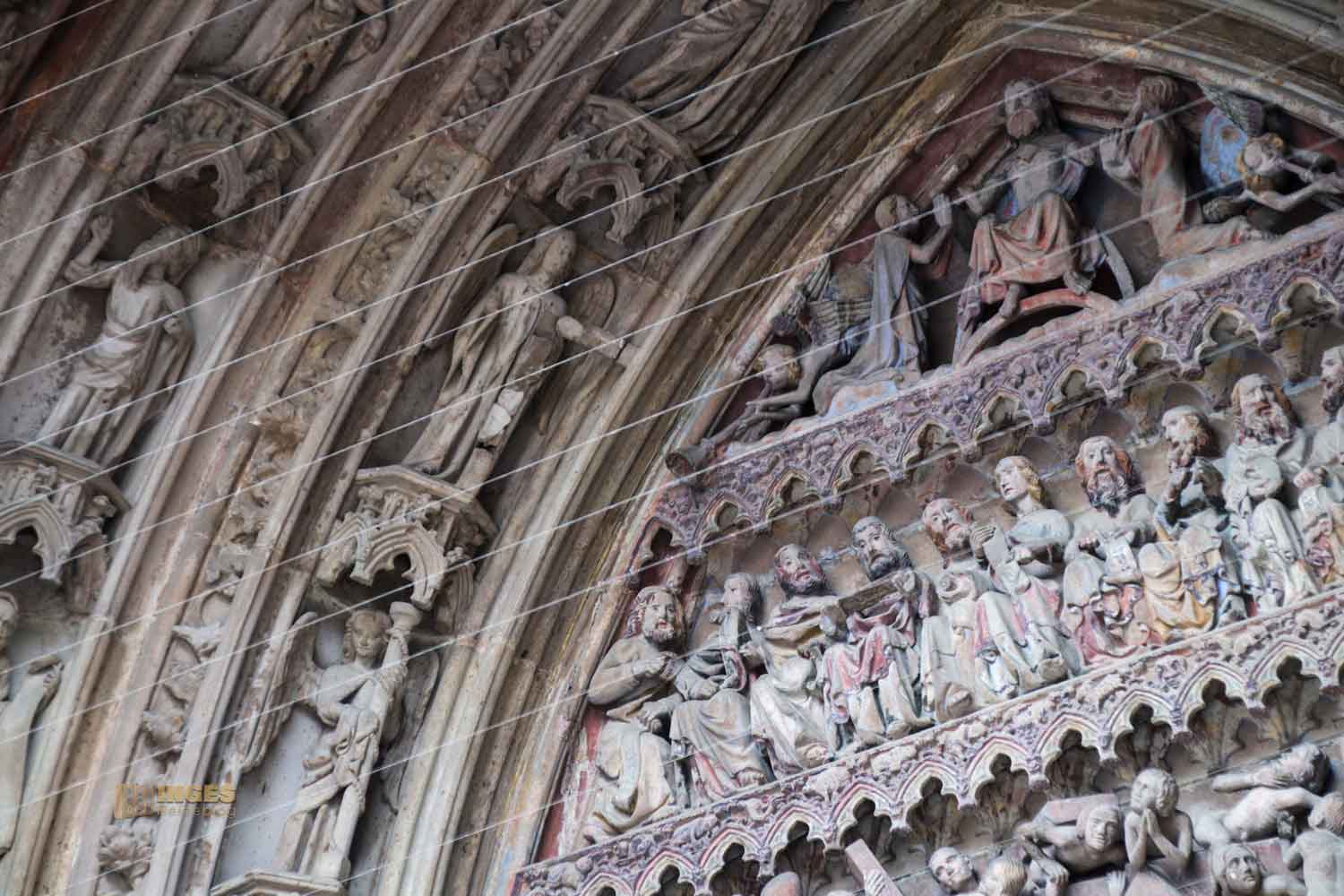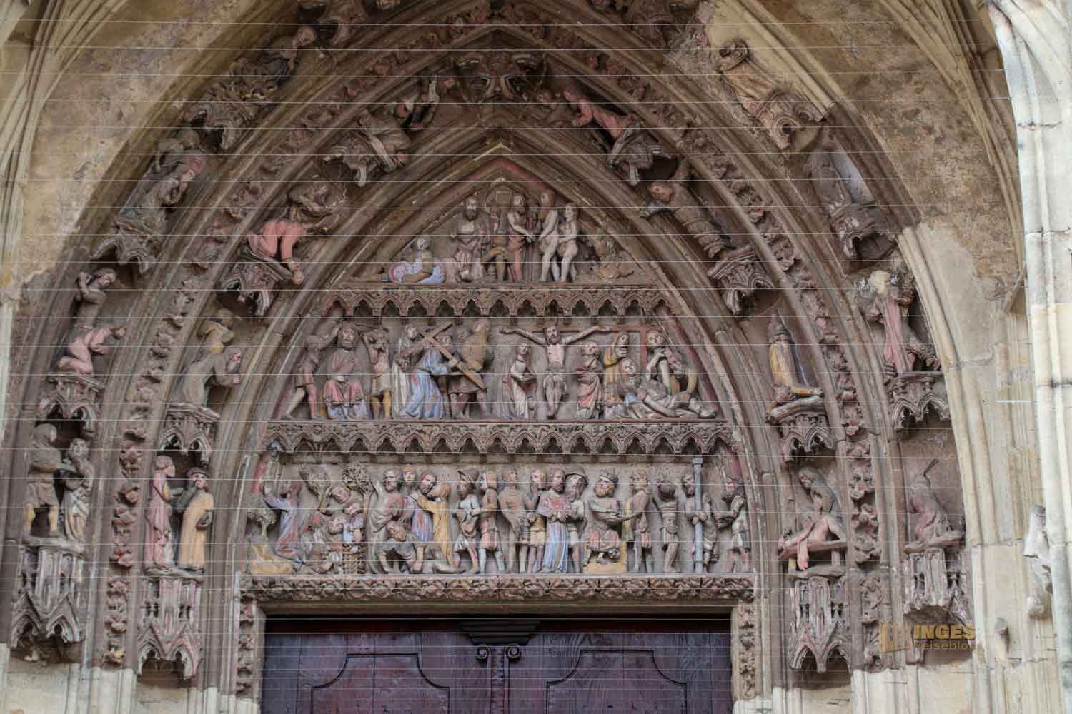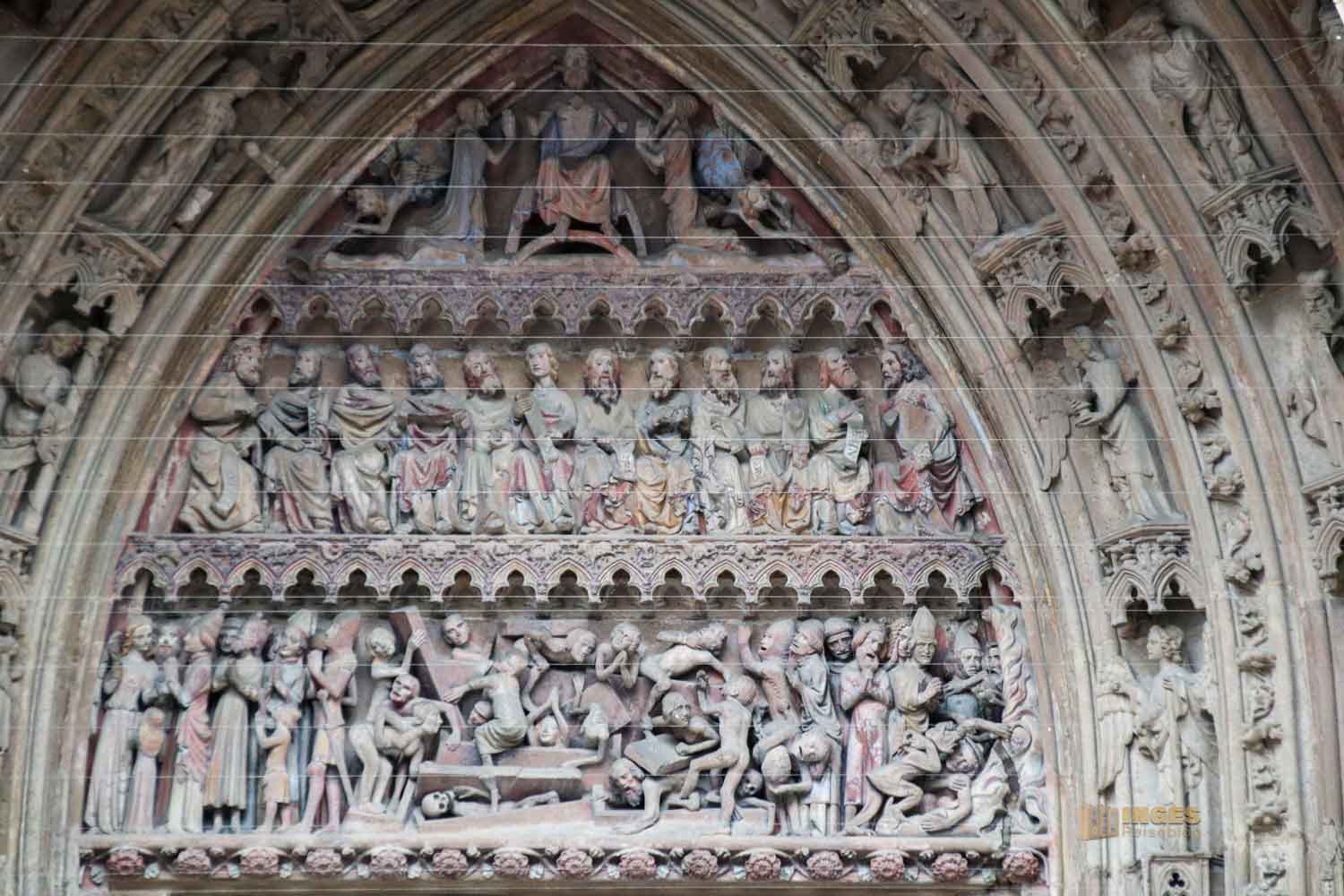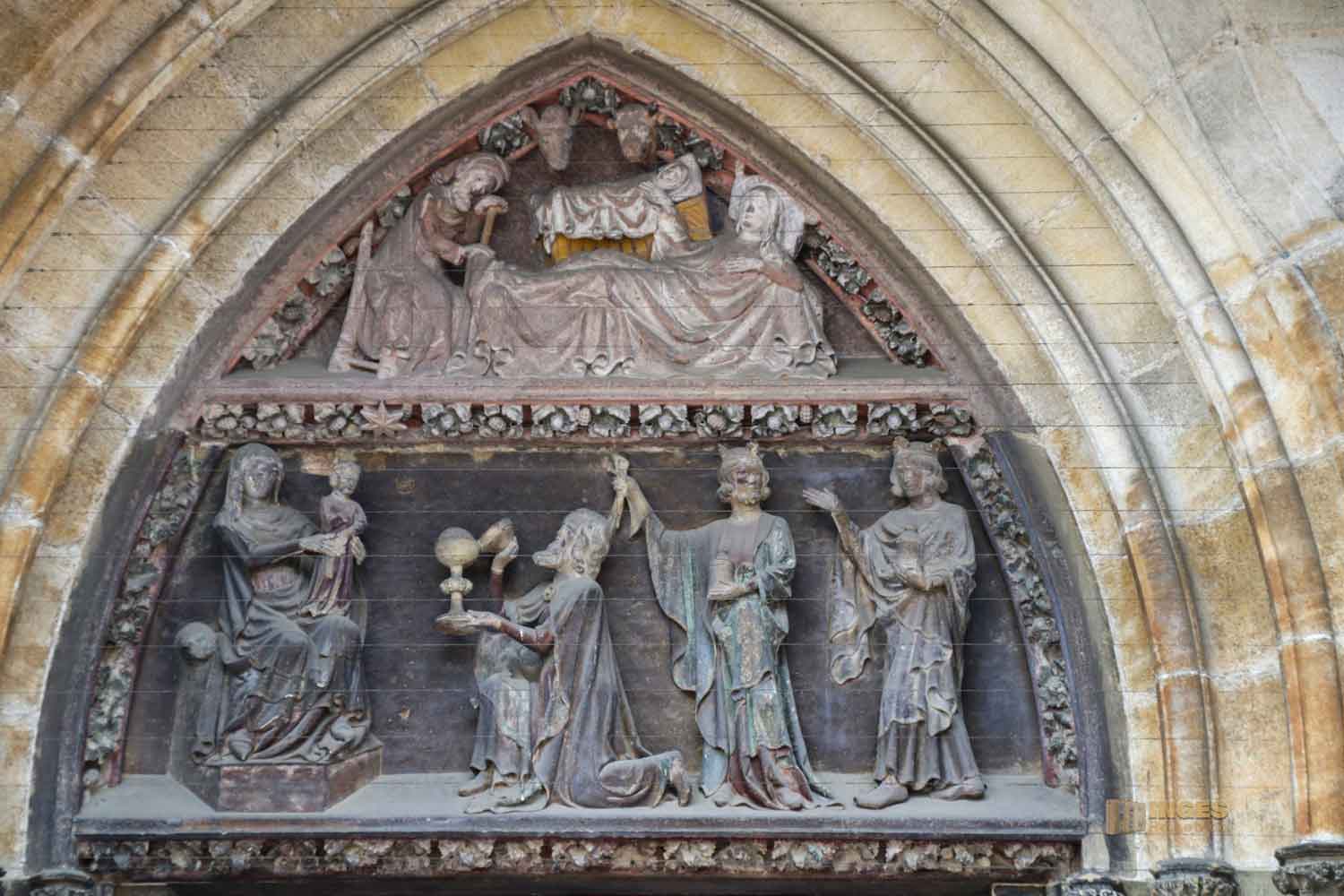 Dieses Portal ist Maria, der Mutter Gottes, gewidmet. Ganz oben wird die Krönung Marias gezeigt, aber auch die schmerzhafte Szene mit ihrem Tod.