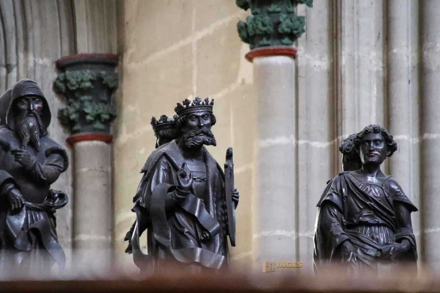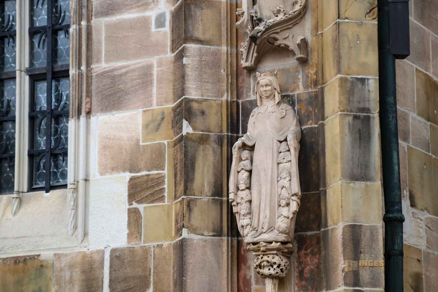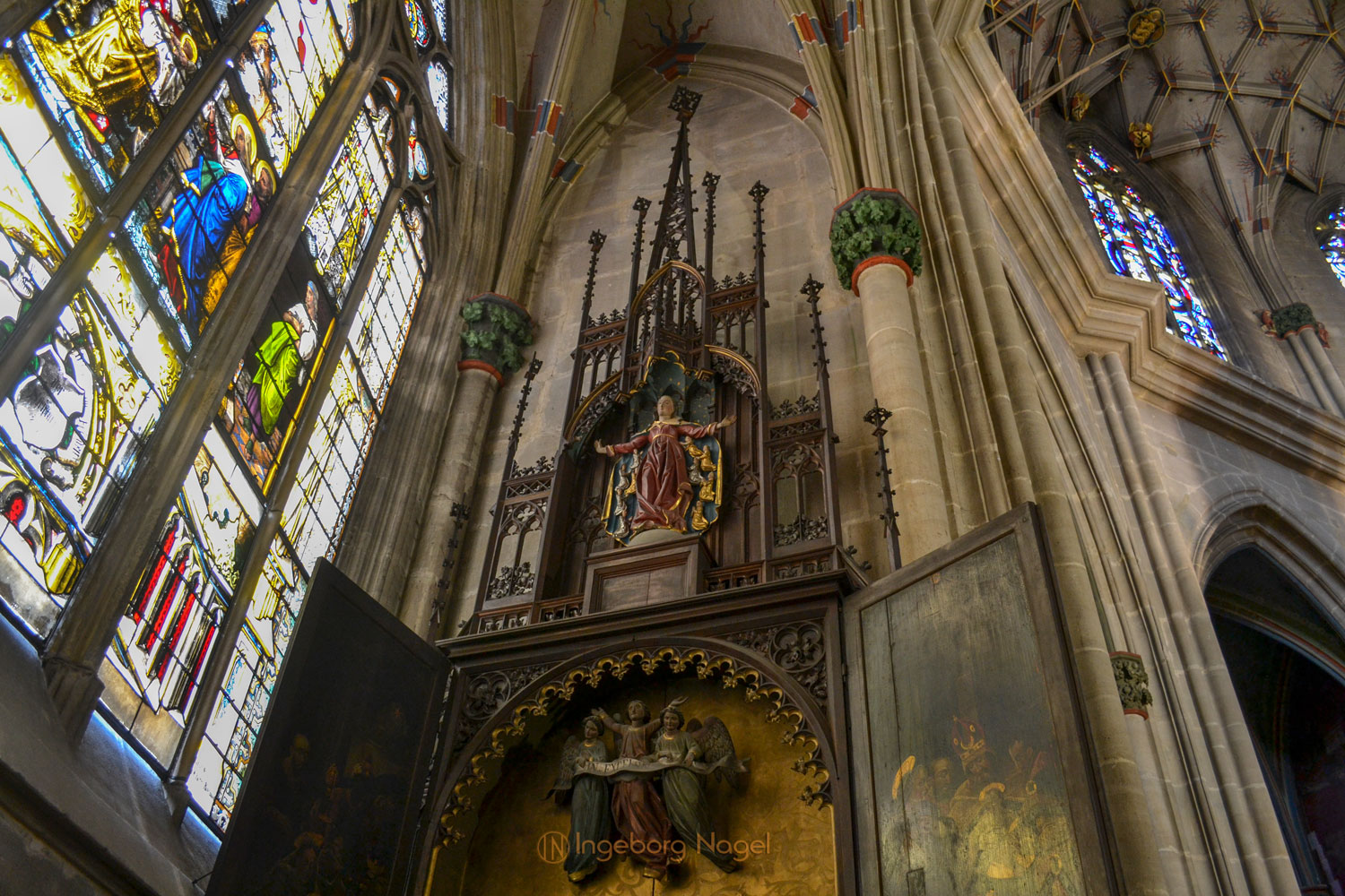 Es kam die Zeit, dass Karl IV. Kaiser des deutschen-römischen Reiches, von Böhmen und Italien wurde und das Schwabenland ebenso unter sein Regiment fiel. Wenn ihr mehr über Karl IV. nachlesen möchtet, könnt ihr das in meinen Prag-Berichten, oder mit mir den Königsweg durch Prag gehen, den er eingeführt hat. Jedenfalls hat Karl IV. Gmünd einen Besuch abgestattet, Peter Parlers Werk gesehen und ihn nach Prag abgeworben als seinen Hofbaumeister. Ein Bruder Parlers hat noch eine Zeit den Bau weiterbetreut, bis er nach Ulm abgewandert ist.