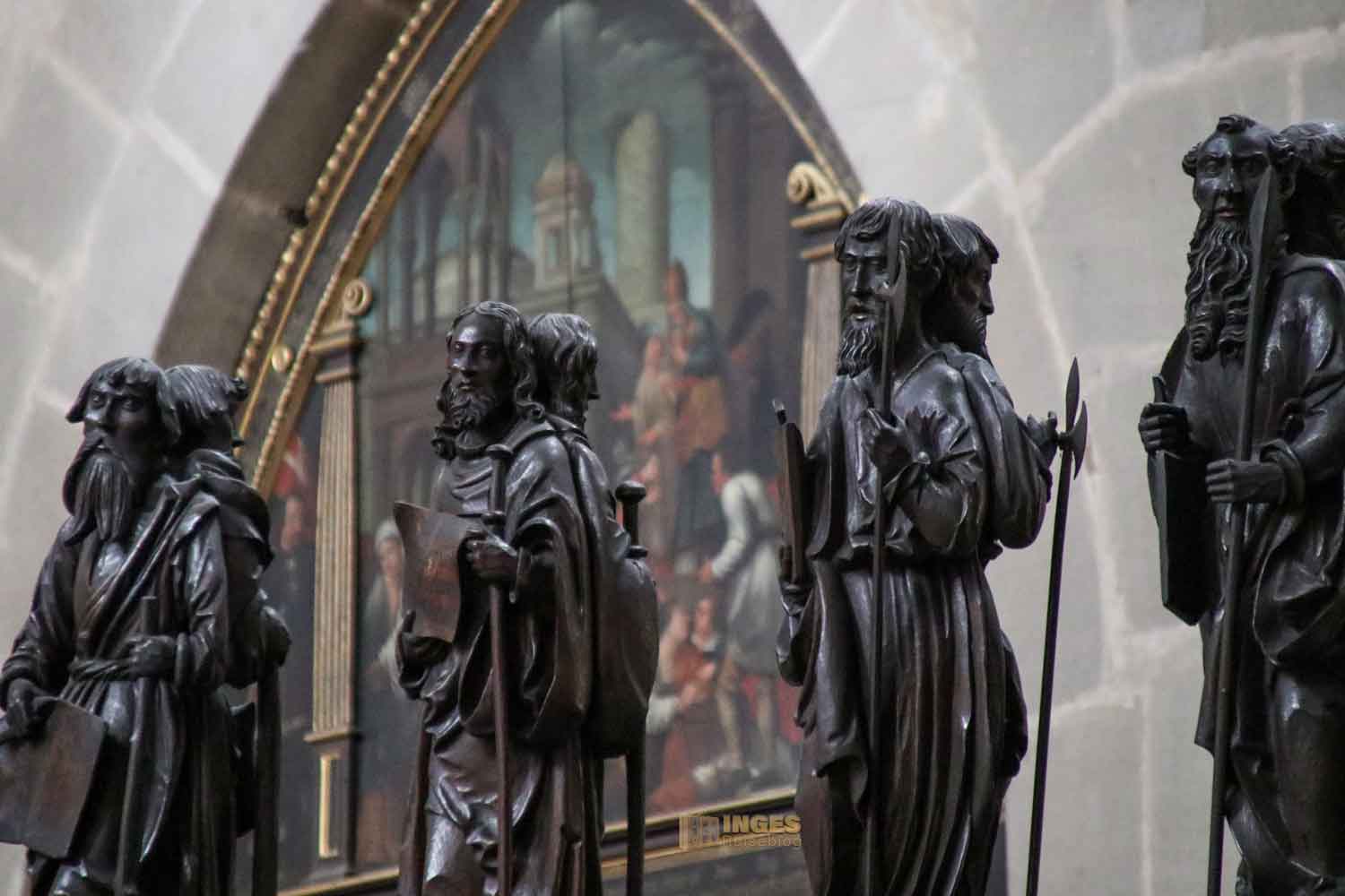Ab 1506 ist dieser Altar, der nach seinem Spender und zugleich zu Ehren des Heiligen benannt wurde, entstanden. Anders als der Stifter des Altars, der Nürnberger Patrizier Sebald Schreyer, verschmähte der Hl. Sebaldus seinen Stand in den er hineingeboren wurde. Man sagt, er wäre ein dänischer Königssohn gewesen, der mit einer Prinzessin verlobt war. Doch er verzichtete auf das Leben am Königshof, löste seine Verlobung um fortan als Einsiedler zu leben. 15 Jahre lang soll er in der Wildnis um Nürnberg gelebt haben, deshalb nennt man ihn auch Sebaldus v. Nürnberg. Viele Wunder soll er bewirkt haben, so ließ er z.B. auf der Suche nach einem verloren gegangen Ochsen seine Finger wie Lampen leuchten, damit der Bauer das Tier wieder fand. Wenn ihr mehr über ihn nachlesen möchtet, dann klickt HIER.