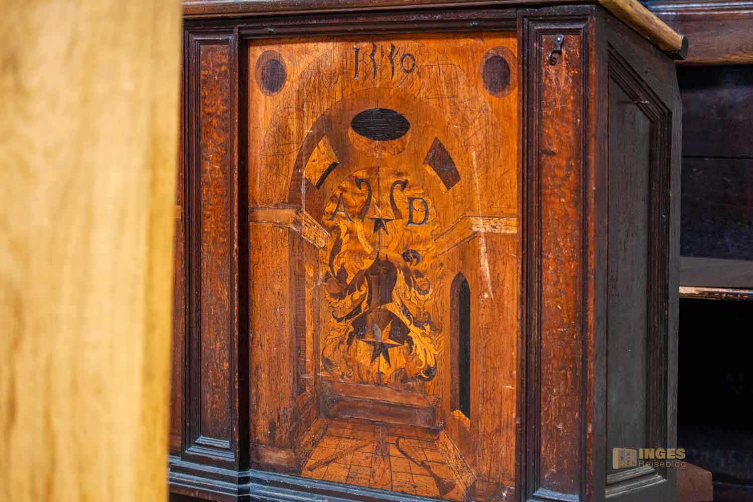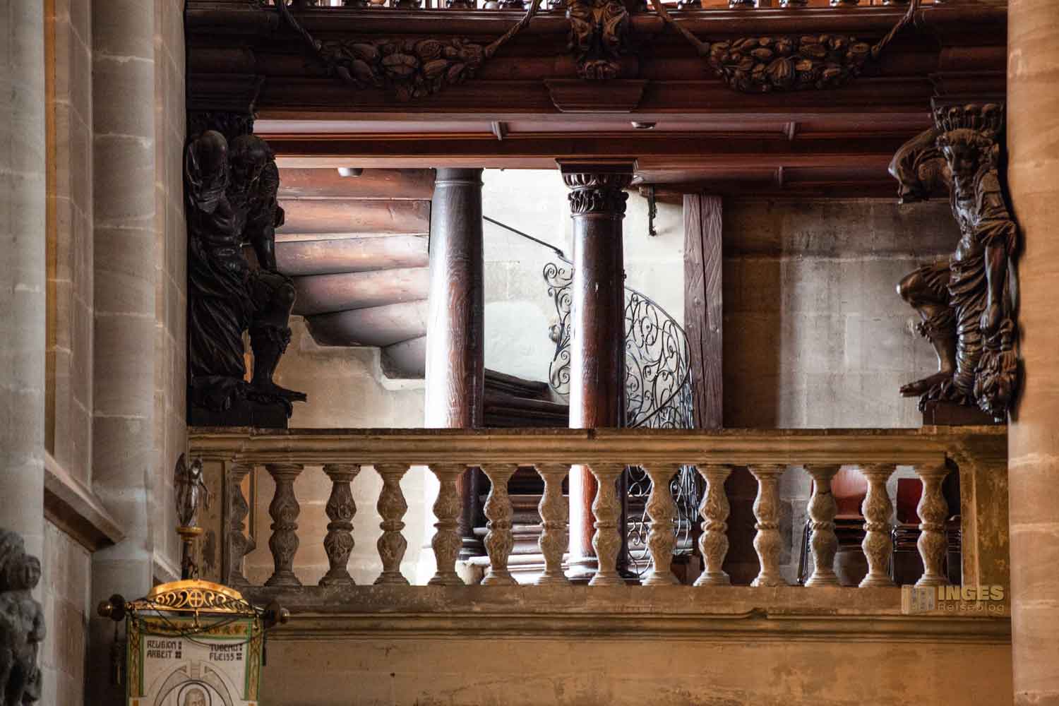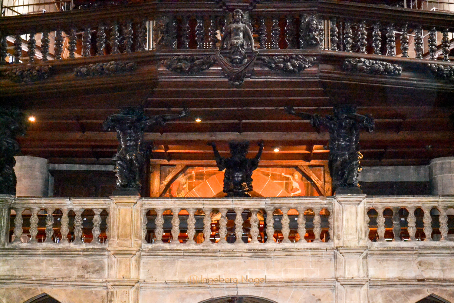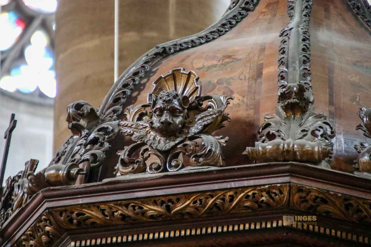 Perfekt in die Zwischenräume der Säulen wurden 24 Sitze des Chorgestühls eingepasst. Es ist das zweite Chorgestühl in der Kirche, und stammt von 1550. Warum? Dazu erfahrt ihr später mehr, wenn ich im Kapellenkranz bin. Ich hab ja wirklich schon die feinsten Arbeiten an Chorgestühlen in den Kirchen gesehen, aber solch eine wunderschöne Intarsienarbeit noch nicht. Sie stammt aus der Renaissance-Zeit und ihr müsst sie wirklich genauer anschauen. Intarsien könnt ihr ja auch an der Kanzel bewundern.