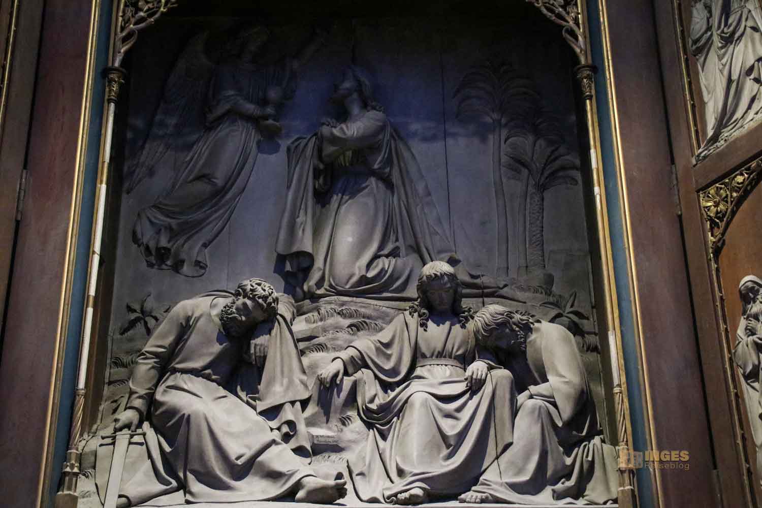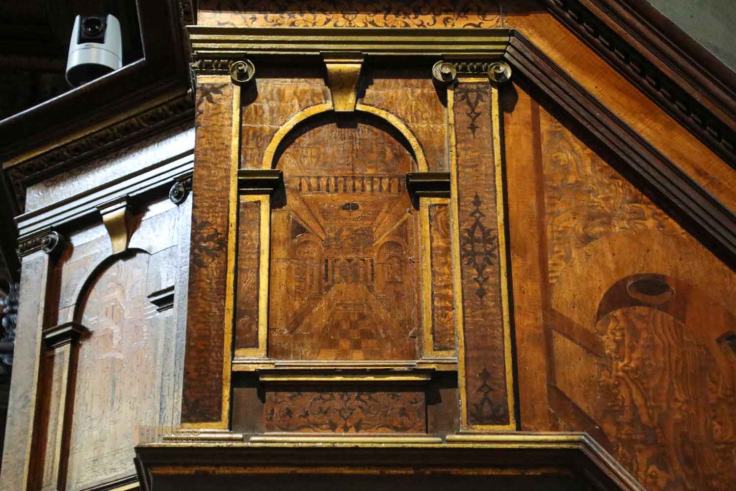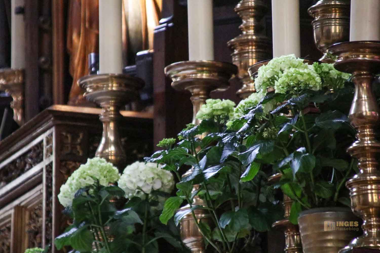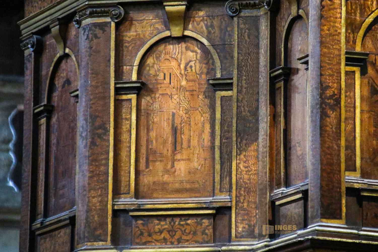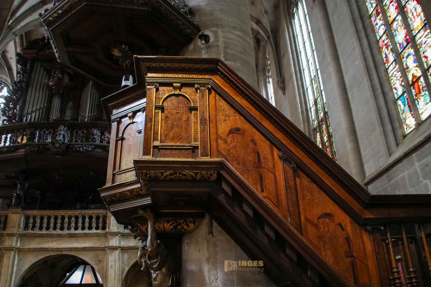 Perfekt in die Zwischenräume der Säulen wurden 24 Sitze des Chorgestühls eingepasst. Es ist das zweite Chorgestühl in der Kirche, und stammt von 1550. Warum? Dazu erfahrt ihr später mehr, wenn ich im Kapellenkranz bin. Ich hab ja wirklich schon die feinsten Arbeiten an Chorgestühlen in den Kirchen gesehen, aber solch eine wunderschöne Intarsienarbeit noch nicht. Sie stammt aus der Renaissance-Zeit und ihr müsst sie wirklich genauer anschauen. Intarsien könnt ihr ja auch an der Kanzel bewundern.