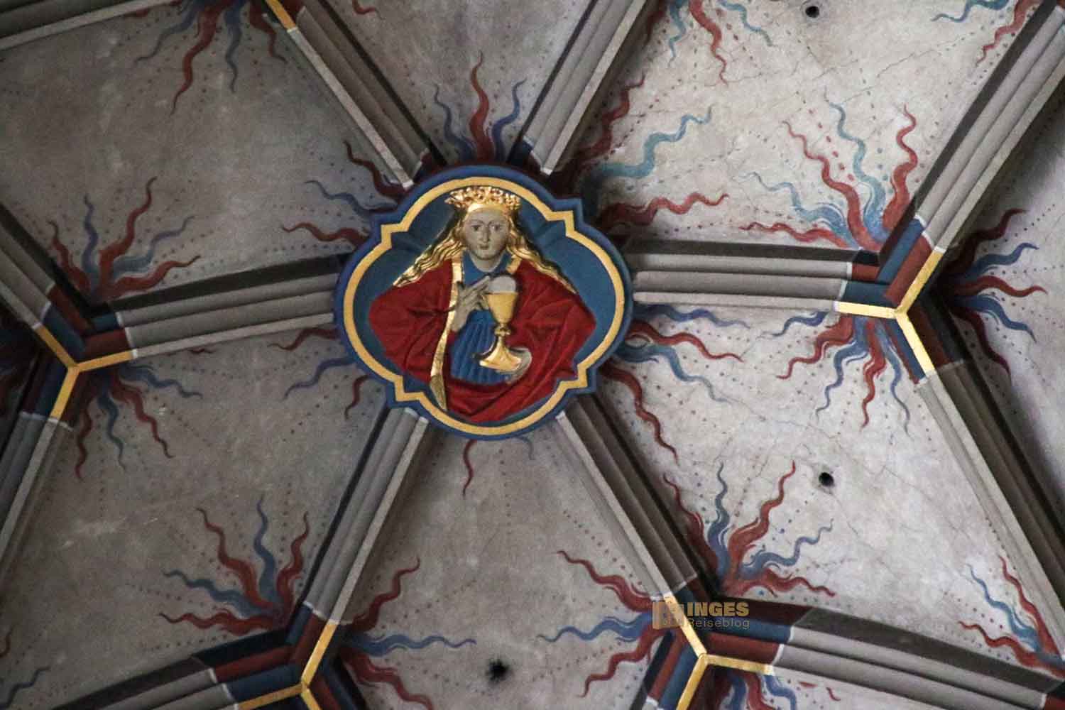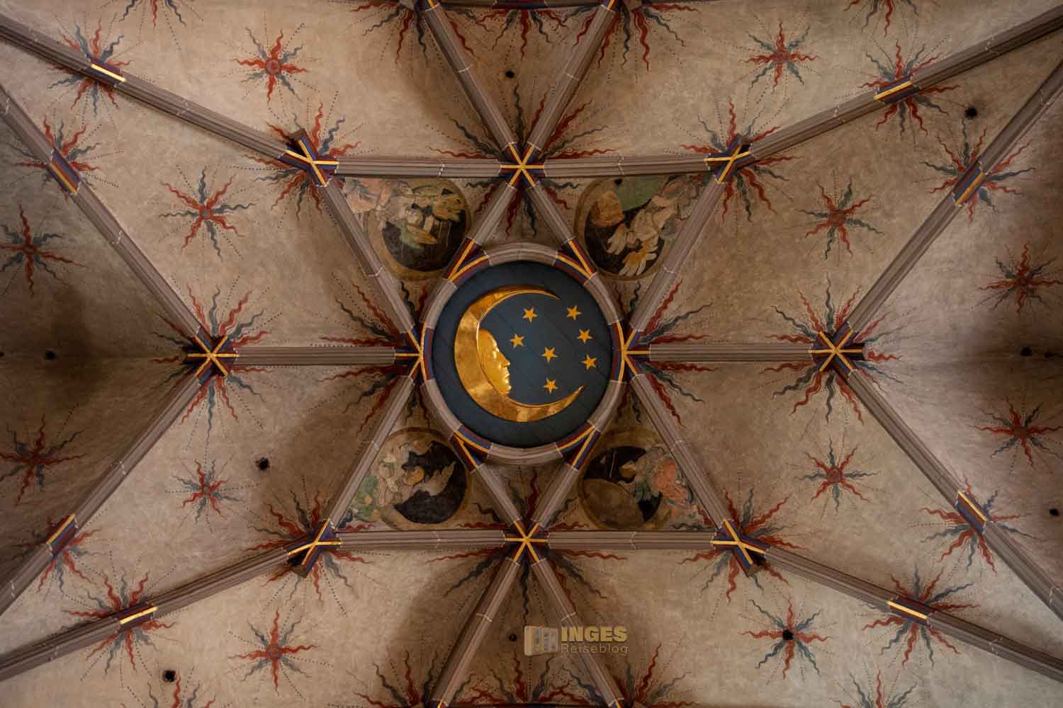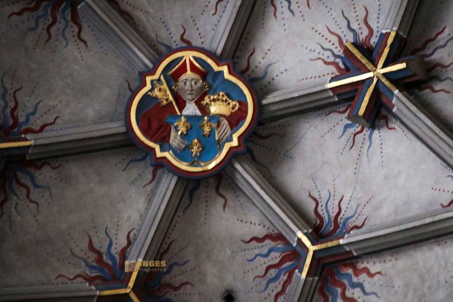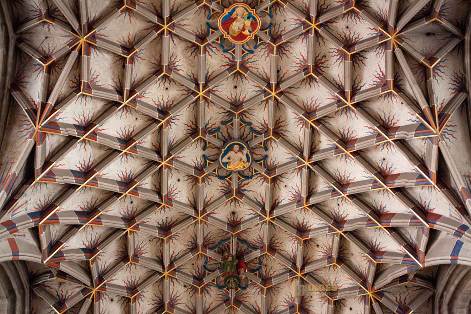 Ganz am Anfang meiner Berichte habe diesen Blick oft versäumt, jetzt fehlt er in keiner Kirche. Denn ganz besondere Schätzchen lassen sich oben an der Decke entdecken. 19, bzw. 21 Meter geht mein Blick hoch in das prachtvolle Netzgewölbe, das von 22 Säulen getragen wird. Und da trumpft das Gewölbe im Chor wirklich auf, denn hier finden sich die schön gestalteten Schlusssteine. Am höchsten Punkt eines Gewölbes werden sie angebracht, und so schön sie auch gestaltet sind, haben sie doch auch funktionale Zwecke.