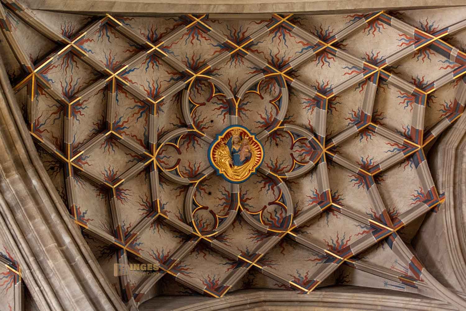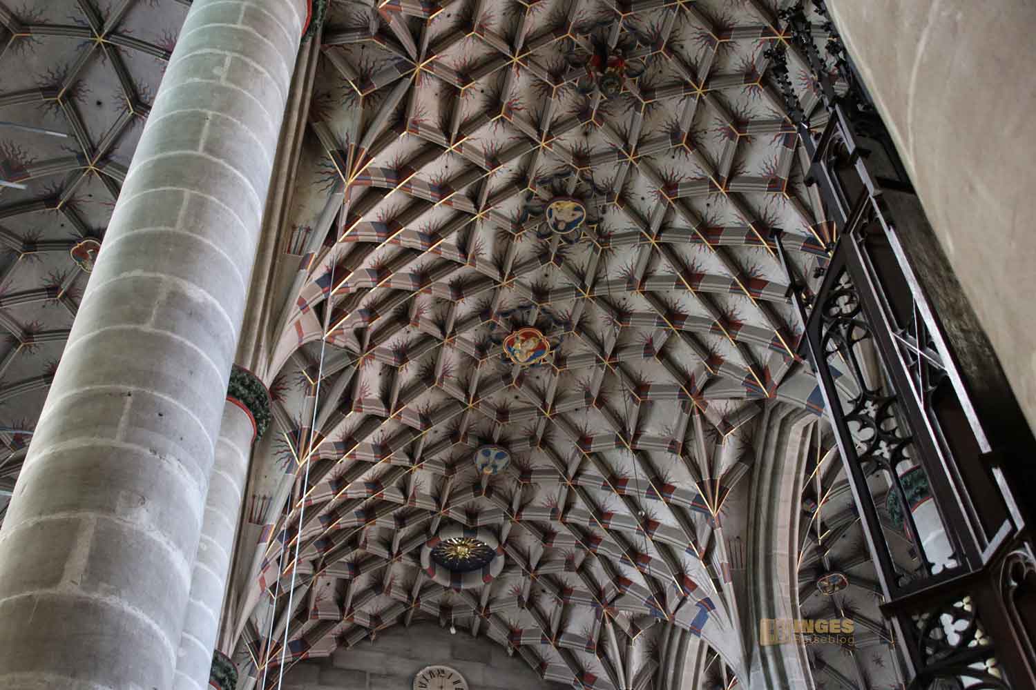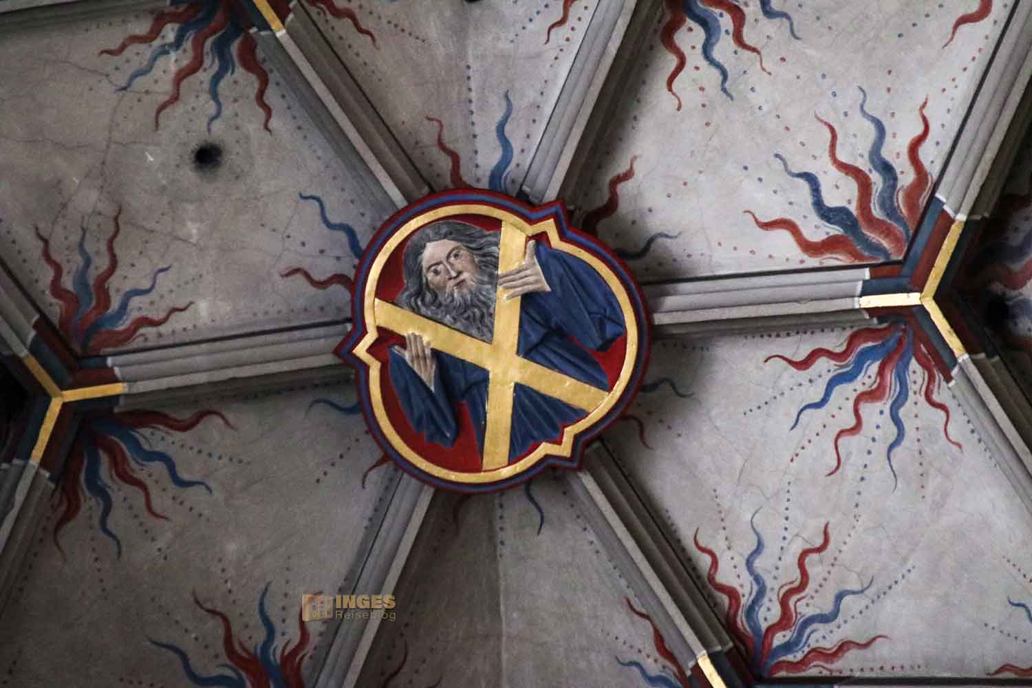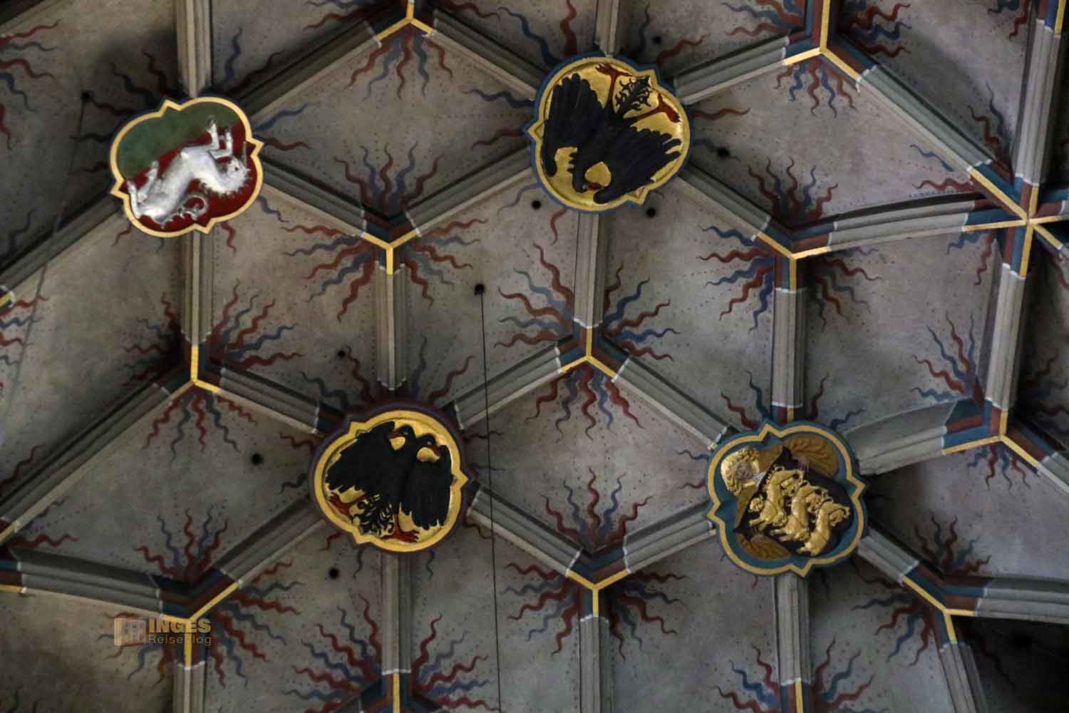 Ganz am Anfang meiner Berichte habe diesen Blick oft versäumt, jetzt fehlt er in keiner Kirche. Denn ganz besondere Schätzchen lassen sich oben an der Decke entdecken. 19, bzw. 21 Meter geht mein Blick hoch in das prachtvolle Netzgewölbe, das von 22 Säulen getragen wird. Und da trumpft das Gewölbe im Chor wirklich auf, denn hier finden sich die schön gestalteten Schlusssteine. Am höchsten Punkt eines Gewölbes werden sie angebracht, und so schön sie auch gestaltet sind, haben sie doch auch funktionale Zwecke.