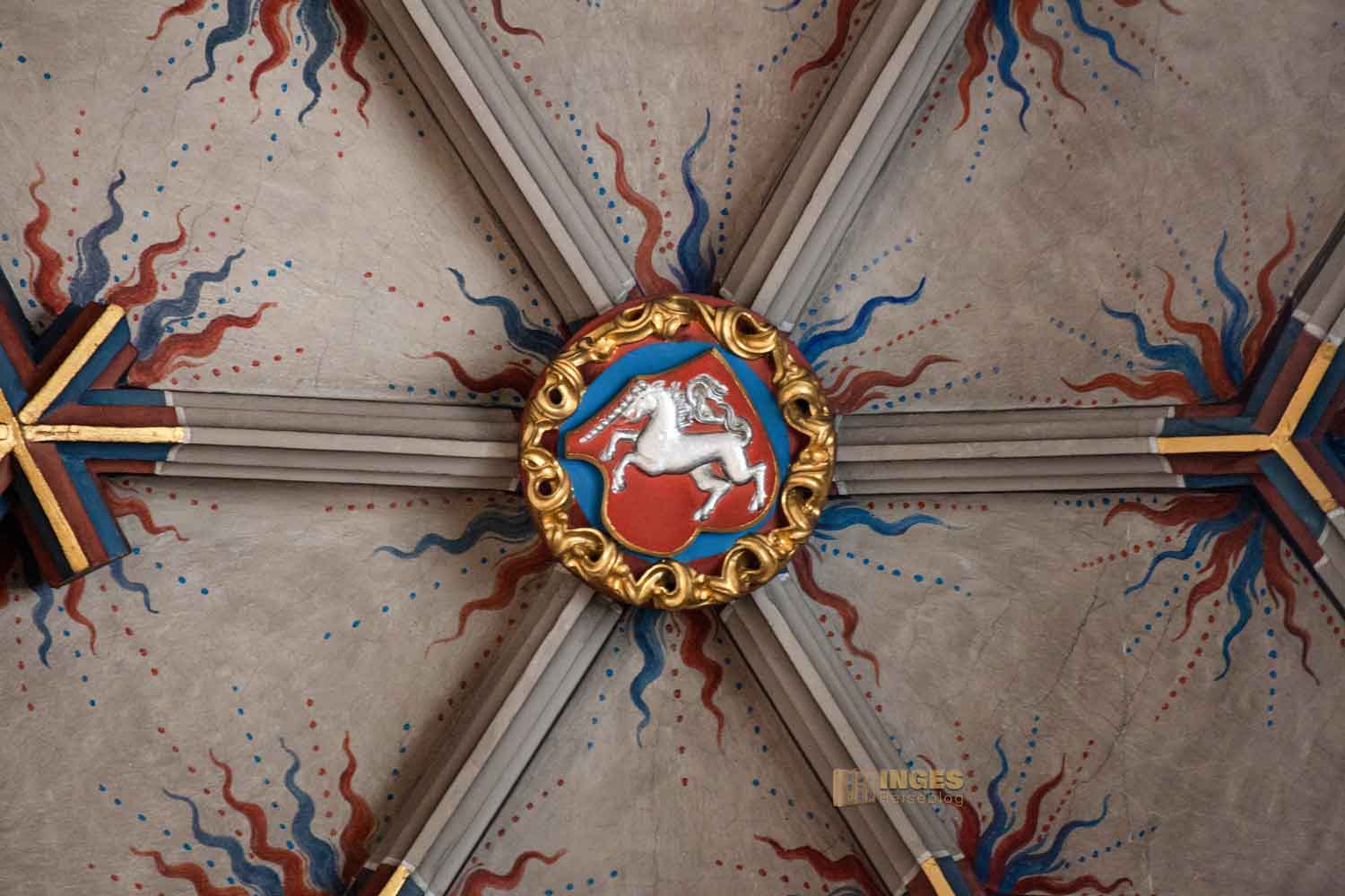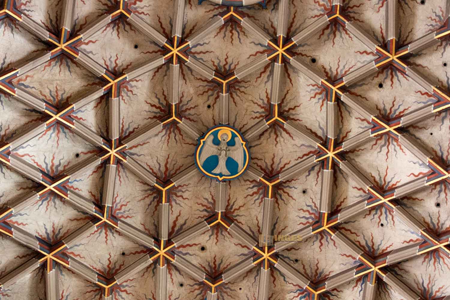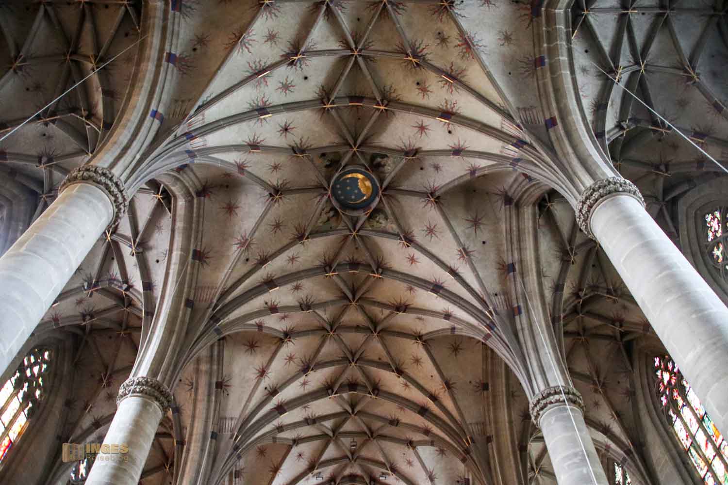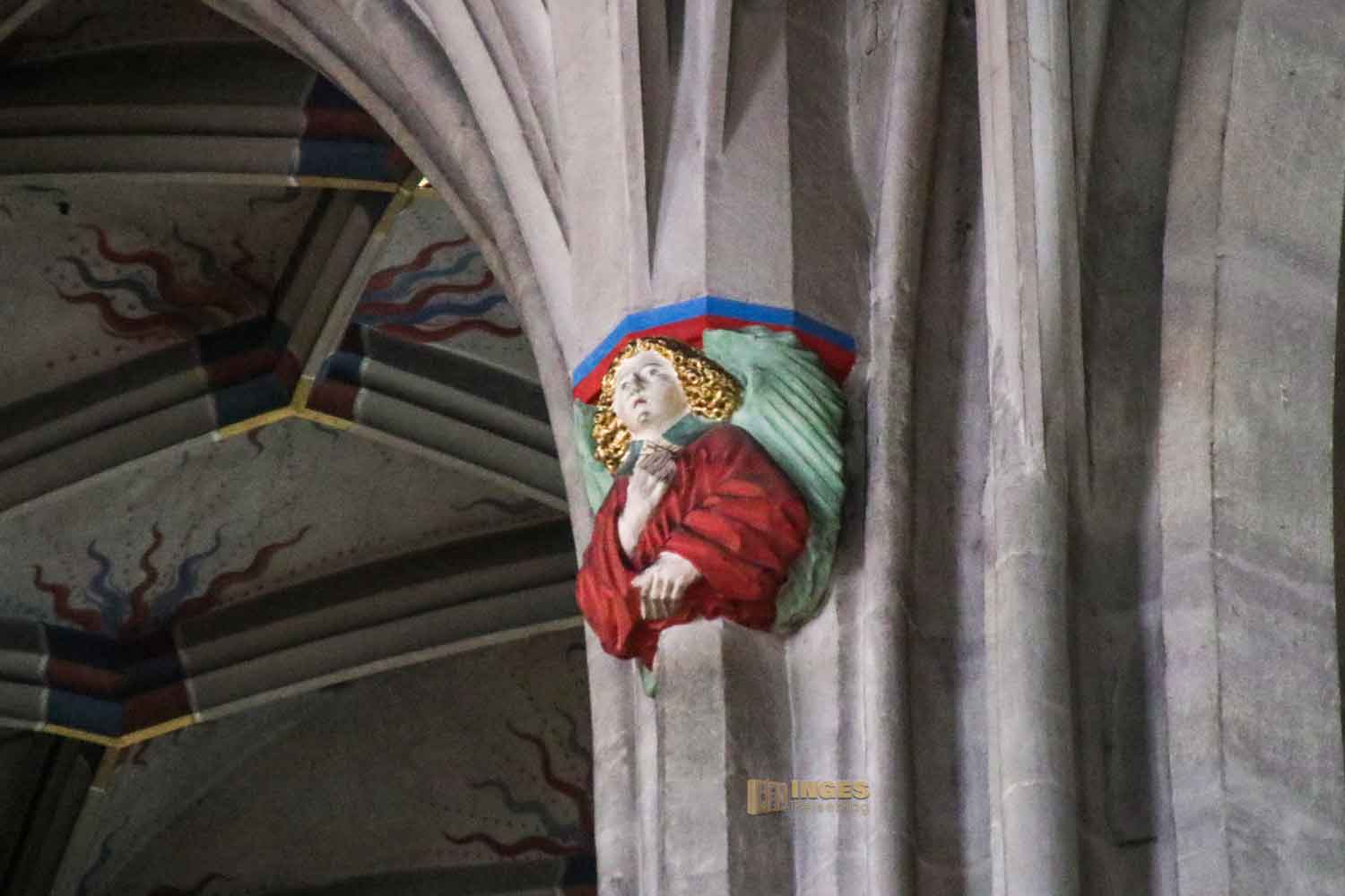 Ganz am Anfang meiner Berichte habe diesen Blick oft versäumt, jetzt fehlt er in keiner Kirche. Denn ganz besondere Schätzchen lassen sich oben an der Decke entdecken. 19, bzw. 21 Meter geht mein Blick hoch in das prachtvolle Netzgewölbe, das von 22 Säulen getragen wird. Und da trumpft das Gewölbe im Chor wirklich auf, denn hier finden sich die schön gestalteten Schlusssteine. Am höchsten Punkt eines Gewölbes werden sie angebracht, und so schön sie auch gestaltet sind, haben sie doch auch funktionale Zwecke.