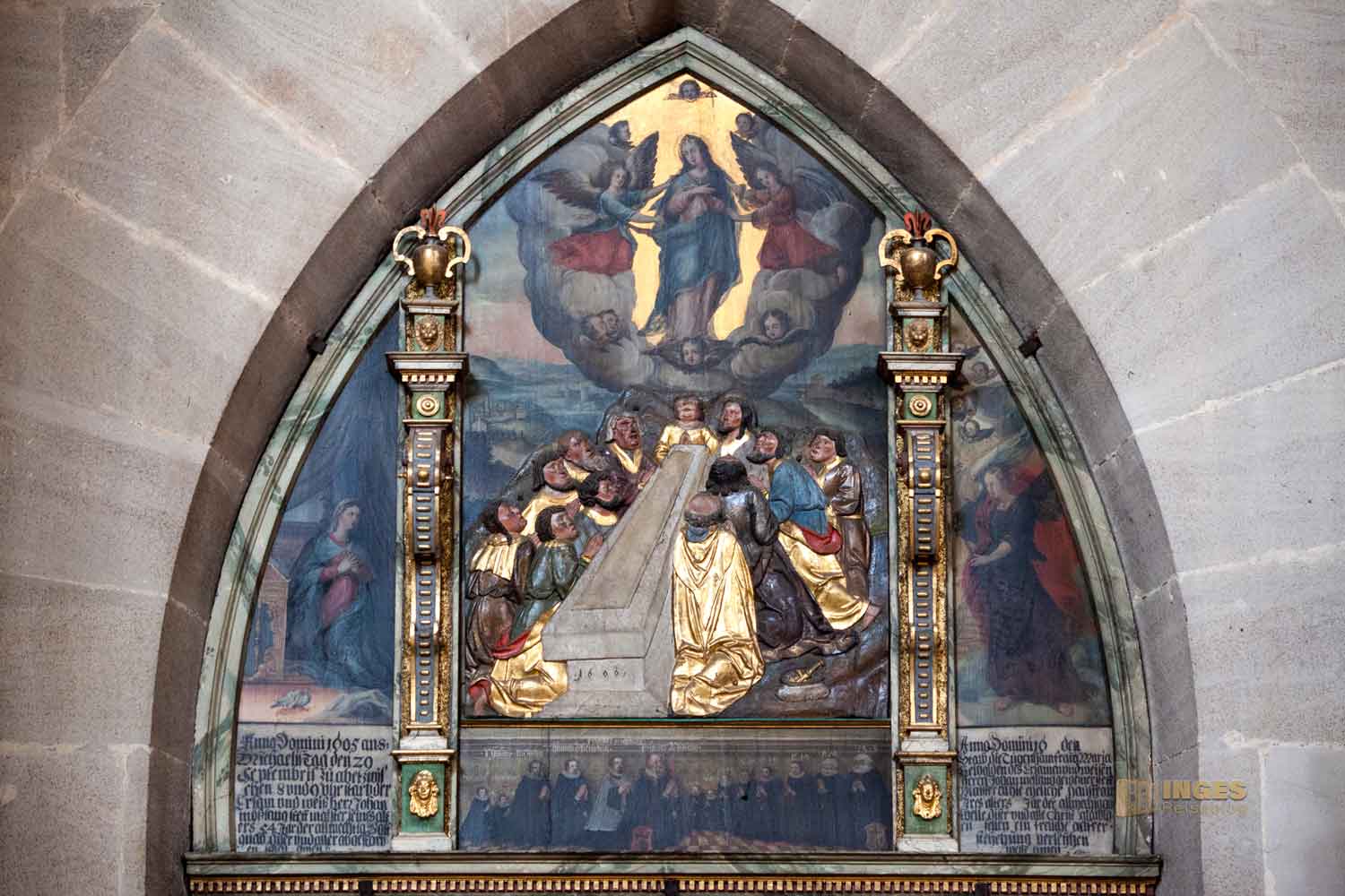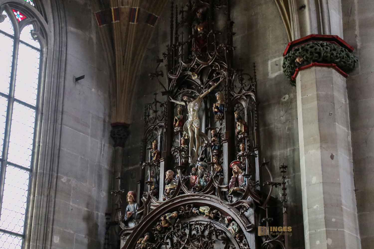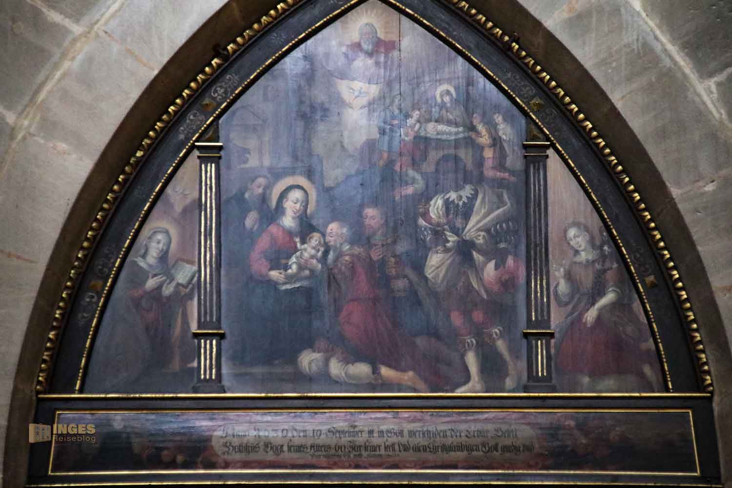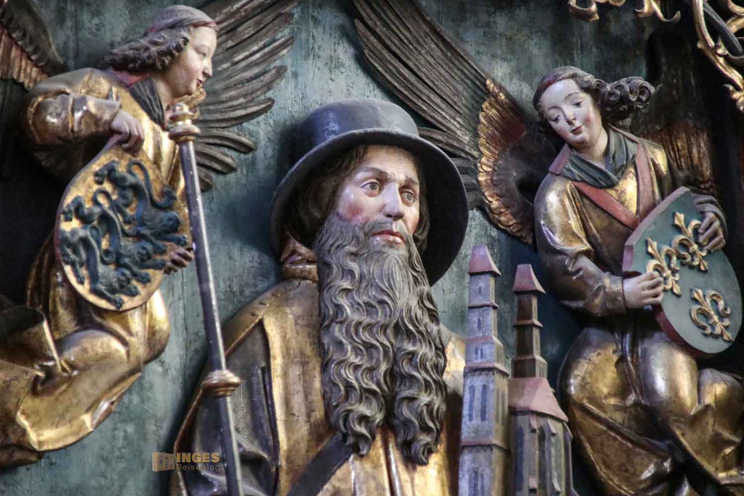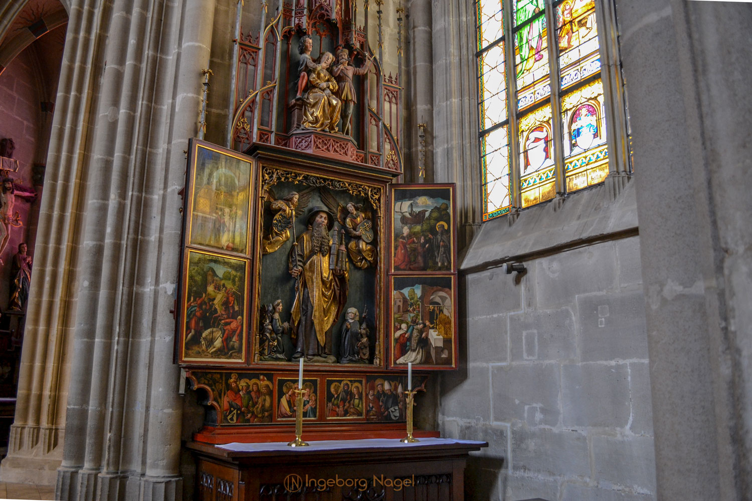 Der Stifter des Altars fand in Gmünd Zuflucht, als er vor der Pest aus Nürnberg floh. Ihr seht ihn und seine Frau links und rechts neben Sebaldus, der seine Nürnberger Kirche als Modell trägt. Der Altar zeigt Malereien Albrecht Dürers.