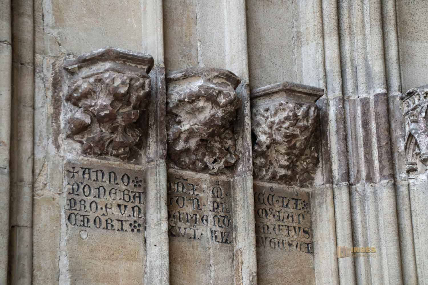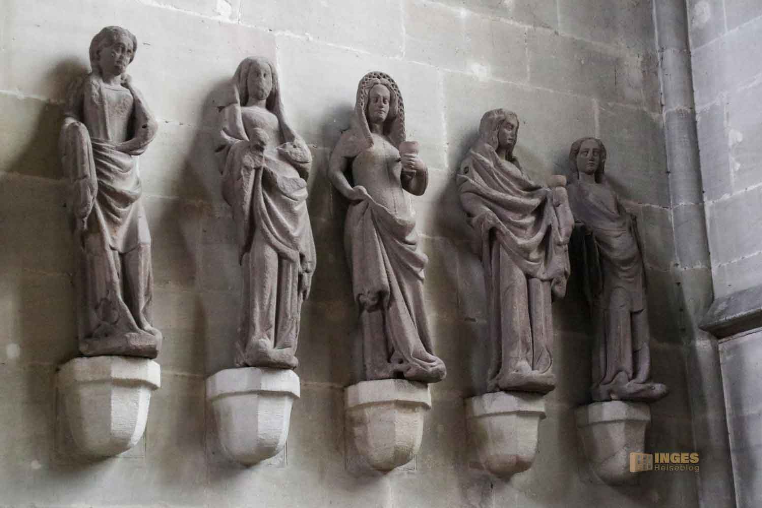 Vergesst bei diesem Portal nicht einen Blick nach links in die Portalnische zu werfen. Im ersten Moment wird man mit den gravierten Steinen nicht viel anfangen können. Wenn aber etwas mit "Anno ...." anfängt, dann stehen meist Grundsteinlegungen dahinter. So auch hier am Münster. Am 17. Juli 1351 wurde der erste Stein zum Bau des Chores gelegt.