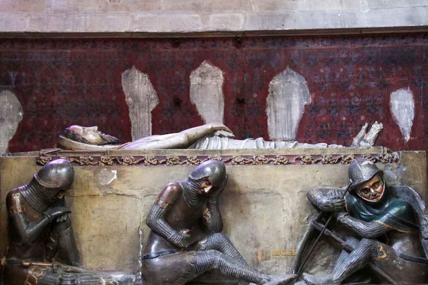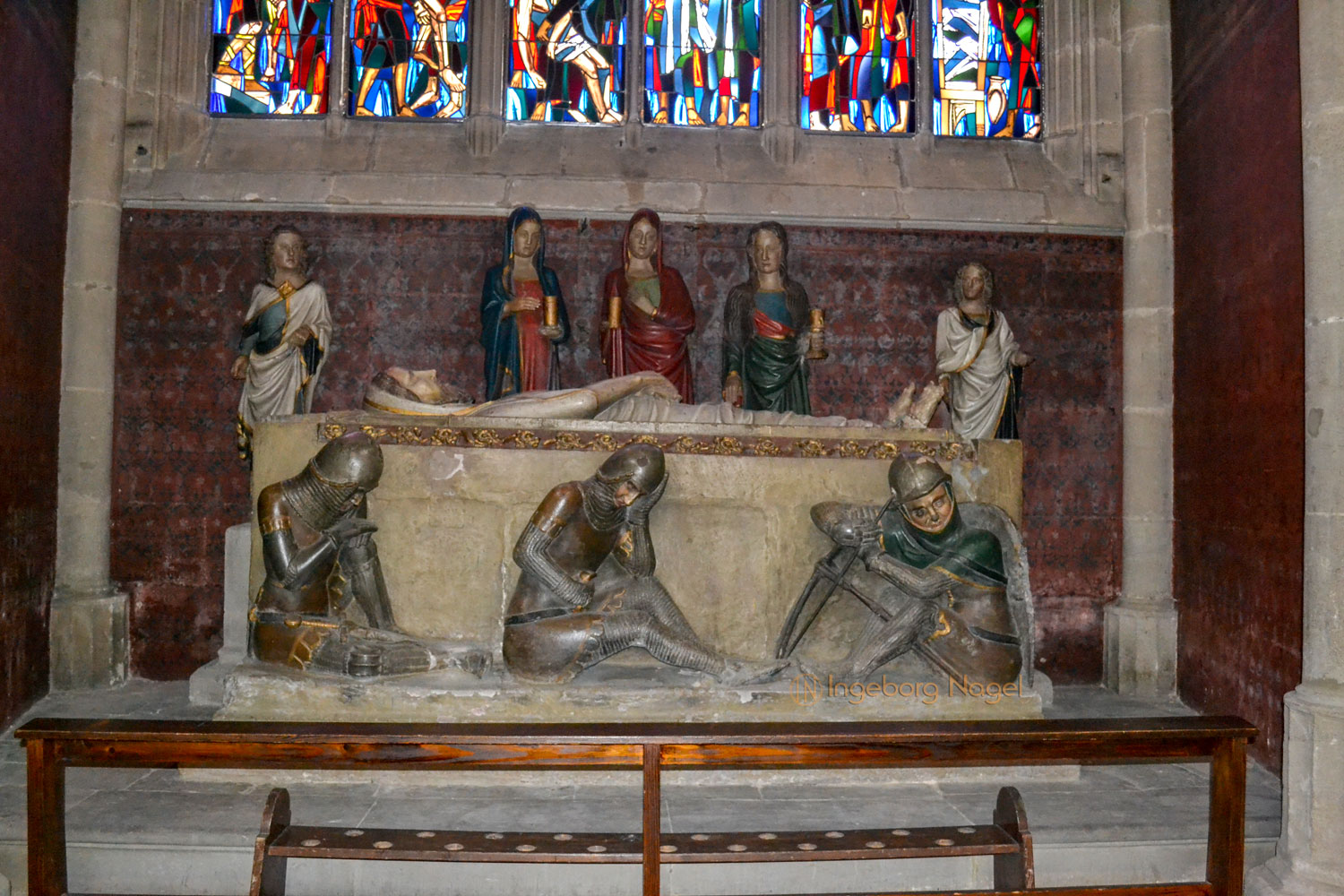 ist so etwa um 1350 entstanden und soll die zweitälteste weltweit noch erhaltene Darstellung dieser Trauergruppe sein. Drei Marien schauen auf den Leichnam Jesu, während die drei Wächter vor dem Grab schlafen. Man könnte mit der Darstellung und Ausstattung meinen, sie wären tatsächlich echt. Wenn ihr im Münster seid, werft am Heiligen Grab noch einen Blick rechts und links in den Altar. Meine Kamera hätte es euch mit dem Licht nicht gut genug wiedergegeben - die Secco Malereien von 1430 an den Seitenwänden.