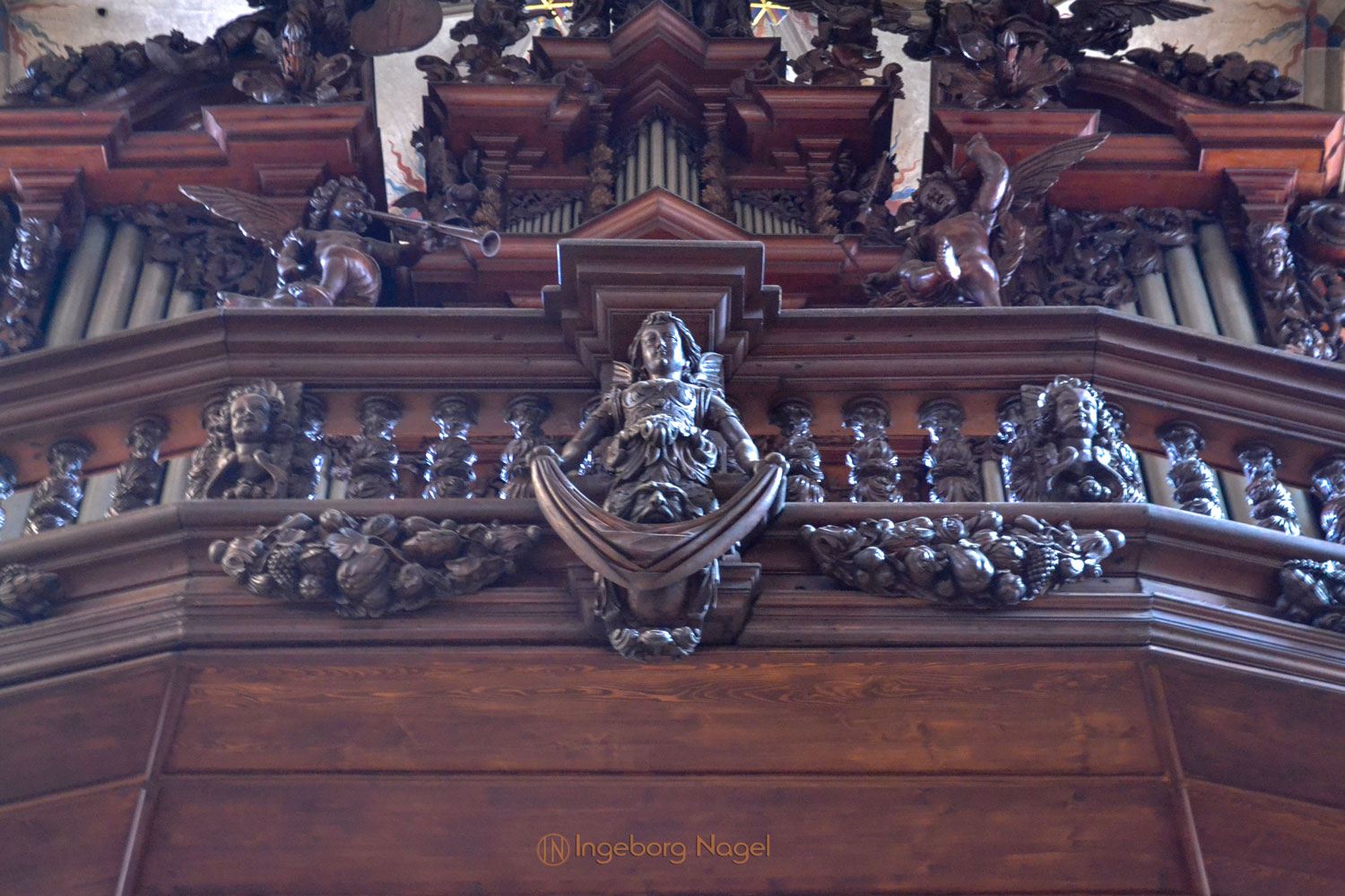Auch bei der Orgel hieß es, aus klein wird groß. 1544 fand dank einer Spende eine größere Orgel auf der Empore ihren Platz, der prunkvolle 11 Meter hohe Orgelprosekt wurde 1688 geschaffen. In den Folgejahren bekam die Kirche aber noch weitere neue Orgeln. Ich hab ja gerne die musizierende Begleiter der Orgeln im Visier, in der Wallfahrtskirche auf dem Schönenberg bei Ellwangen hatte ich gut zu tun 🙂 - aber hier im Münster, sie waren einfach zu weit weg, selbst für mein Teleobjektiv.