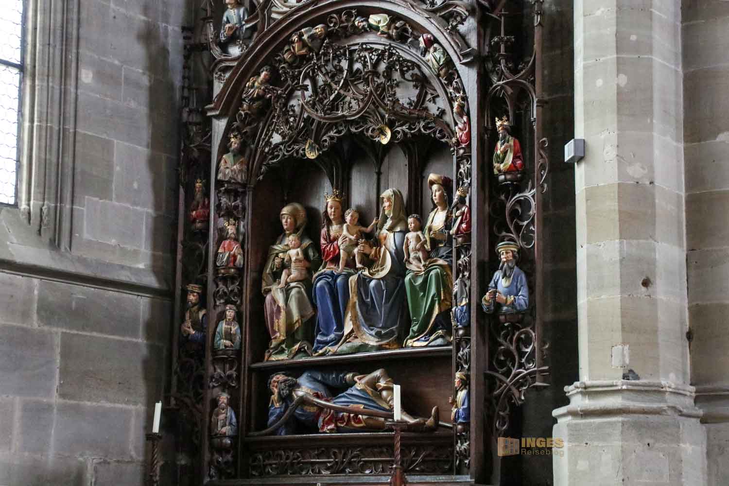 Nach 1497 ist sie entstanden, und keiner kann jetzt mehr sagen - ich hab keine Ahnung wer zur Familie und zur Verwandschaft Christi zählt. Denn hier am Altar treffen sich 40 Verwandte als geschnitzte Figuren auf engstem Raum. Eine Meisterleistung! Da man nicht in die Breite konnte, ging man halt in die Höhe.