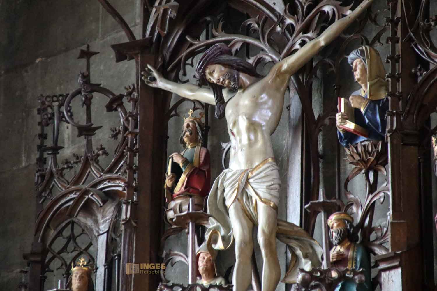 Da brauchts schon ein paar nähere Blicke. Im ersten Moment erscheint alles in dunklem Holz. Nicht so, wie es in vielen anderen Kirchen (z.B. in Schwäbisch Hall oder im Münster in Dinkelsbühl) ist - mit einem farbenfrohen Altarbild und vielen hellen Figuren. Die Figuren bekommt ihr hier im Münster auch, ganz außen der Hl. Bernhard und die Hl. Helena. Und wenn ihr ganz genau schaut (was vielleicht auf die Ferne etwas schwierig ist, da der Altarraum nicht betreten werden darf), dann erkennt ihr Szenen mit den sieben Sakramenten. Das beleuchtete Kreuz im Mittelpunkt des Hochaltars stammt aus der Spätgotik.