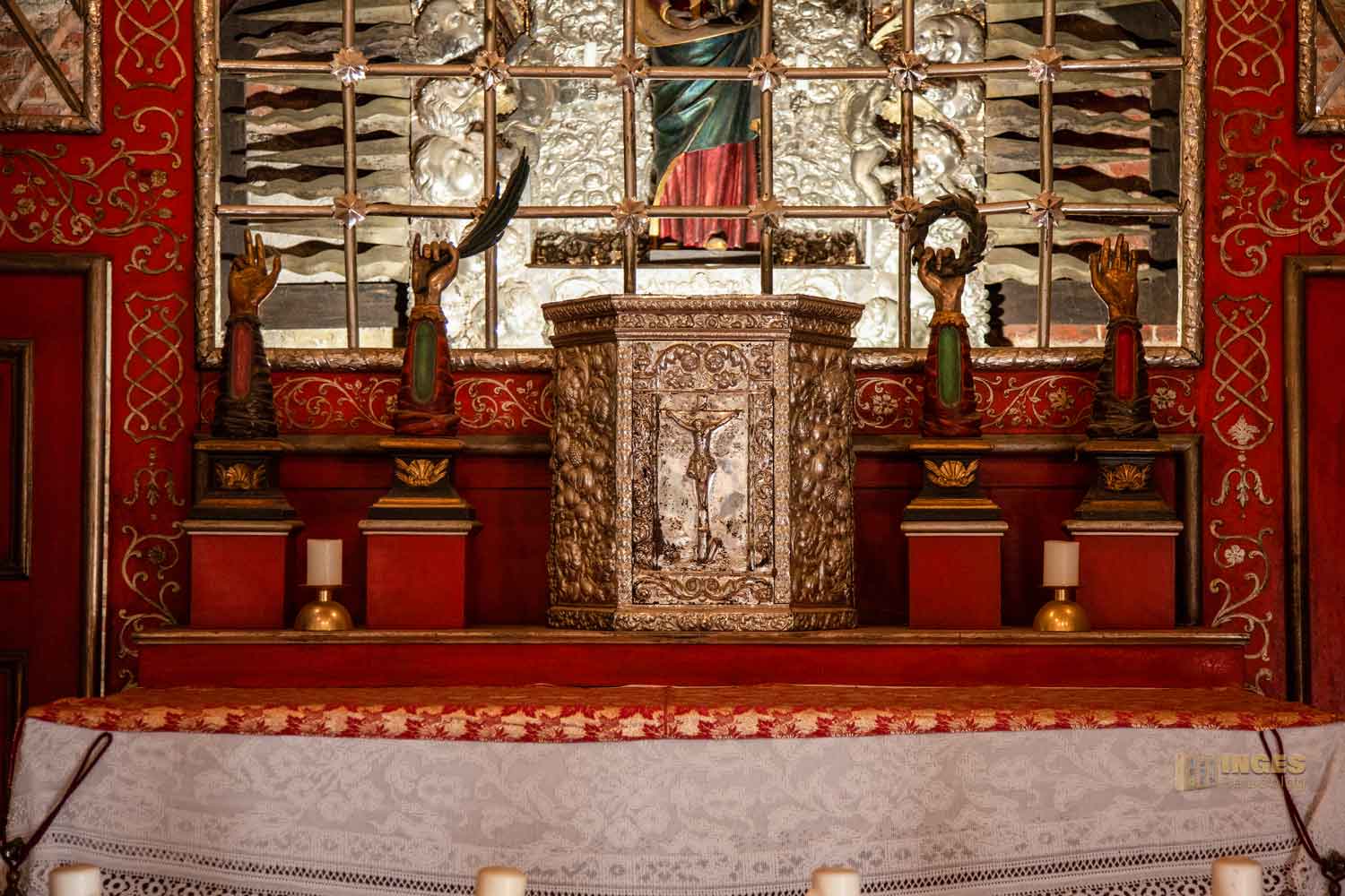 Überm Altar der Bezug zur Gönnerfamilie, die hier unter dem Heiligen Haus in einer Krypta ihre letzte Ruhestätte gefunden haben.