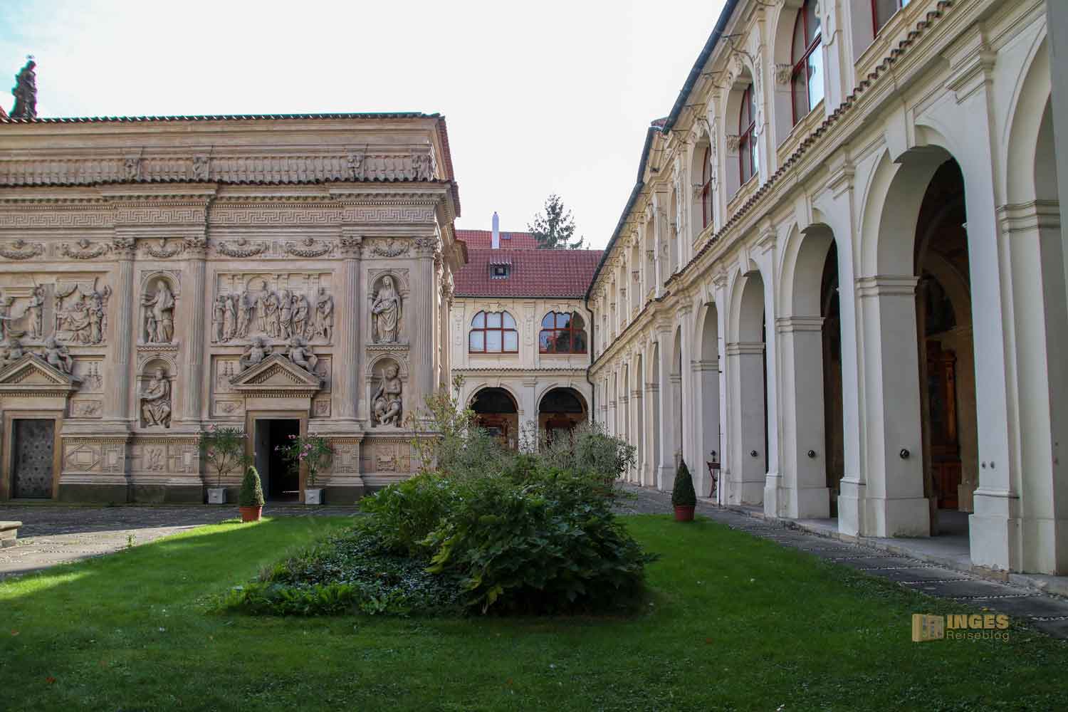 Den kleinen Stadtteil Hradschin über Prag sollte man nicht im Schnelldurchgang erkunden, und vor allem nicht auf die Prager Burg mit dem Veitsdom beschränken. Denn da warten noch ganz andere Schätze. Wir haben uns für den heutigen Tag ausschließlich nur den für ganz Tschechien wichtigen Wallfahrtsort, das Prager Loreto, und das Kloster Strahov vorgenommen, die dort eng beieinanderliegen. Dass diese Entscheidung richtig war, bemerkten wir schon, als wir nach der Kasse in den Innenbereich kamen. Die Dame, die für die Kontrolle der Tickets zuständig ist, hat uns auf alle Besichtigungsmöglichkeiten aufmerksam gemacht - und dabei auch auf das kleine Gebäude im Innenhof gezeigt.