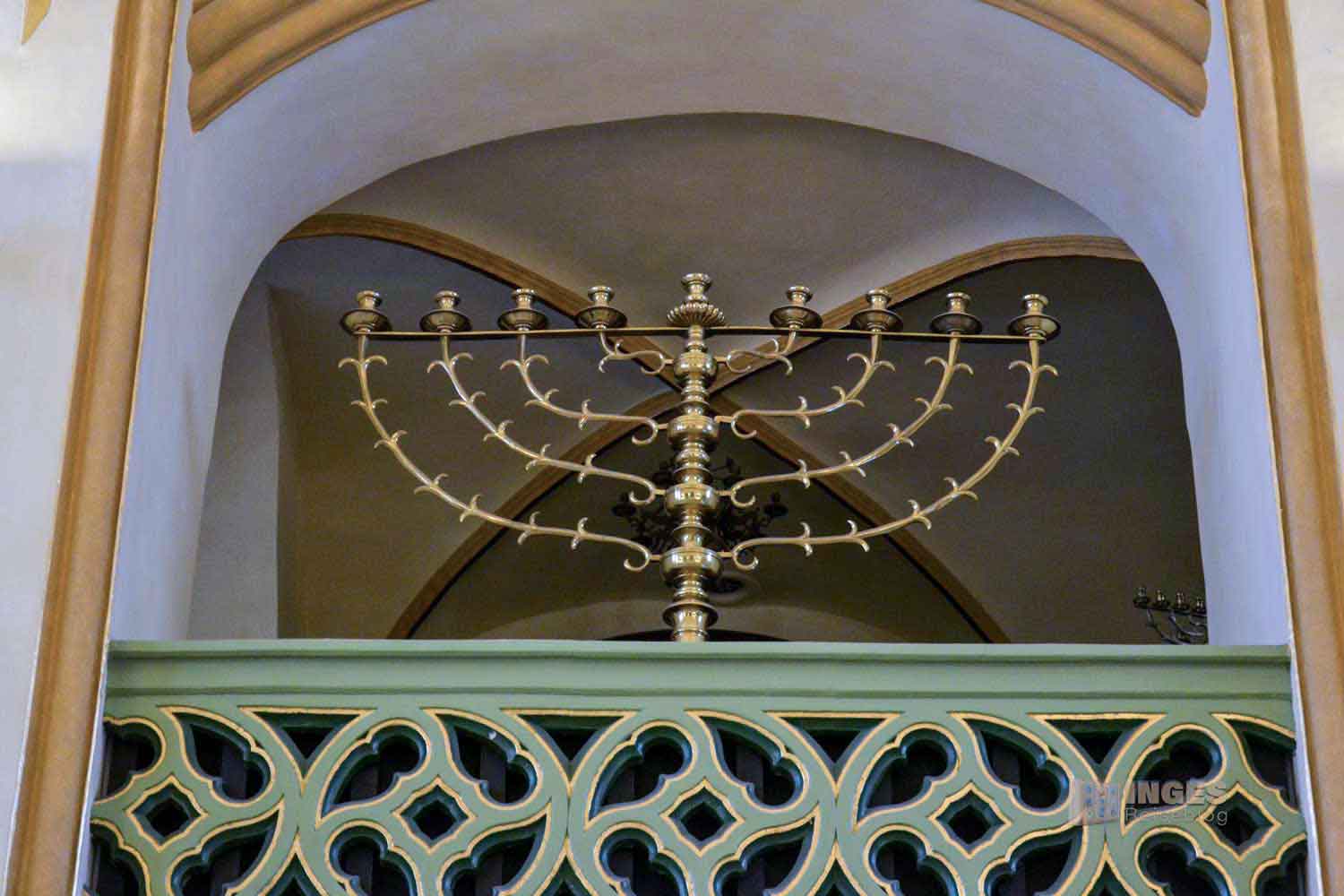 Meisel stattete die Synagoge reichhaltig mit Ritualgegenständen aus. Und auch eine Fahne, nach dem Vorbild der Altneu-Synagoge, wurde ihm von Rudolf II. genehmigt. Nach mehreren Umbauten brannte sie jedoch 1689 total nieder und wurde beim Neuaufbau verkleinert. Jetzt wird sie 'nur' noch von 14 Pfeilern getragen. Die Seitenschiffe bekamen Etagengalerien.