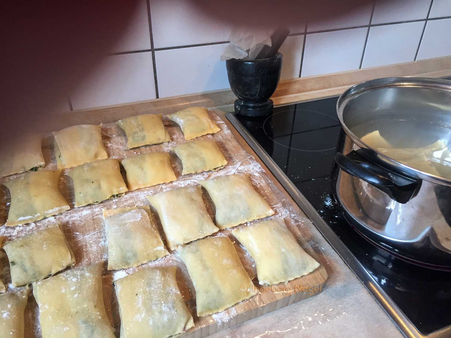 Unterstützung bekomme ich, egal was es betrifft, aber besonders im Kullinarischen Bereich von meinem Mann. Wir lieben beide gute Küche, experimentieren als Hobbyköche auch mal gerne bei Gerichten und so war die Arbeitsteilung an dem Tag auch geregelt. Ich bereite zu, mein Mann jagt sie durchs leicht siedende Wasser.