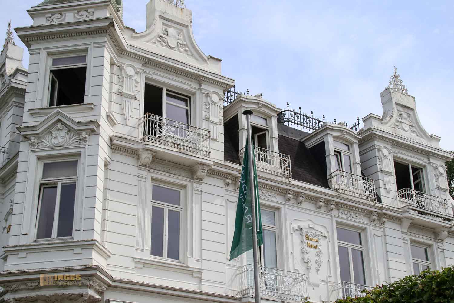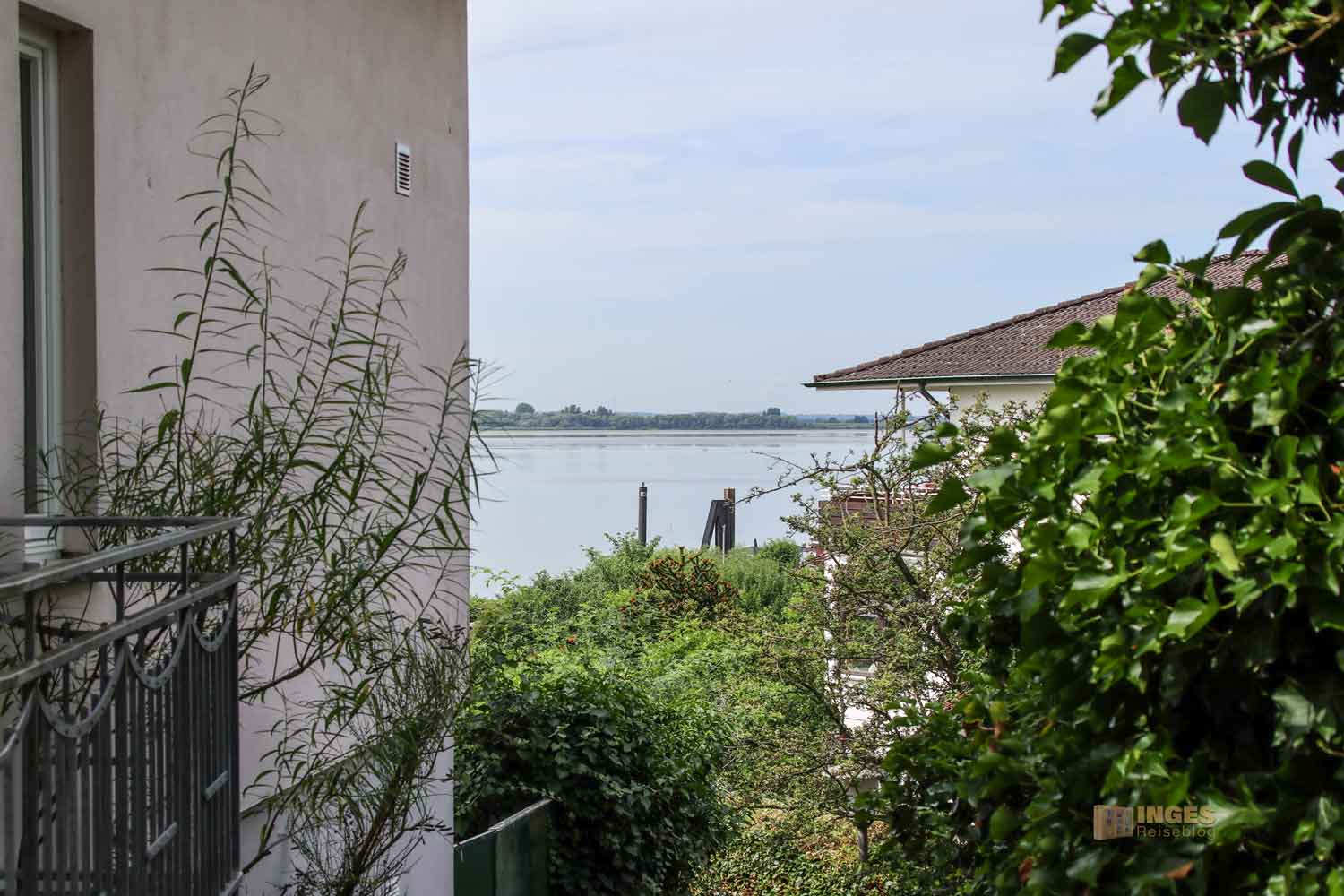 Wir waren inzwischen unten am Strandweg angekommen, wo ganz in weiß das Strandhotel seinen Gästen einen grandiosen Blick auf die Elbe bietet. Ein herrlicher Strand lockt entlang der Elbe. Was weniger verlockend hier in erster Reihe ist, ist das Elbehochwasser.