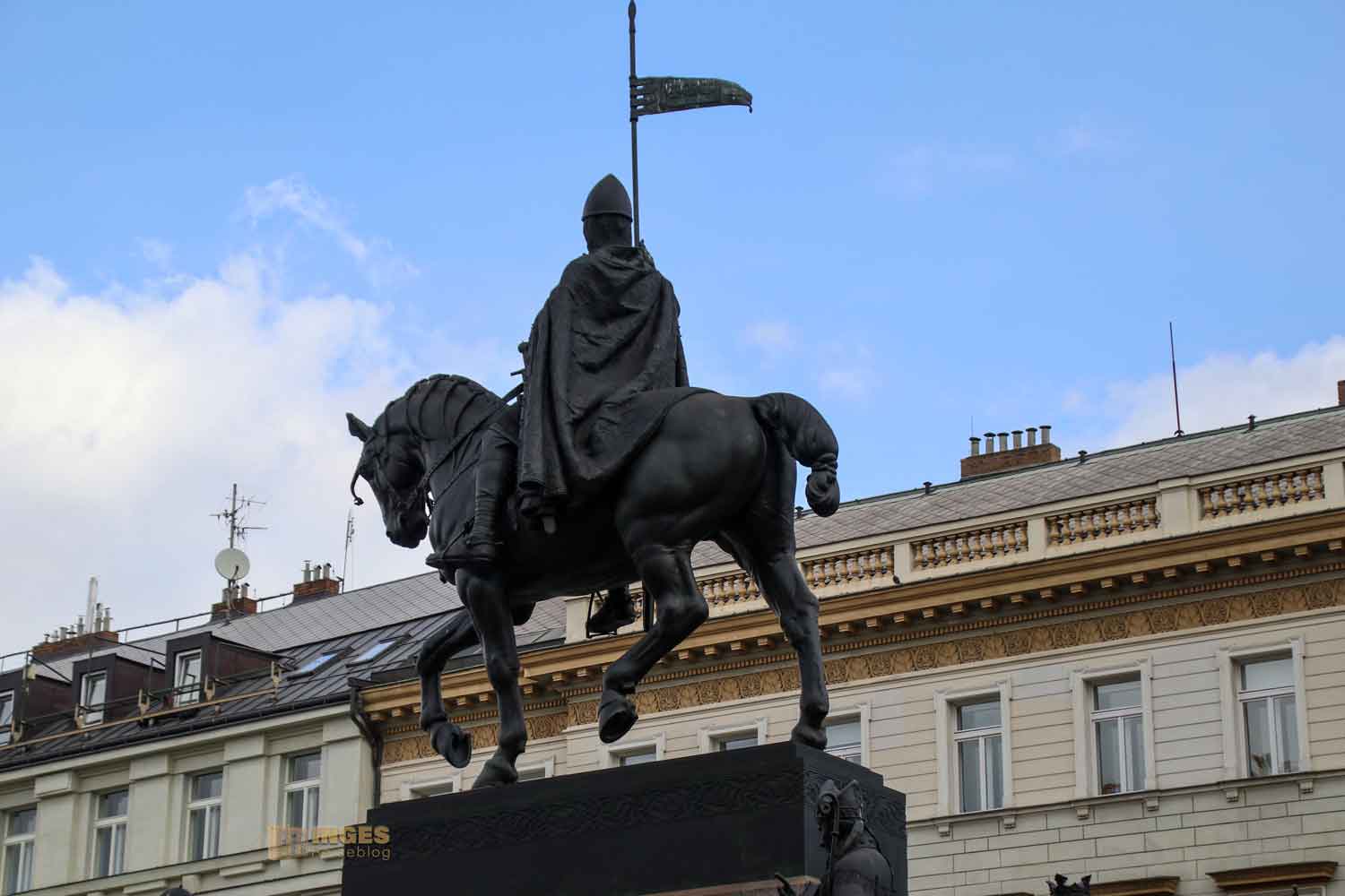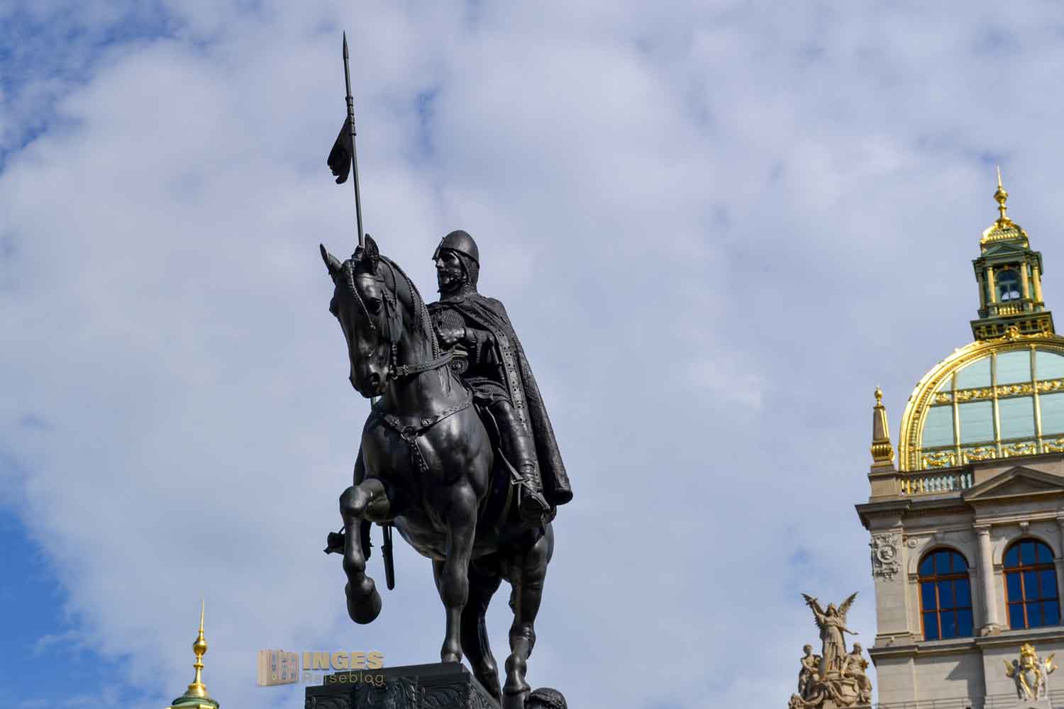 an dem seit er da über den Wenzelsplatz blickt, der Zahn der Zeit auch nicht spurlos vorbei gegangen ist. 2005 musste er restauriert werden, und erstrahlt jetzt wieder würdevoll in vollem Glanz.