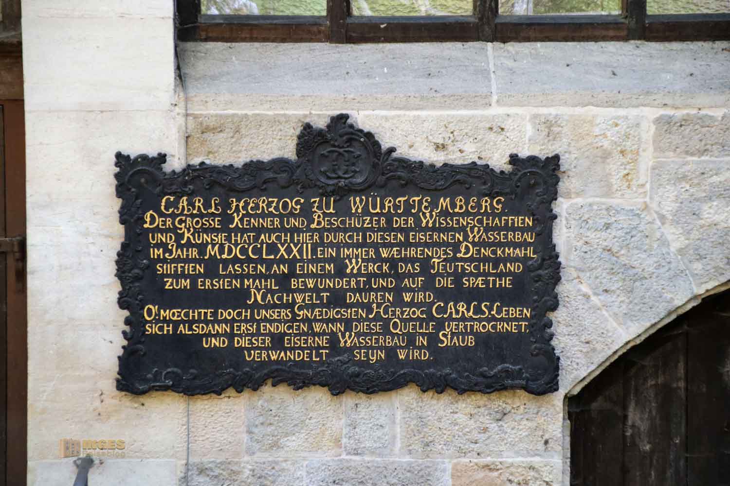 Wohl immer wenns gut läuft, kommen die Rückschläge. So war es auch beim Hüttenwerk mit dem 30-jährigen Krieg. Und Mitte des 18. Jahrhunderts wurde das Holz knapp. So nach dem Motto 'wenn du es nicht im eigenen Wald hast, dann holen wir es aus einem Anderen' ging es Ende des 18. Jahrhunderts wieder steil bergauf. Der Königsbronner, der dafür mit verantwortlich war - Johann Georg Blezinger - war aber geradeso ein schlauer Kopf wie der Abt des Klosters. Mit seiner Idee und Umsetzung erreichte der Pächter der Eisenwerke ein Aufsehen weit über Deutschland hinaus, denn er ließ unmittelbar am Brenztopf 1772 einen sogenannten "Eisernen Wasserkasten" bauen. Kein geringerer als Herzog Carl Eugen kam zur Einweihung des Bauwerks nach Königsbronn und Blezinger widmete ihm dafür eine Schmucktafel am Wasserkasten.
